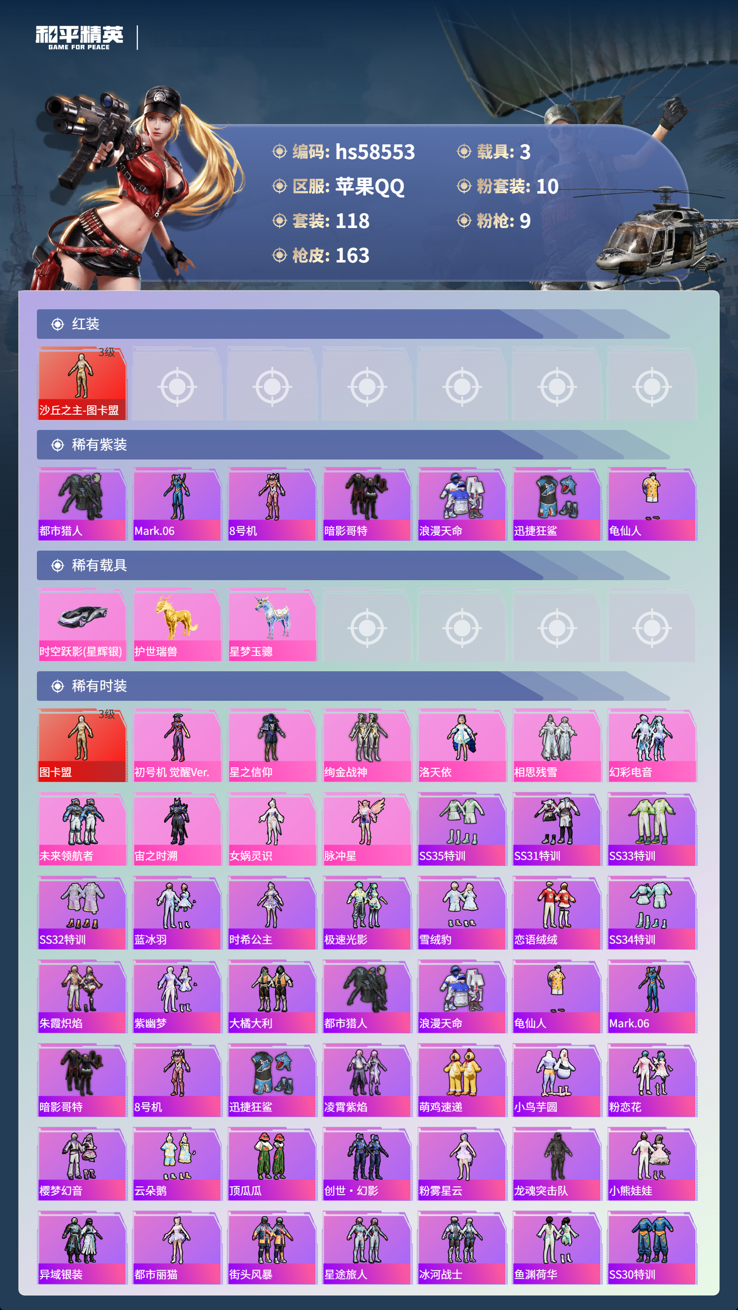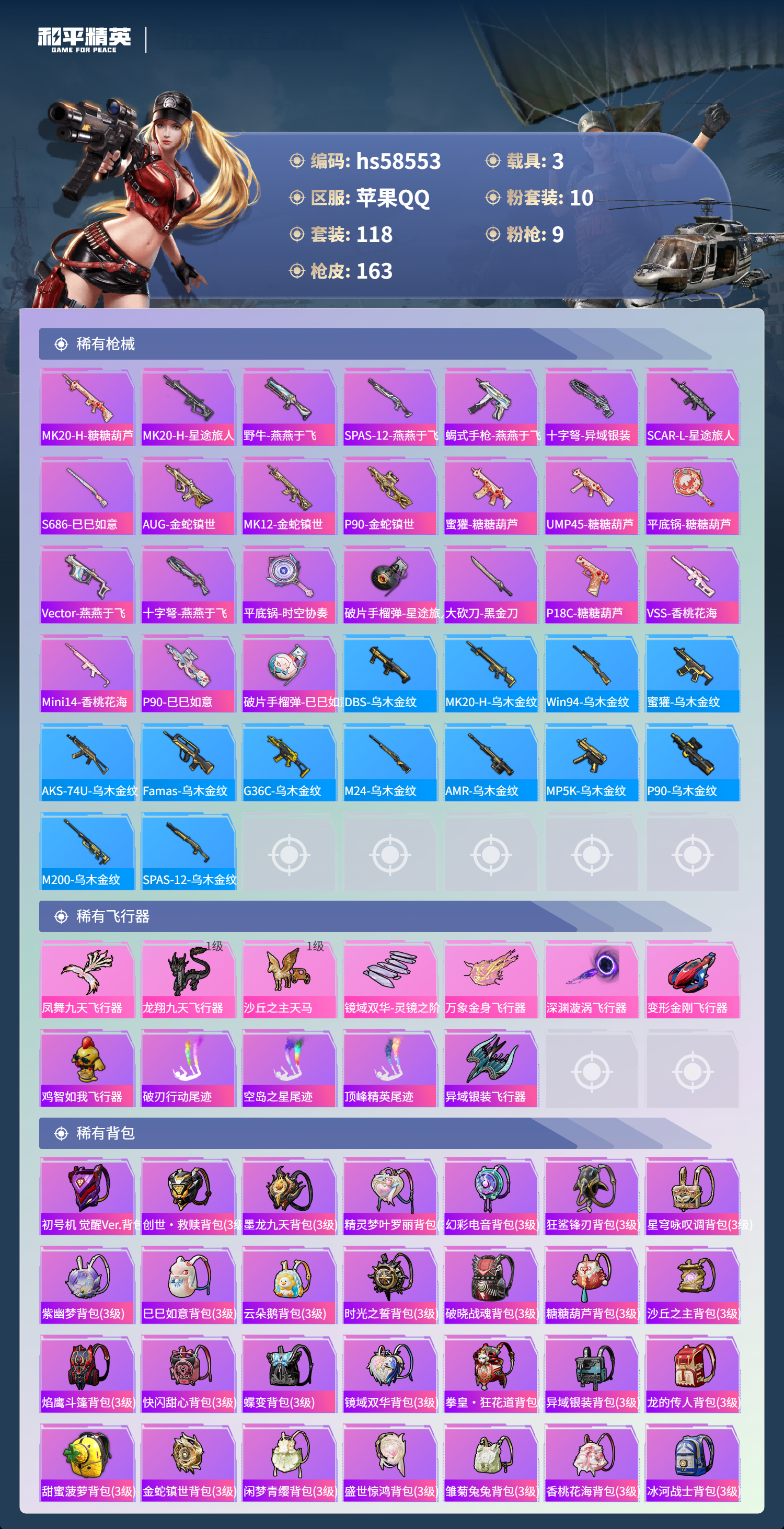 hs58553 苹果手q-10王牌印记-1红装-10粉装-9特效呛-3载具-60654热力值-118套装-163呛皮-1卓越印记-1传奇印记【1红装】沙丘之主-图卡盟/3级【10粉装】套装-未来领航者套装-相思残雪角色-女娲灵识套装-幻彩电音角色-脉冲星角色-洛天依套装-绚金战神角色-宙之时溯角色-初号机 觉醒ver.套装-星之信仰【9特效呛】kar98k-巳巳如意/5级
