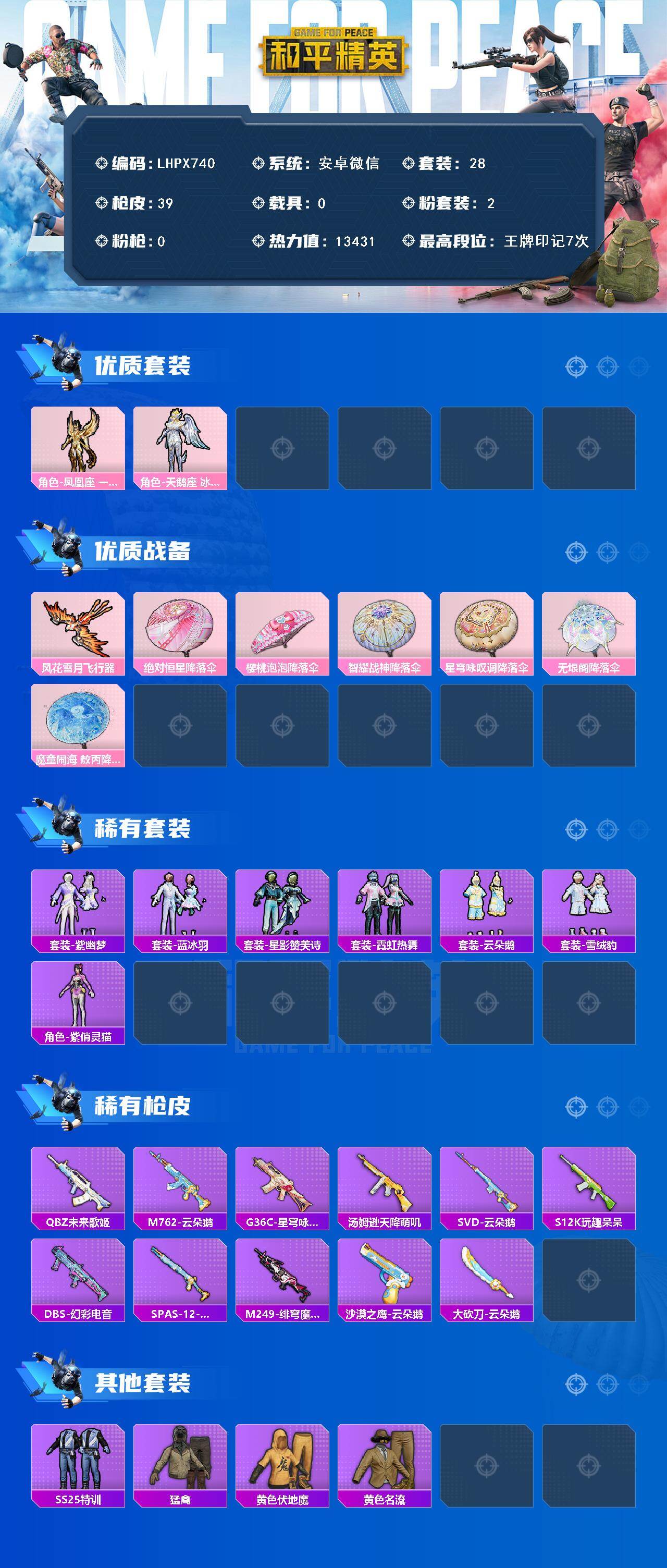 0载具-28套装-39呛皮-【特价出售/店主推荐】安卓 微信-2粉装-0特效呛-0载具-2粉色飞行器-13431热力值-7王牌印记-28套装-39呛皮 【粉色套装】:角色-凤凰座 一辉,角色-天鹅座 冰河 【粉色飞行器】:风花雪月飞行器 【粉色降落伞】:绝对恒星降落伞,樱桃泡泡降落伞,智耀战神降落伞,星穹咏叹调降落伞,无垠阁降