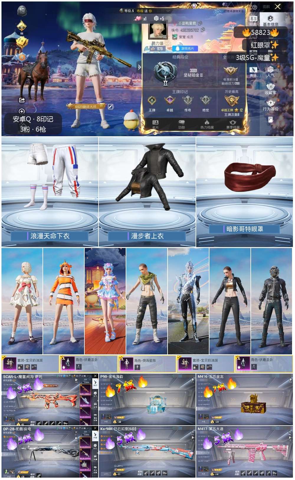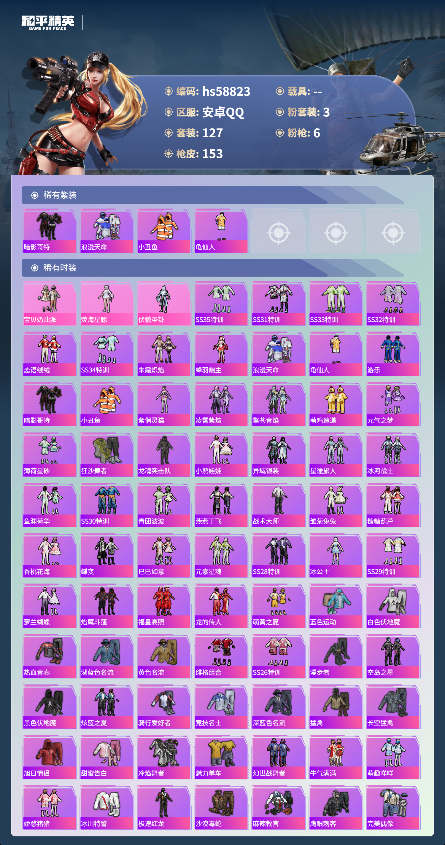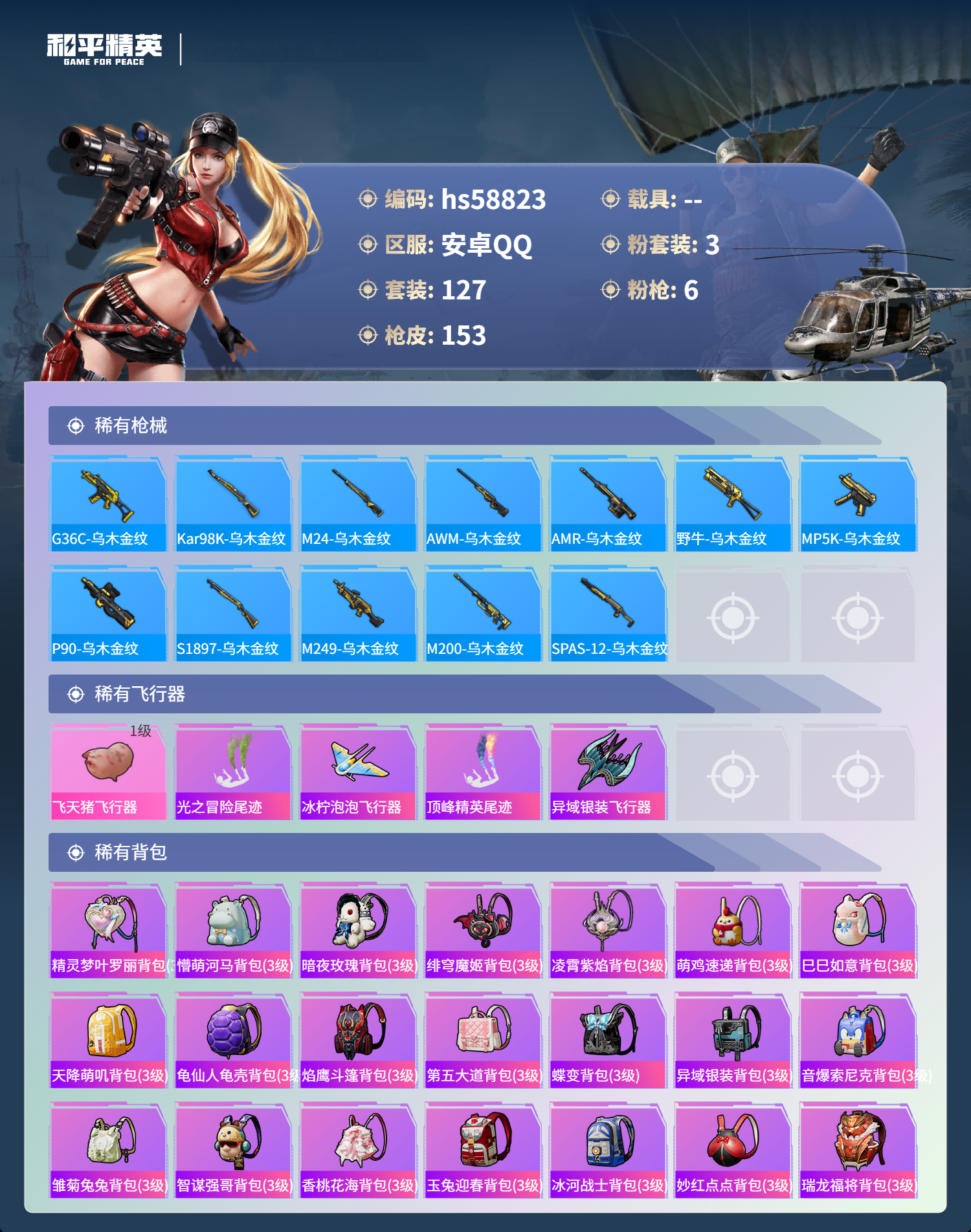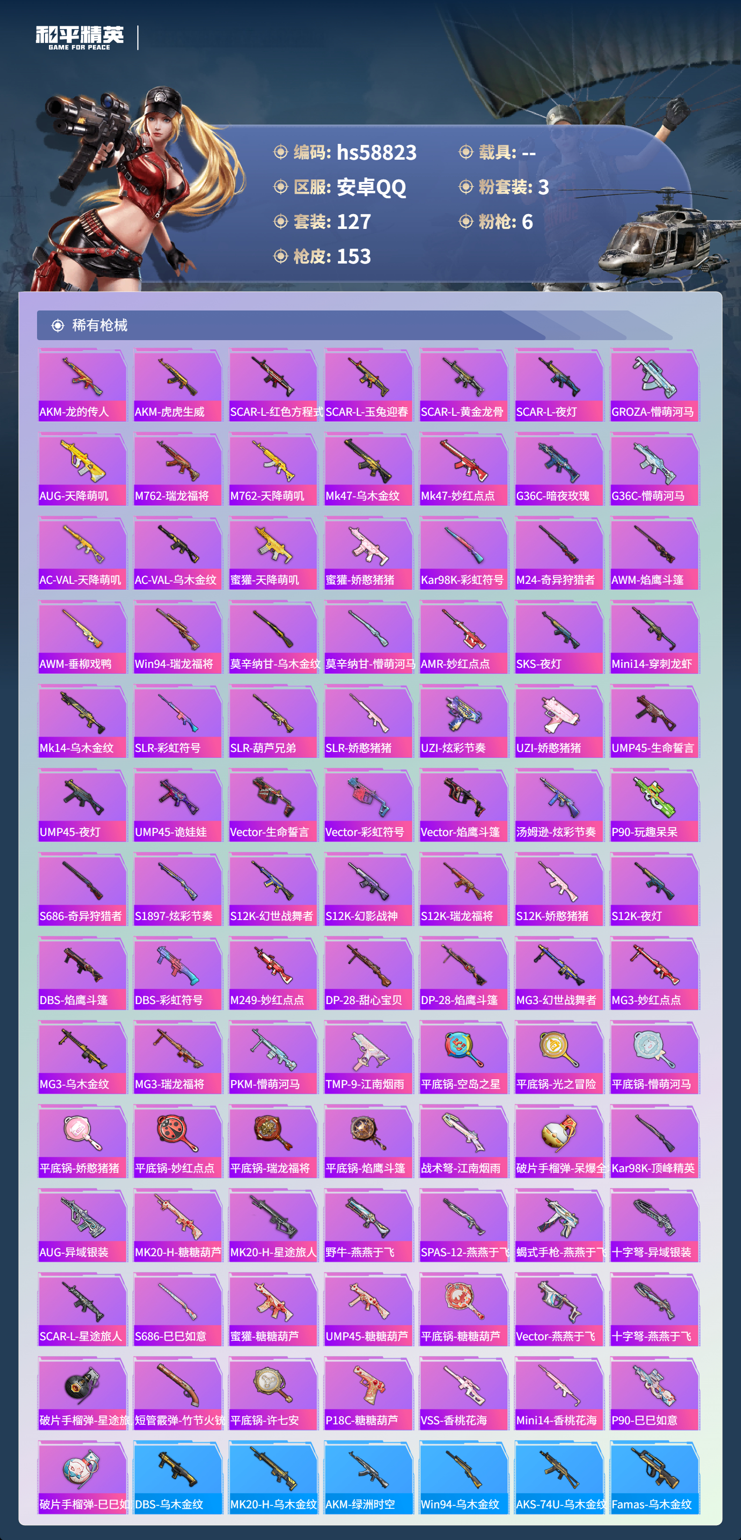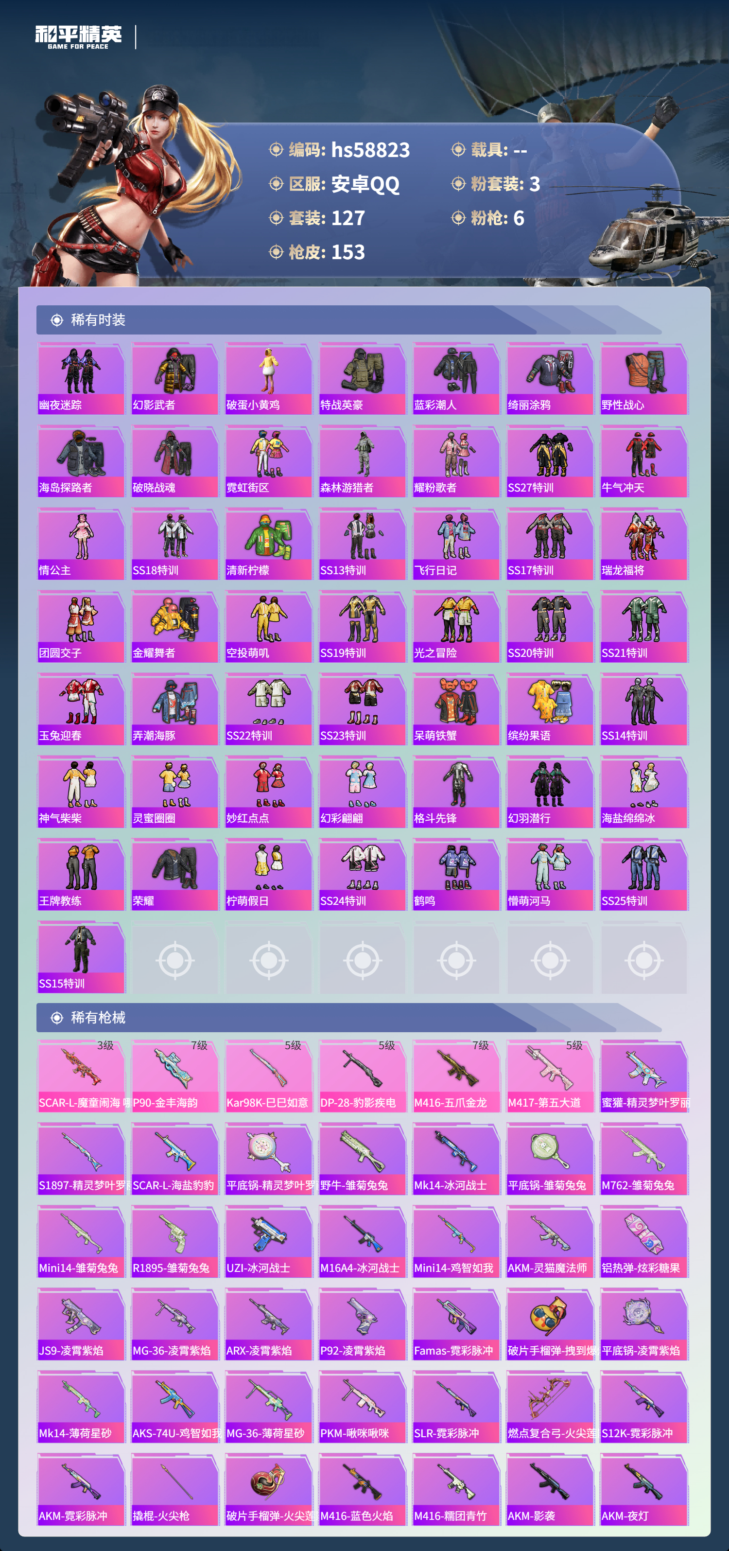 0载具-127套装-153呛皮-hs58823 安卓手q-8王牌印记-3粉装-6特效呛-48883热力值-127套装-153呛皮-1卓越印记【3粉装】套装-宝贝奶油派角色-伏羲圣卦角色-荧海星豚【6特效呛】kar98k-巳巳如意/5级dp-28-豹影疾电/5级m417-第五大道/5级m416-五爪金龙/7级scar-l-魔童闹海 哪吒/3级p90-金丰海韵/7级【4稀有紫装】暗影哥特浪漫天命小丑鱼龟仙人