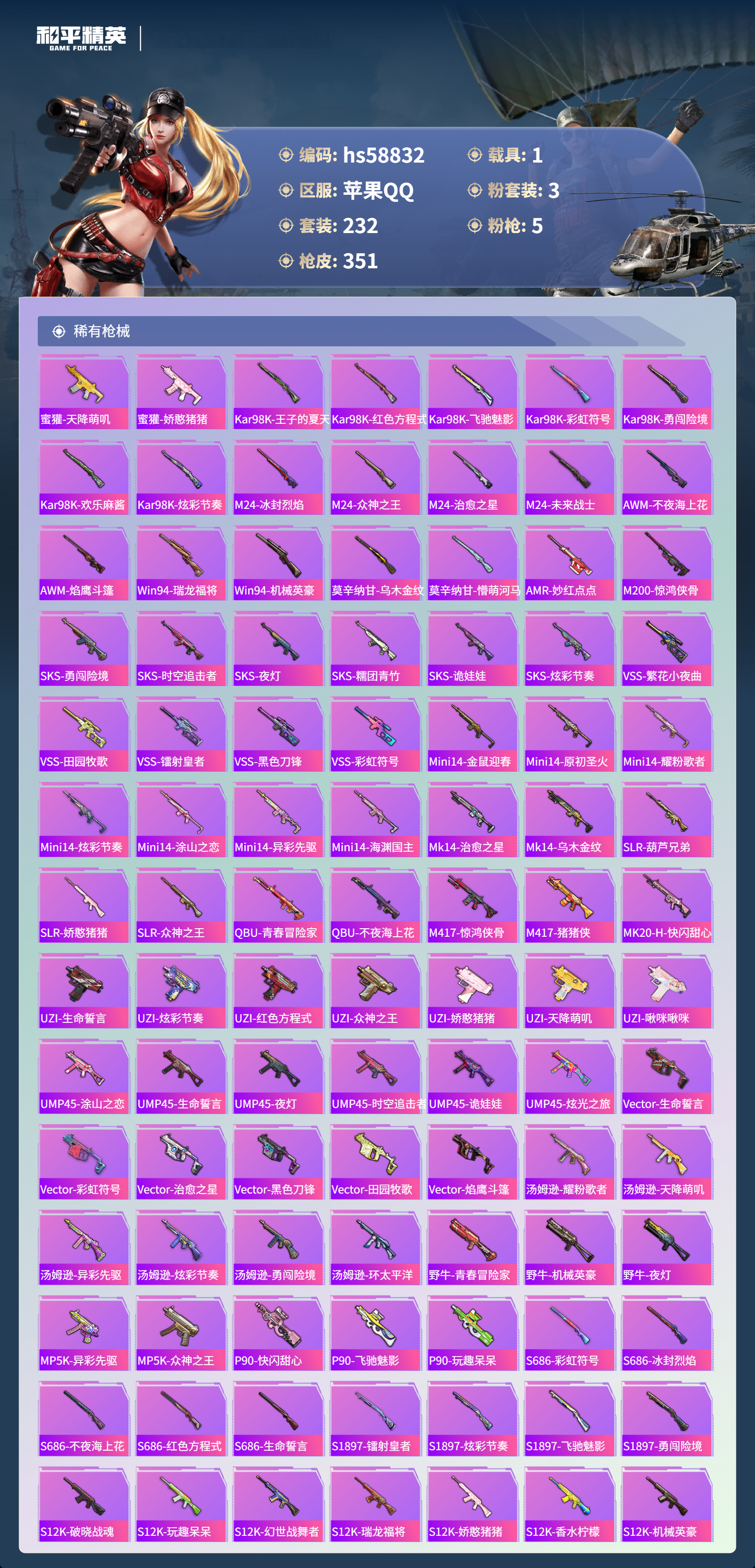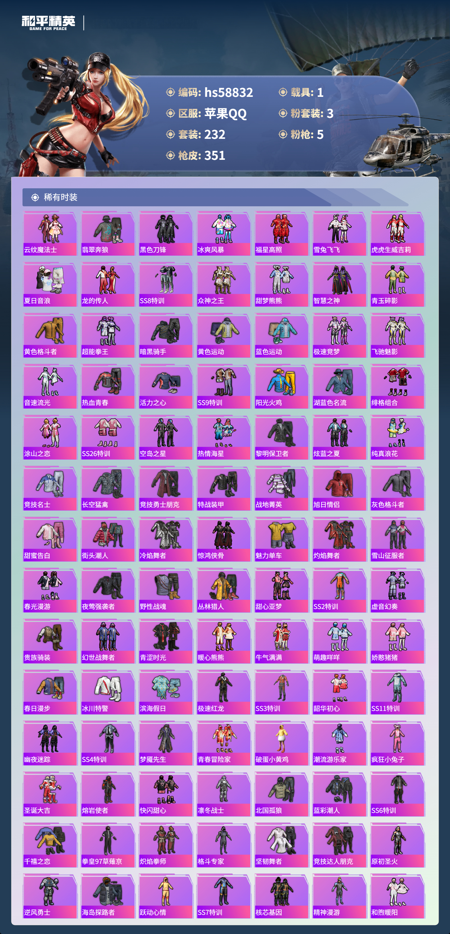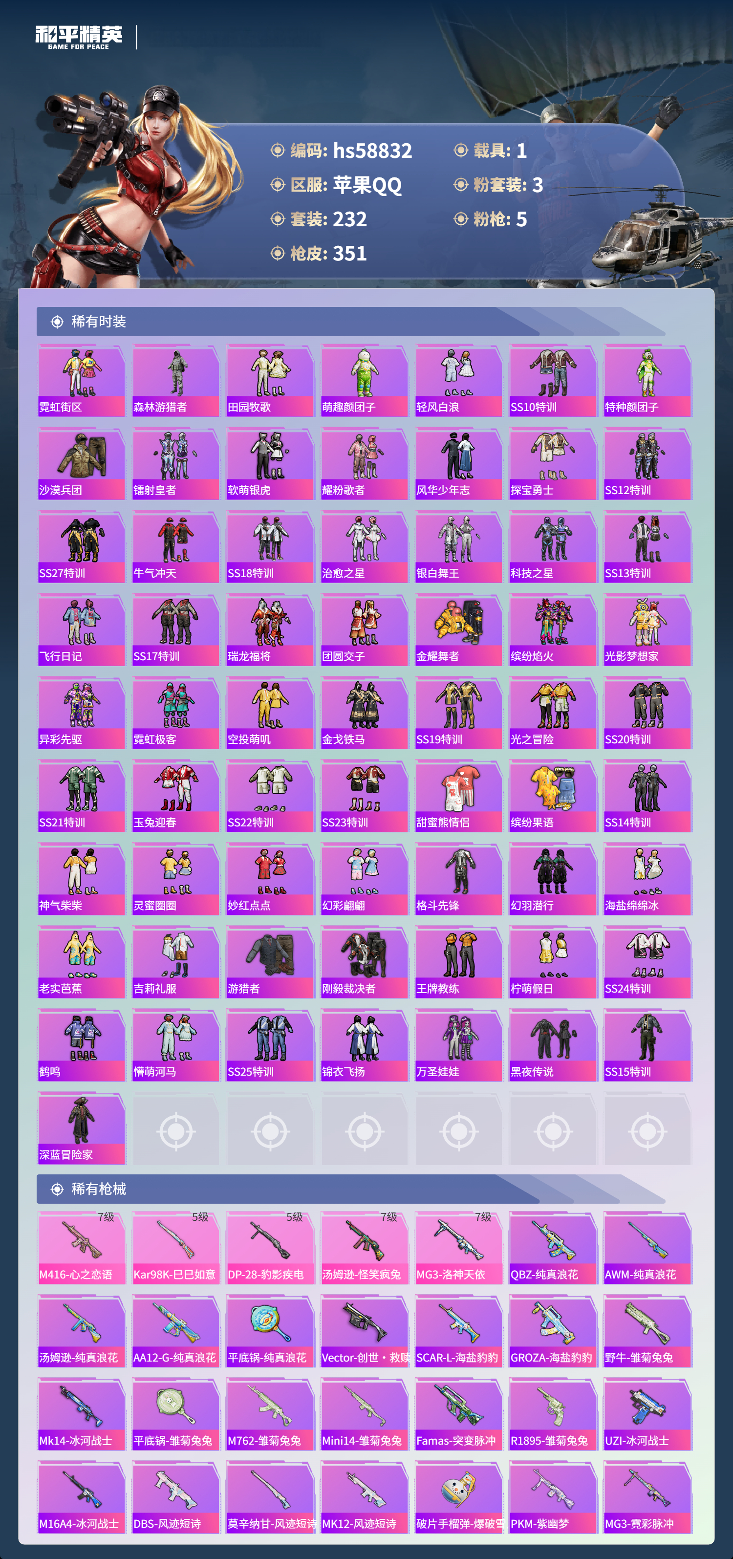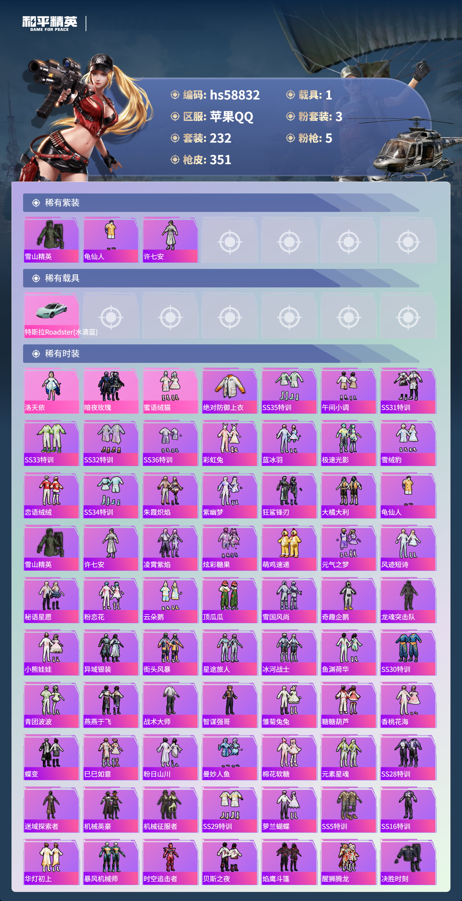 1载具-232套装-351呛皮-hs58832 苹果手q-26王牌印记-3粉装-5特效呛-1载具-热力值-232套装-351呛皮-4卓越印记-1传奇印记【3粉装】套装-蜜语绒猫角色-洛天依套装-暗夜玫瑰【5特效呛】mg3-洛神天依/7级dp-28-豹影疾电/5级kar98k-巳巳如意/5级m416-心之恋语/7级汤姆逊-怪笑疯兔/7级【4稀有紫装】巡查衣雪山精英龟仙人许七安【1稀有载具】特斯