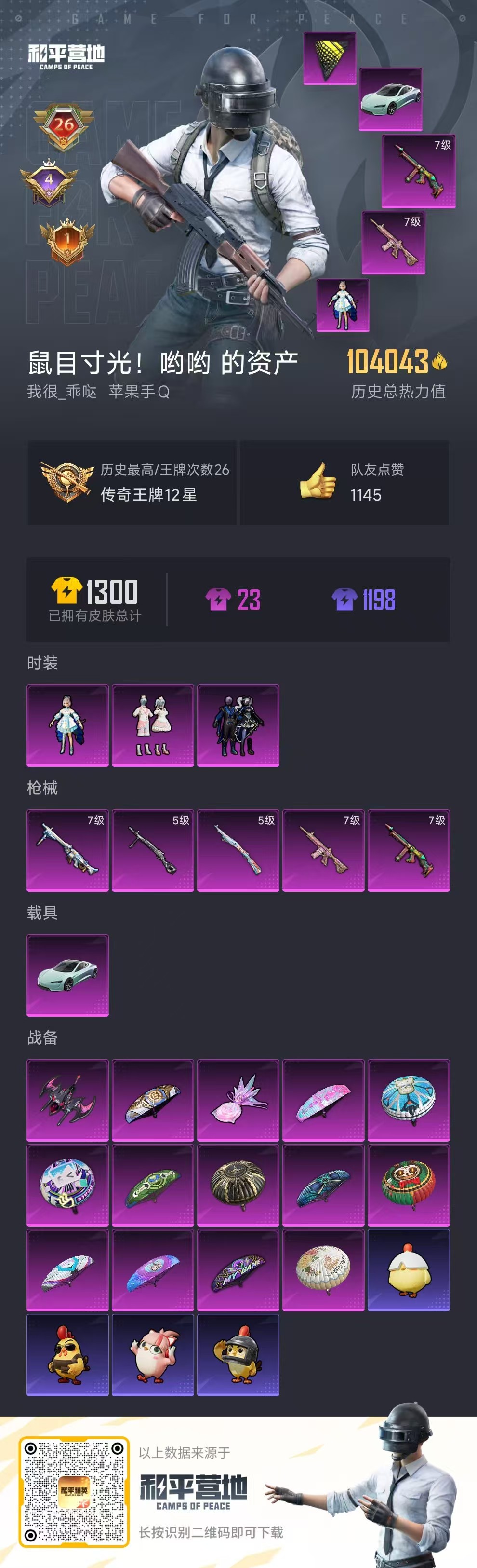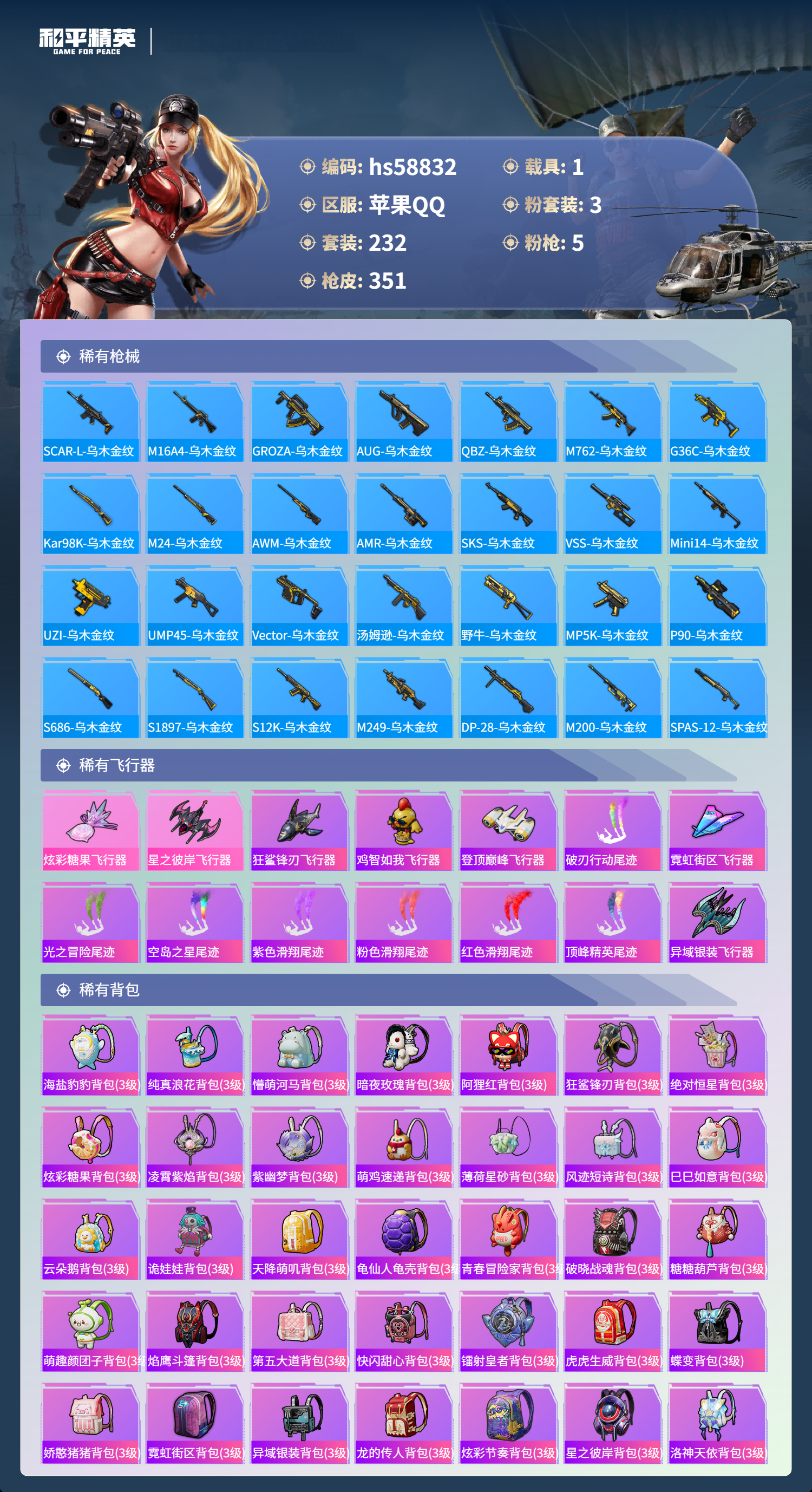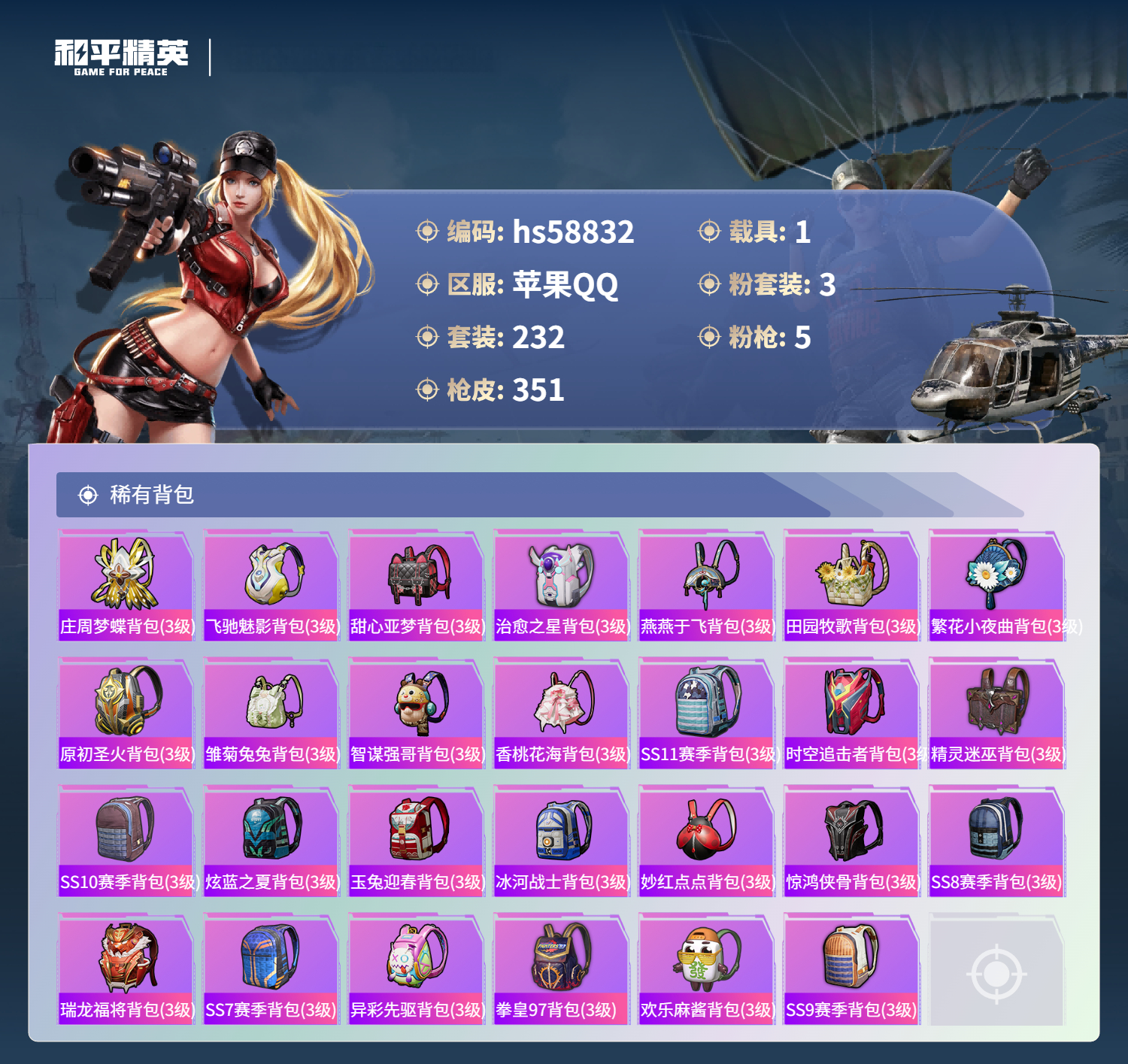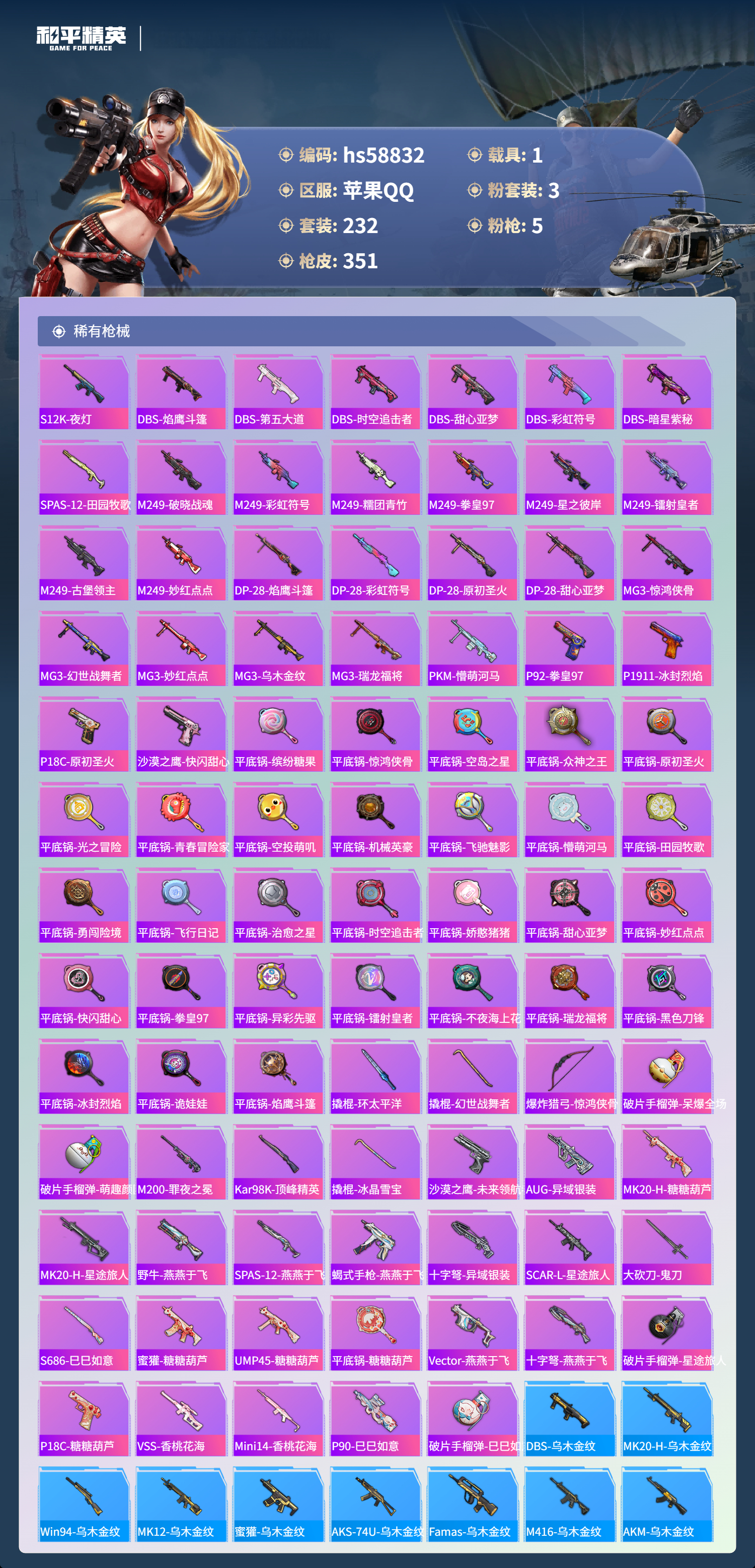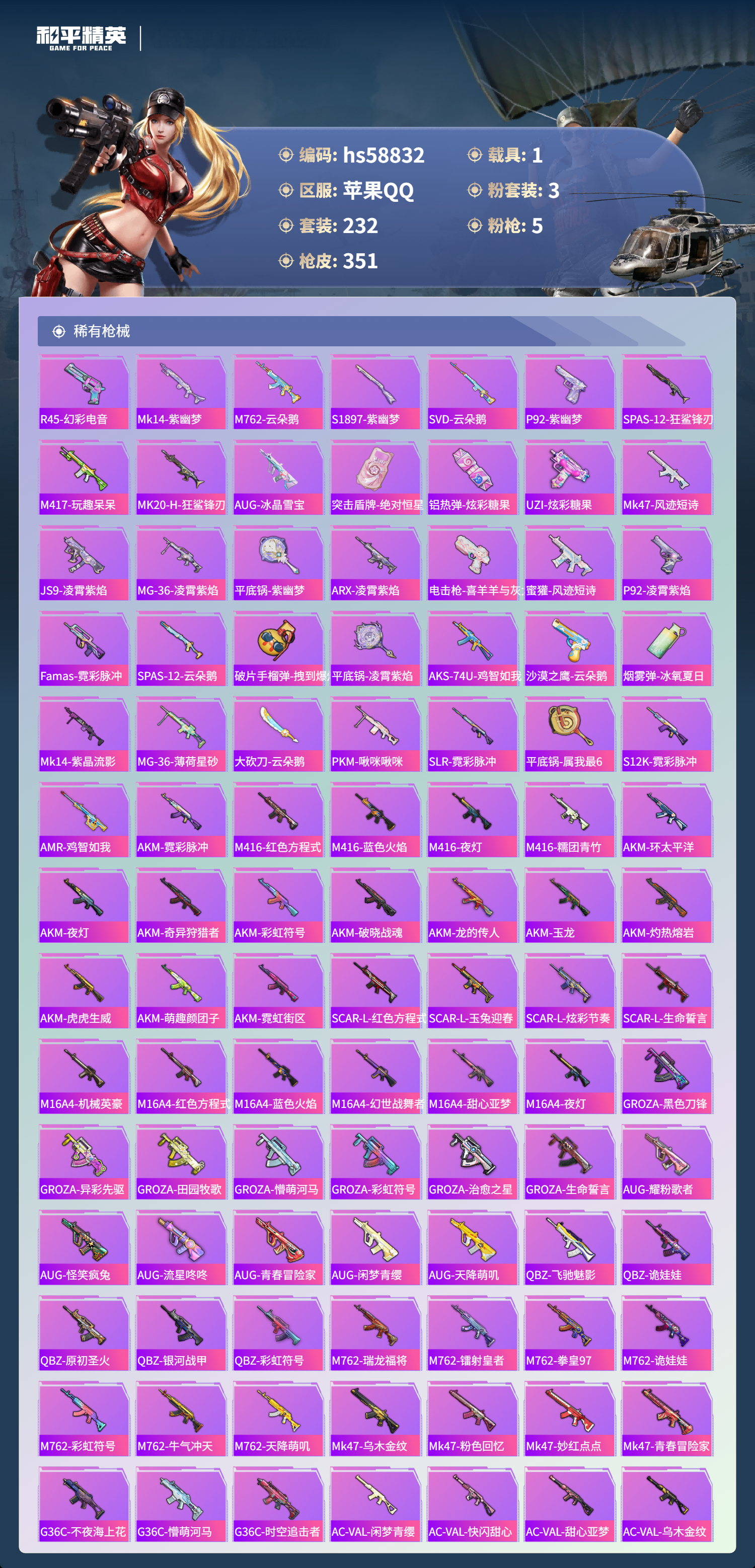 1载具-232套装-351呛皮-hs58832 苹果手q-26王牌印记-3粉装-5特效呛-1载具-热力值-232套装-351呛皮-4卓越印记-1传奇印记【3粉装】套装-蜜语绒猫角色-洛天依套装-暗夜玫瑰【5特效呛】mg3-洛神天依/7级dp-28-豹影疾电/5级kar98k-巳巳如意/5级m416-心之恋语/7级汤姆逊-怪笑疯兔/7级【4稀有紫装】巡查衣雪山精英龟仙人许七安【1稀有载具】特斯