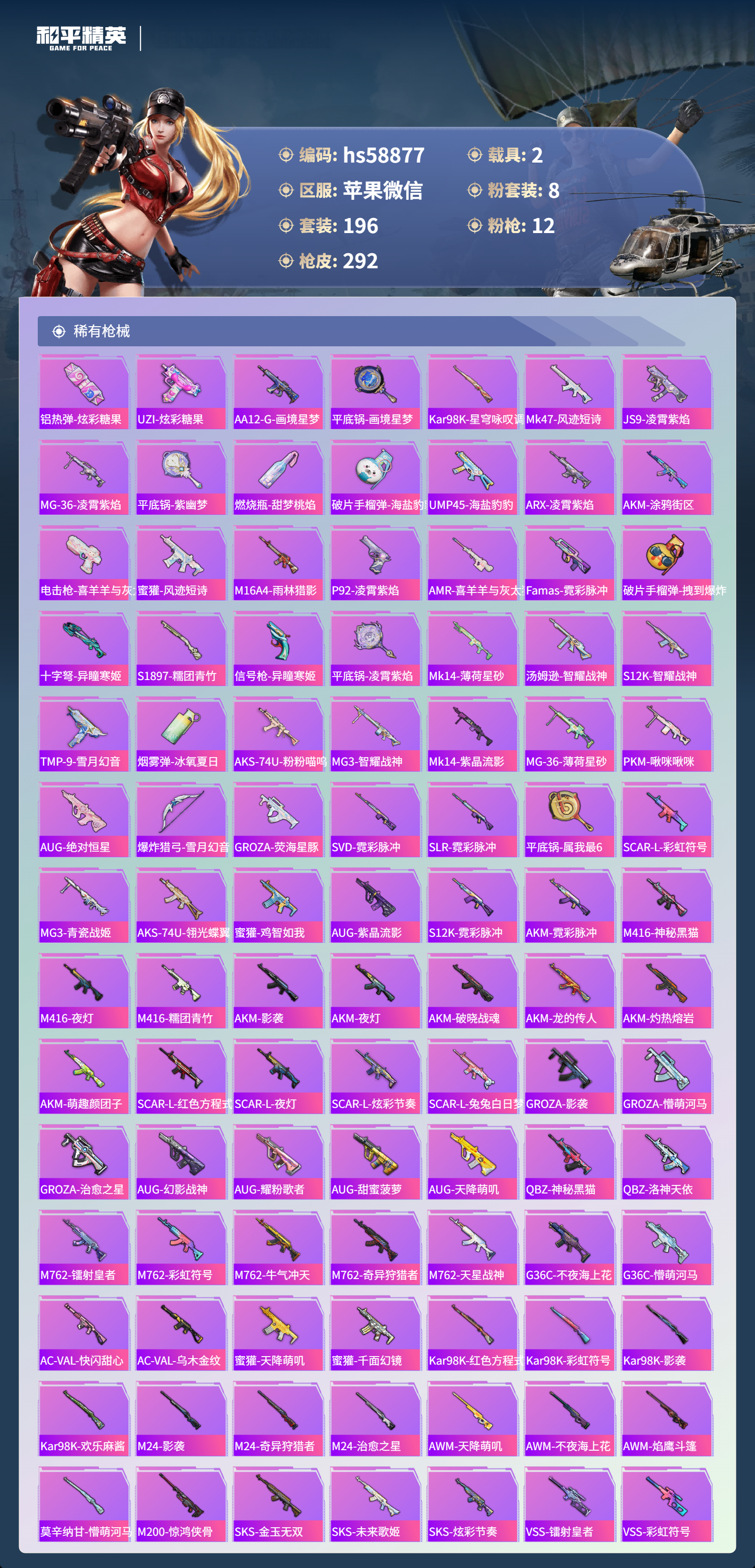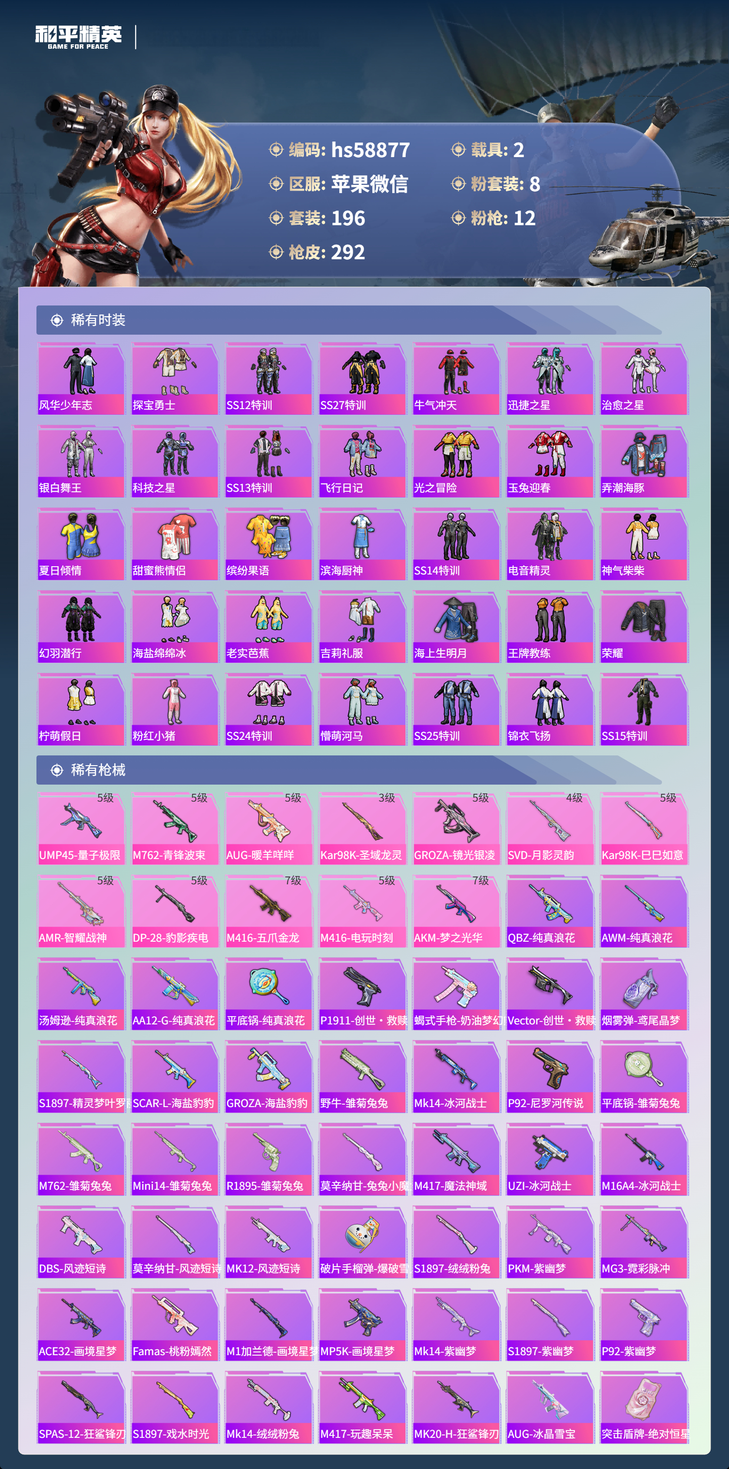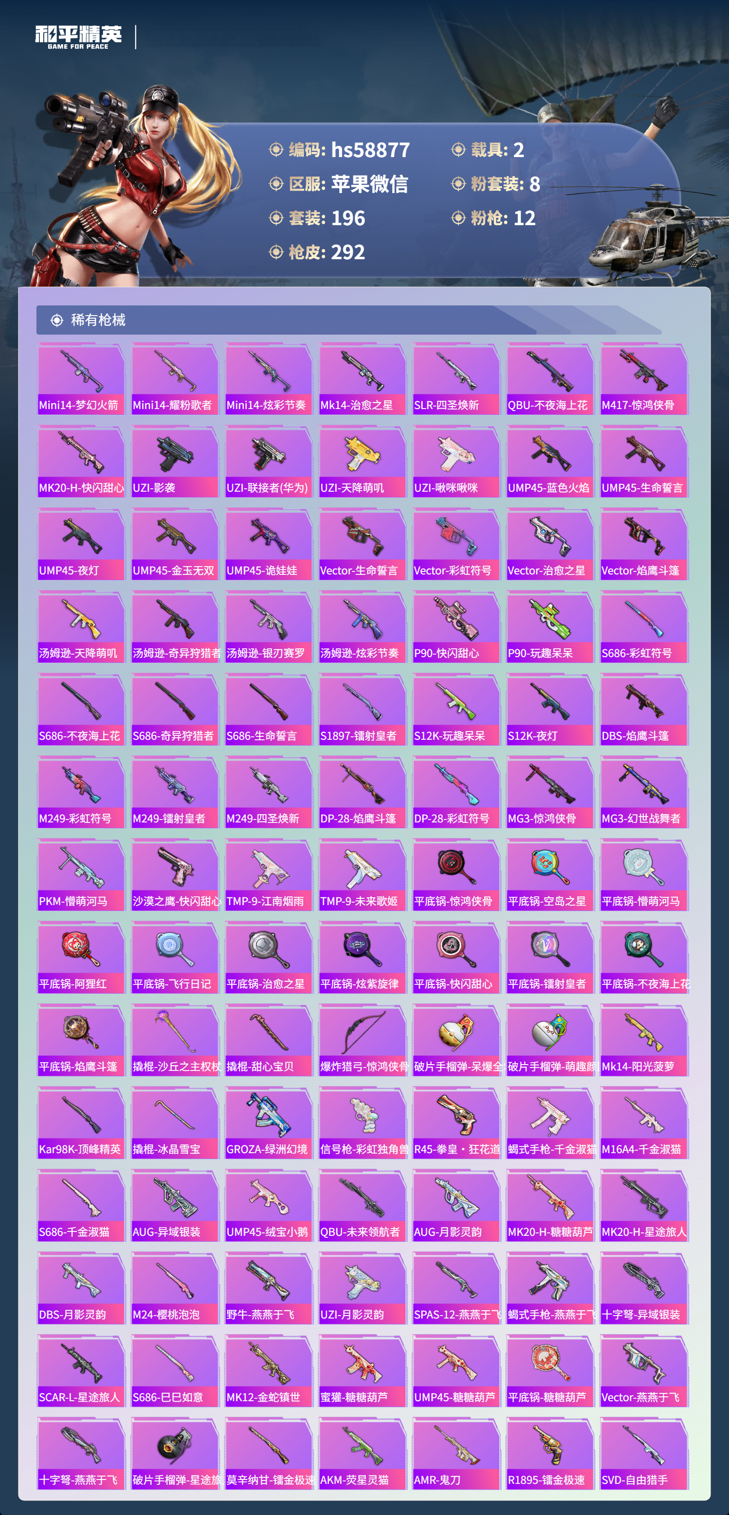 2载具-196套装-292呛皮-hs58877 苹果微信-13王牌印记-8粉装-12特效呛-2载具-88063热力值-196套装-292呛皮-8卓越印记-5传奇印记【8粉装】角色-萨利娅套装-星穹咏叹调套装-创世·救赎套装-梦幻火箭套装-放客神游角色-千金淑猫套装-天使彩虹糖套装-星之彼岸【12特效呛】m416-电玩时刻/5级akm-梦之光华/7级groza-镜光银凌/5级amr-智耀战神/5级dp-2