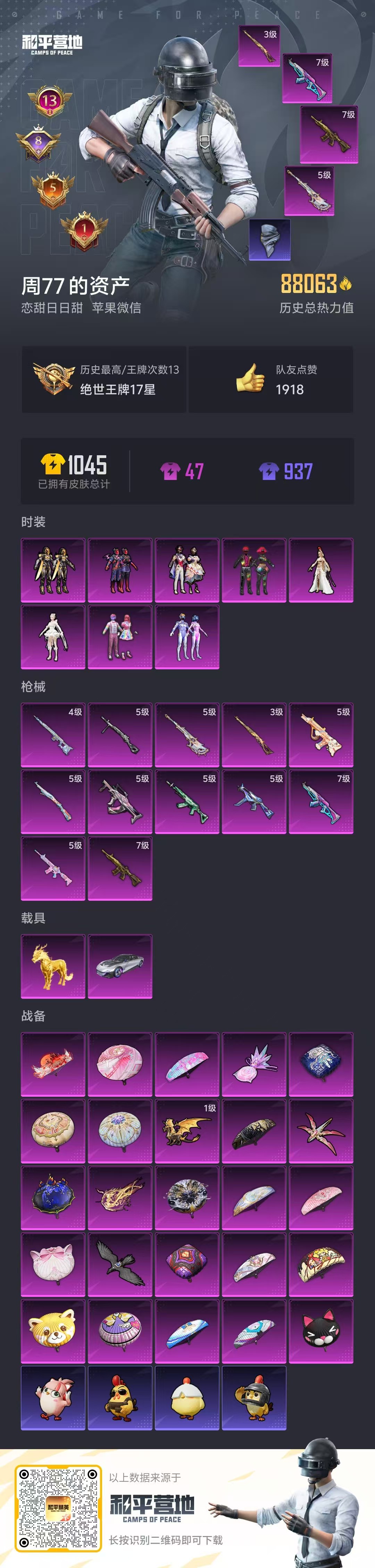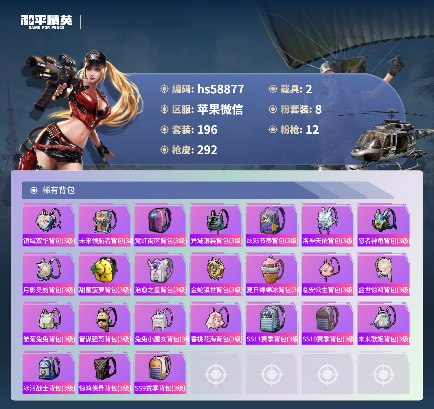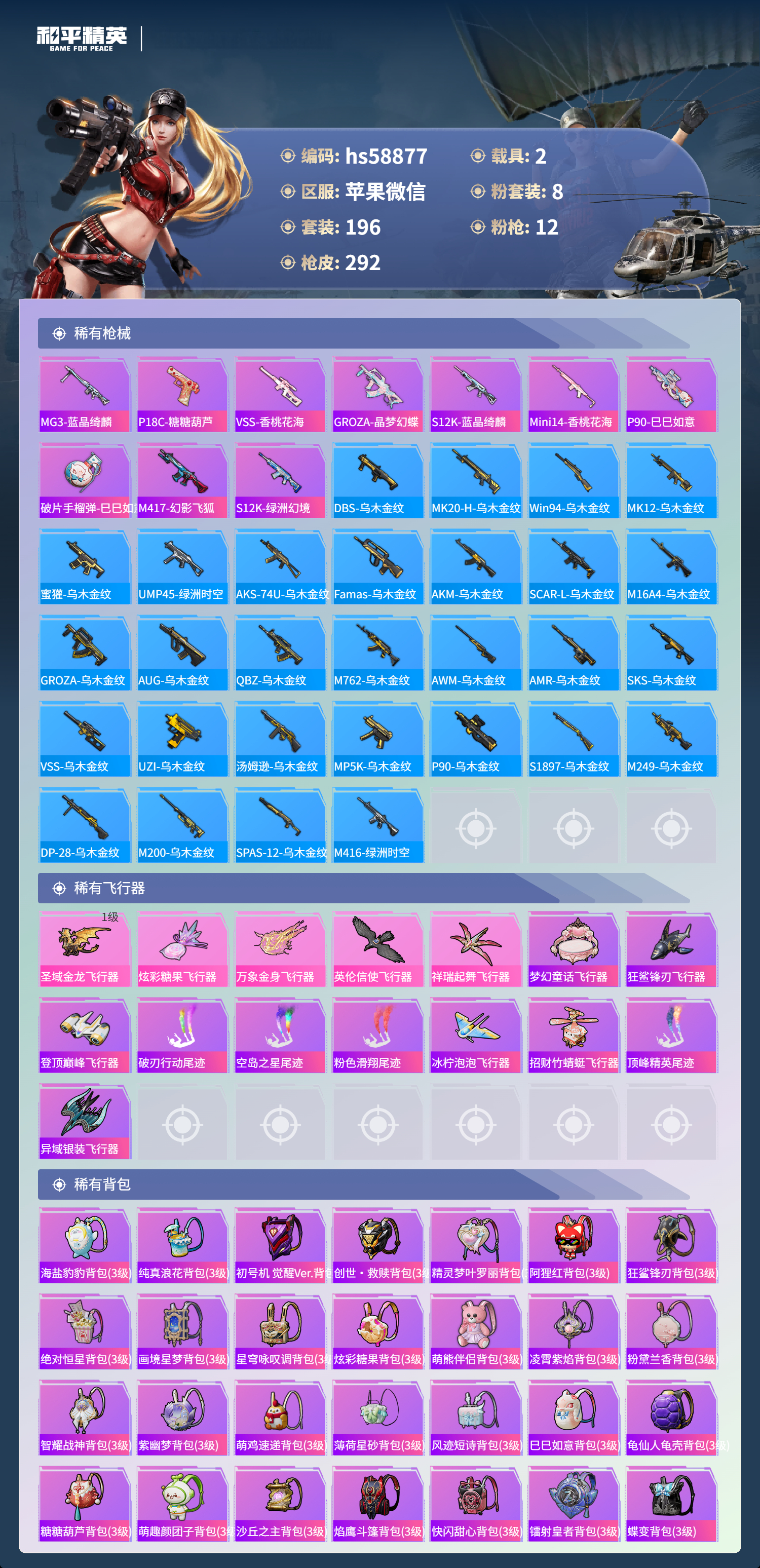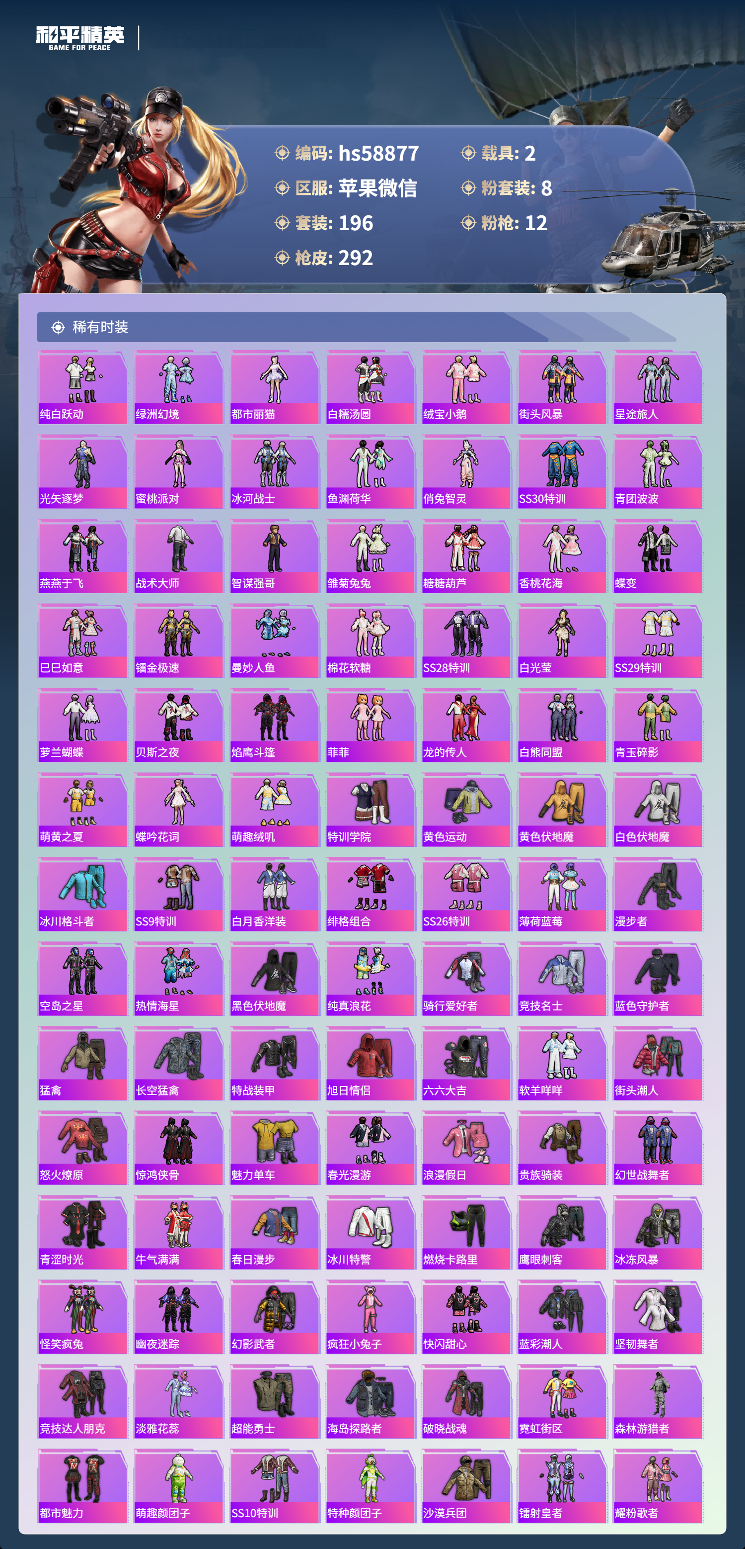 2载具-196套装-292呛皮-hs58877 苹果微信-13王牌印记-8粉装-12特效呛-2载具-88063热力值-196套装-292呛皮-8卓越印记-5传奇印记【8粉装】角色-萨利娅套装-星穹咏叹调套装-创世·救赎套装-梦幻火箭套装-放客神游角色-千金淑猫套装-天使彩虹糖套装-星之彼岸【12特效呛】m416-电玩时刻/5级akm-梦之光华/7级groza-镜光银凌/5级amr-智耀战神/5级dp-2