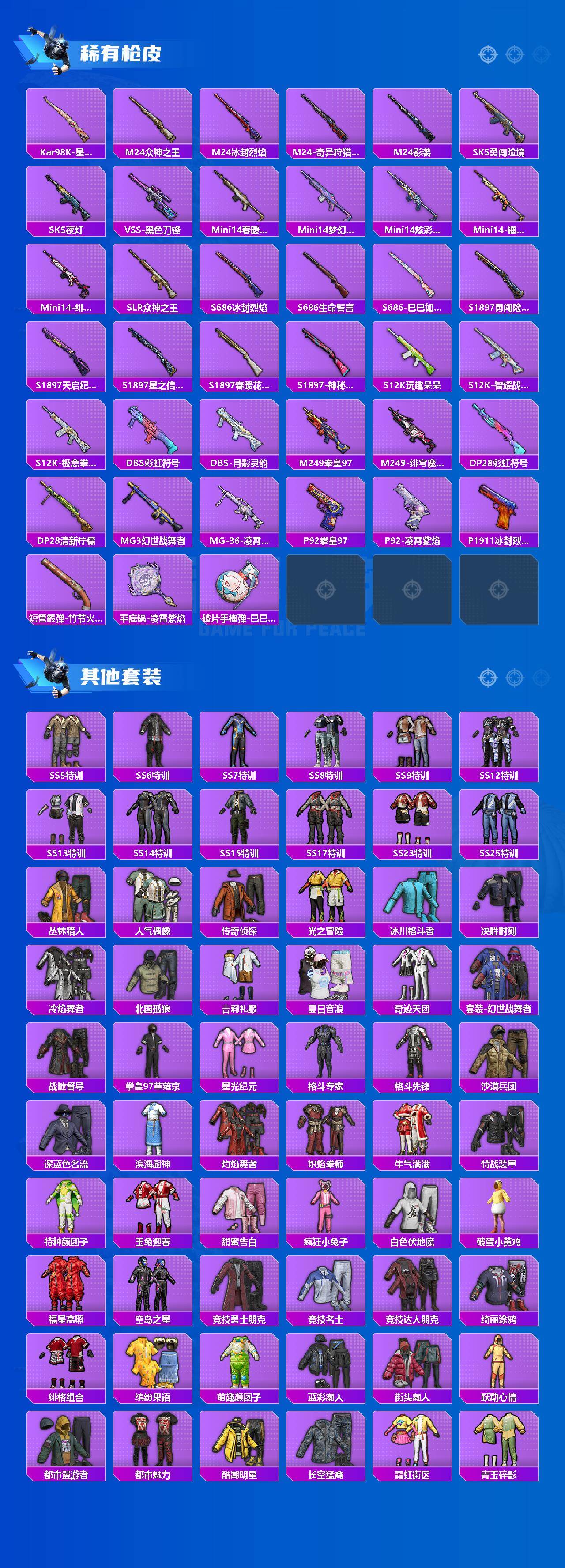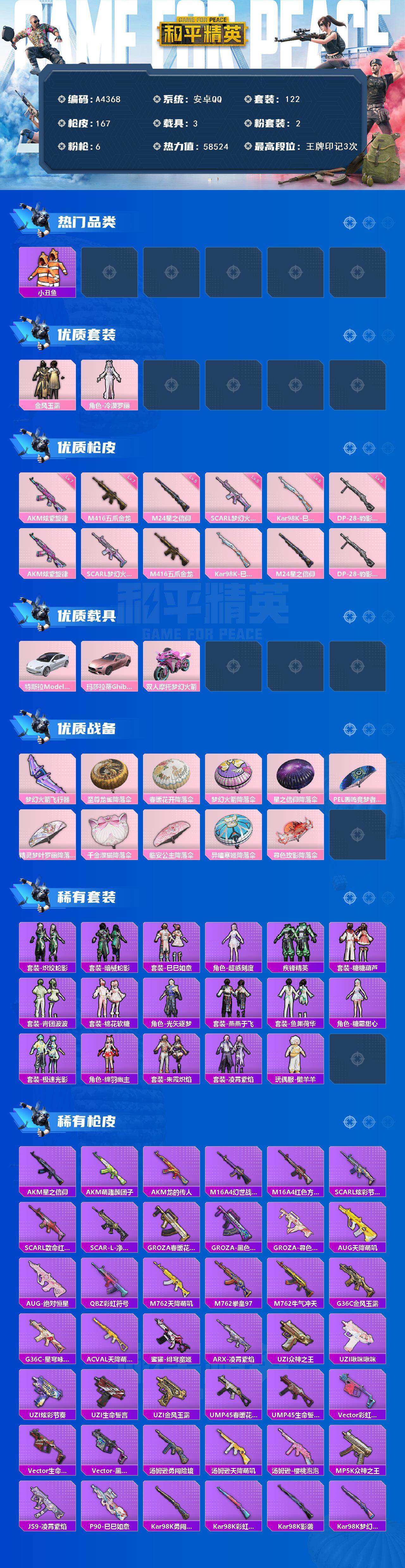 [16038591]安卓【公主号 套装-小丑鱼/akm-炫紫旋律七级/m416-五爪金龙七级/特斯拉model 3(珍珠白)/玛莎拉蒂ghibli(粉)】 手q-2粉装-6特效呛-3载具-1粉色飞行器-58524热力值-3王牌印记-122套装-167呛皮 【热门品类】:套装-小丑鱼 【粉色套装】:粉装-金风玉露,角色-冷漠罗丽 【粉色呛皮等级】:akm-炫紫旋律七级,scar-l-梦幻火箭五级,m416-五爪金龙七级,kar98k-巳巳如意五级,m24-星之信仰五级,dp-28-豹影疾电五级 【粉色载具】:特斯拉model 3(珍珠白),玛莎拉蒂ghibli(粉),双人摩托-梦幻火箭 【粉色呛皮】:akm-炫紫旋律,scar-l-梦幻火箭,m416-五爪金龙,kar98k-巳巳如意,m24-星之信仰,dp-28-豹影疾电 【粉色飞行器】:梦幻火箭飞行器 【粉色降落伞】:至尊龙雀降落伞,春暖花开降落伞,梦幻火箭降落伞,星之信仰降落伞,pel轰鸣竞梦者降落伞,精灵梦叶罗丽降落伞,千金淑猫降落伞,临安公主降落伞,异瞳寒姬降落伞,暮色玫影降落伞 【稀有套装】:套装-炽纹蛇影,套装-暗械蛇影,套装-巳巳如意,角色-超感刻度,套装-疾锋精英,套装-糖糖葫芦,套装-青团波波,套装-棉花软糖,角色-光矢逐梦,套装-燕燕于飞,套装-鱼渊荷华,角色-糖霜甜心,套装-极速光影,角色-绛羽幽主,套装-朱霞炽焰,套装-凌霄紫焰,玩偶服-懒羊羊 【稀有呛皮】:akm-星之信仰,akm-萌趣颜团子,akm-龙的传人,m16a4-幻世战舞者,m16a4-红色方程式,scar-l-炫彩节奏,scar-l-致命红樱,scar-l-净心行者,groza-春暖花开,groza-黑色刀锋,groza-暮色玫影,aug-天降萌叽,aug-绝对恒星,q-彩虹符号,m762-天降萌叽,m762-拳皇97,m762-牛气冲天,g36c-金风玉露,g36c-星穹咏叹调,ac-val-天降萌叽,蜜獾-绯穹魔姬,arx-凌霄紫焰,uzi-众神之王,uzi-啾咪啾咪,uzi-炫彩节奏,uzi-生命誓言,uzi-金风玉露,ump45-春暖花开,ump45-生命誓言,vect-彩虹符号,vect-生命誓言,vect-黑色刀锋,汤姆逊-勇闯险境,汤姆逊-天降萌叽,汤姆逊-樱桃泡泡,mp5k-众神之王