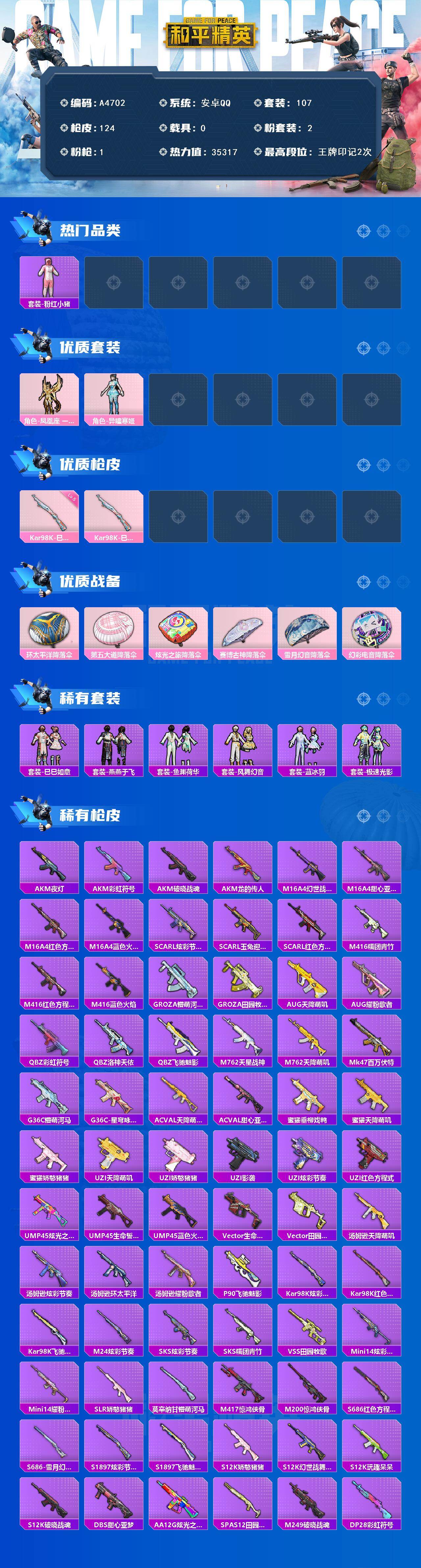 [16046353]安卓 【小号 凤凰座 一辉/粉红小猪】手q-2粉装-1特效呛-0载具-0粉色飞行器-35317热力值-2王牌印记-107套装-124呛皮 【热门品类】:套装-粉红小猪 【粉色套装】:角色-凤凰座 一辉,角色-异瞳寒姬 【粉色呛皮等级】:kar98k-巳巳如意五级 【粉色呛皮】:kar98k-巳巳如意 【粉色降落伞】:环太平洋降落伞,第五大道降落伞,炫光之旅降落伞,赛博古神降落伞,雪月幻音降落伞,幻彩电音降落伞 【稀有套装】:套装-巳巳如意,套装-燕燕于飞,套装-鱼渊荷华,套装-风舞幻音,套装-蓝冰羽,套装-极速光影 【稀有呛皮】:akm-夜灯,akm-彩虹符号,akm-破晓战魂,akm-龙的传人,m16a4-幻世战舞者,m16a4-甜心亚梦,m16a4-红色方程式,m16a4-蓝色火焰,scar-l-炫彩节奏,scar-l-玉兔迎春,scar-l-红色方程式,m416-糯团青竹,m416-红色方程式,m416-蓝色火焰,groza-懵萌河马,groza-田园牧歌,aug-天降萌叽,aug-耀粉歌者,q-彩虹符号,q-洛神天依,q-飞驰魅影,m762-天星战神,m762-天降萌叽,mk47-百万伏特,g36c-懵萌河马,g36c-星穹咏叹调,ac-val-天降萌叽,ac-val-甜心亚梦,蜜獾-垂柳戏鸭,蜜獾-天降萌叽,蜜獾-娇憨猪猪,uzi-天降萌叽,uzi-娇憨猪猪,uzi-影袭,uzi-炫彩节奏,uzi-红色方程式,ump45-炫光之旅,ump45-生命誓言,ump45-蓝色火焰,vect-生命誓言,vect-田园牧歌,汤姆逊-天降萌叽,汤姆逊-炫彩节奏,汤姆逊-环太平洋,汤姆逊-耀粉歌者,p90-飞驰魅影,kar98k-炫彩节奏,kar98k-红色方程式,kar98k-飞驰魅影,m24-炫彩节奏,sks-炫彩节奏,sks-糯团青竹,vss-田园牧歌,mini14-炫彩节奏,mini14-耀粉歌者,slr-娇憨猪猪,莫辛纳甘-懵萌河马,m417-惊鸿侠骨,m200-惊鸿侠骨,s686-红色方程式,s686-雪月幻音,s1897-炫彩节奏,s1897-飞驰魅影,s12k-玩趣呆呆,s12k-破晓战魂,s12k-娇憨猪猪,s12k-幻世战舞者,dbs-甜心亚梦,aa12-g-炫光之旅,spas-12-田园牧歌,m249-破晓战魂,dp-28