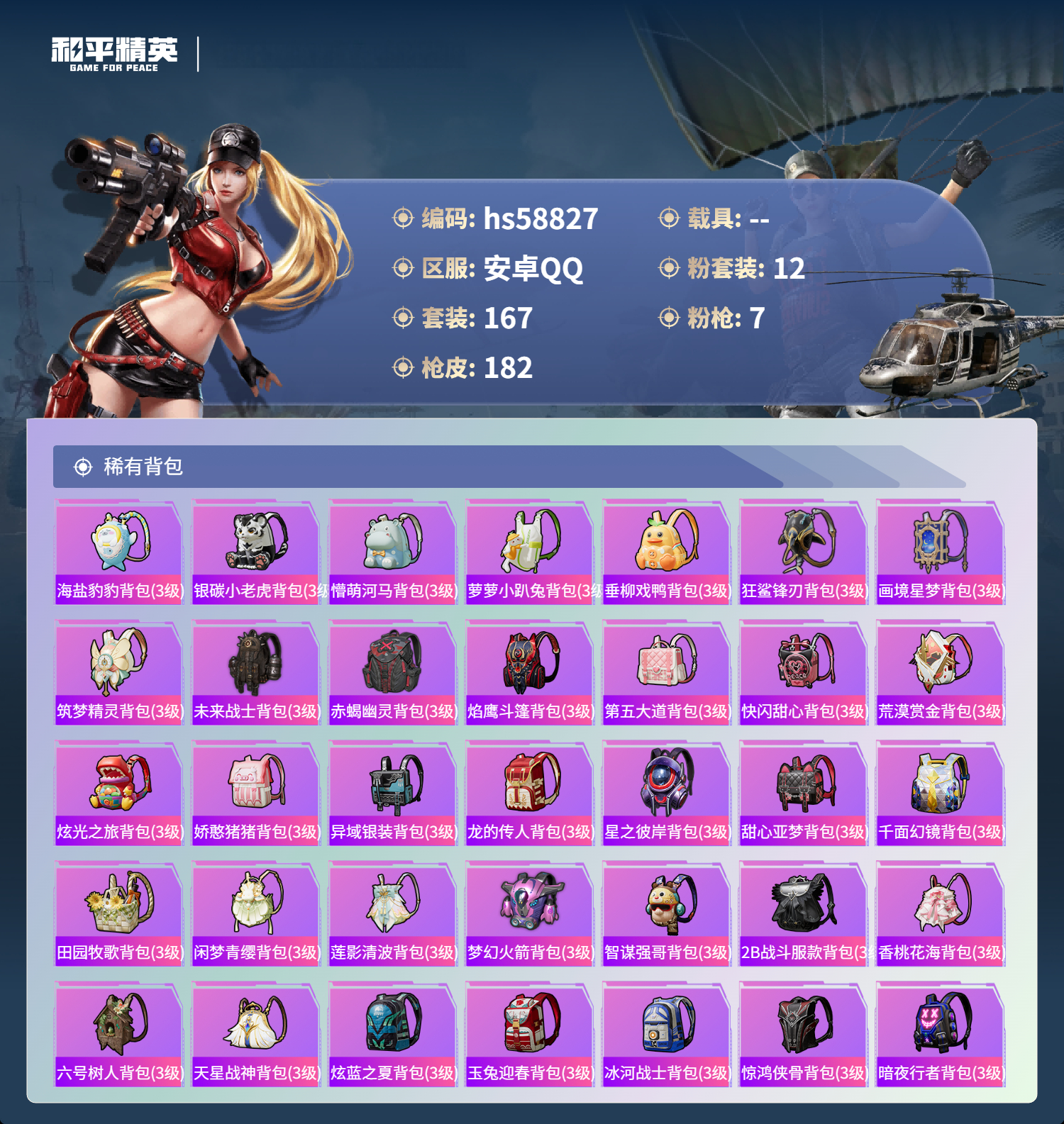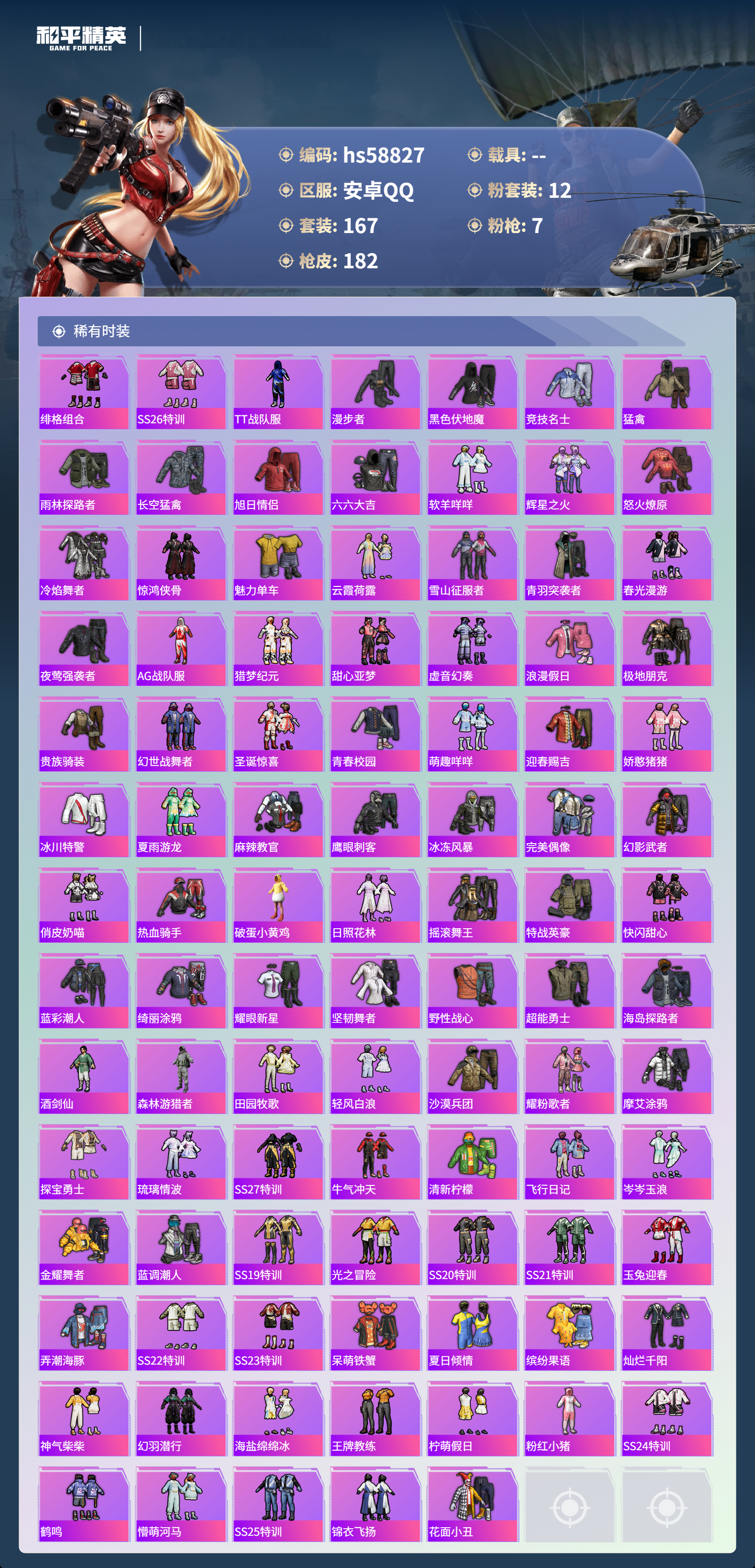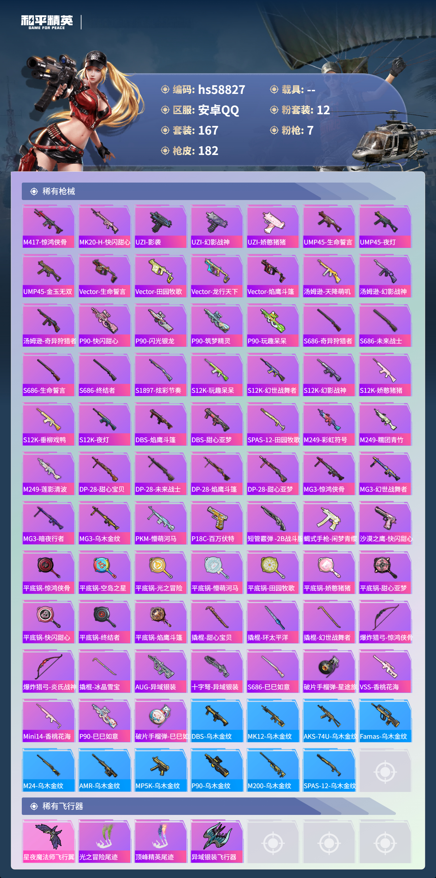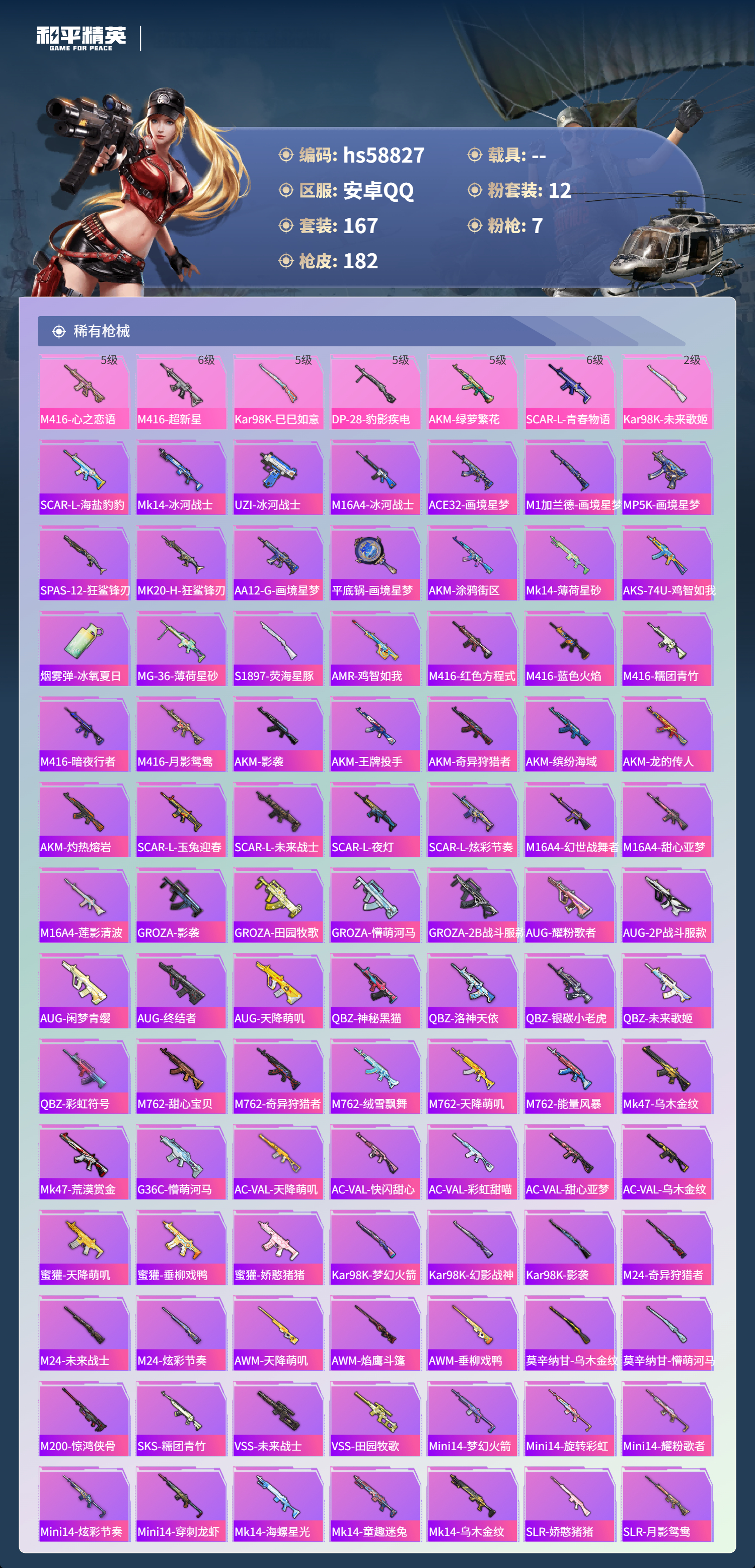0载具-167套装-182呛皮-hs58827 安卓手q-7王牌印记-12粉装-7特效呛-59727热力值-167套装-182呛皮【12粉装】套装-水曜玄武套装-智能音符角色-圣堂之誓套装-霓虹漫游套装-傲雪凌霜角色-阿尔茜套装-梦幻火箭套装-天星战神套装-新星烈龙套装-海螺星光套装-宝贝奶油派套装-天使彩虹糖【7特效呛】scar-l-青春物语/6级m416-心之恋语/5级kar98k-巳巳如意/5