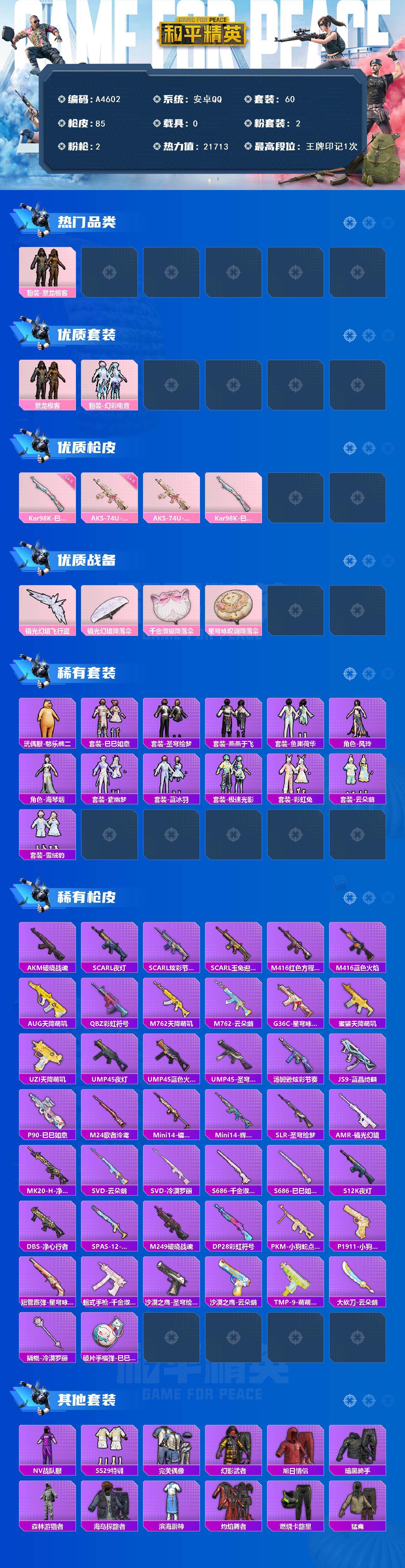 [16046892]安卓 【小号 繁龙极客/幻彩电音/aks-74u-星穹咏叹调五级】手q-2粉装-2特效呛-0载具-1粉色飞行器-21713热力值-1王牌印记-60套装-85呛皮 【热门品类】:粉装-繁龙极客 【粉色套装】:粉装-繁龙极客,粉装-幻彩电音 【粉色呛皮等级】:aks-74u-星穹咏叹调五级,kar98k-巳巳如意五级 【粉色呛皮】:aks-74u-星穹咏叹调,kar98k-巳巳如意 【粉色飞行器】:镜光幻境飞行翼 【粉色降落伞】:镜光幻境降落伞,千金淑猫降落伞,星穹咏叹调降落伞 【稀有套装】:玩偶服-憨乐熊二,套装-巳巳如意,套装-圣穹绘梦,套装-燕燕于飞,套装-鱼渊荷华,角色-风玲,角色-海琴烟,套装-紫幽梦,套装-蓝冰羽,套装-极速光影,套装-彩虹兔,套装-云朵鹅,套装-雪绒豹 【稀有呛皮】:akm-破晓战魂,scar-l-夜灯,scar-l-炫彩节奏,scar-l-玉兔迎春,m416-红色方程式,m416-蓝色火焰,aug-天降萌叽,q-彩虹符号,m762-天降萌叽,m762-云朵鹅,g36c-星穹咏叹调,蜜獾-天降萌叽,uzi-天降萌叽,ump45-夜灯,ump45-蓝色火焰,ump45-圣穹绘梦,汤姆逊-炫彩节奏,js9-蓝晶绮麟,p90-巳巳如意,m24-歌者泠鸢,mini14-镭金极速,mini14-辉羽雀灵,slr-圣穹绘梦,amr-镜光幻境,mk20-h-净心行者,svd-云朵鹅,svd-冷漠罗丽,s686-巳巳如意,s686-千金淑猫,s12k-夜灯,dbs-净心行者,spas-12-云朵鹅,m249-破晓战魂,dp-28-彩虹符号,pkm-小狗蛇点点,p1911-小狗蛇点点,短管霰弹-星穹咏叹调,蝎式手呛-千金淑猫,沙墨之鹦-云朵鹅,沙墨之鹦-圣穹绘梦,tmp-9-萌萌史莱姆,大砍刀-云朵鹅,撬棍-冷漠罗丽,破片手留单-巳巳如意 【其他套装】:套装-nv战队服,套装-ss29特训,套装-完美偶像,套装-幻影武者,套装-旭日情侣,套装-暗黑骑手,套装-森林游猎者,套装-海岛探路者,套装-滨海厨神,套装-灼焰舞者,套装-燃烧卡路里,套装-猛禽,套装-生化防暴队,套装-白色伏地魔,套装-破晓战魂,套装-竞技名士,套装-缤纷果语,套装-街头潮人,套装-酒红色名流,套装-长空猛禽,套装-魅力单车,套装-鹤鸣,套装-黄色伏地魔,套装-黄色运动
