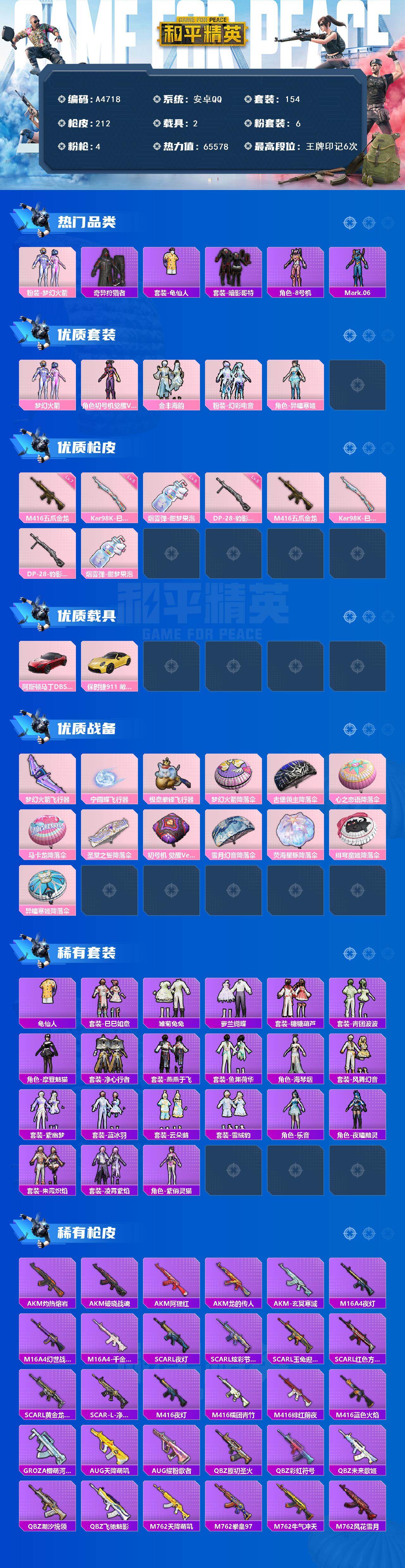 [16048012]安卓 【男神号 梦幻火箭/奇异狩猎者/暗影哥特/mark.06/m416-五爪金龙七级/阿斯顿马丁dbs(红)】手q-6粉装-4特效呛-2载具-3粉色飞行器-65578热力值-6王牌印记-154套装-212呛皮 【热门品类】:粉装-梦幻火箭,套装-奇异狩猎者,套装-龟仙人,套装-暗影哥特,角色-8号机,角色-mark.06 【粉色套装】:粉装-梦幻火箭,角色-初号机 觉醒ver.,粉装-金丰海韵,粉装-幻彩电音,角色-异瞳寒姬 【粉色呛皮等级】:m416-五爪金龙七级,kar98k-巳巳如意五级,dp-28-豹影疾电五级,盐雾蛋-甜梦果泡五级 【粉色载具】:阿斯顿马丁dbs(红),保时捷911 敞篷版(极速黄) 【粉色呛皮】:m416-五爪金龙,kar98k-巳巳如意,dp-28-豹影疾电,盐雾蛋-甜梦果泡 【粉色飞行器】:梦幻火箭飞行器,宁雨蝶飞行器,极意拳锋飞行器 【粉色降落伞】:梦幻火箭降落伞,古堡领主降落伞,心之恋语降落伞,马卡龙降落伞,圣堂之誓降落伞,初号机 觉醒ver.降落伞,雪月幻音降落伞,荧海星豚降落伞,绯穹魔姬降落伞,异瞳寒姬降落伞,炫彩糖果降落伞 【稀有套装】:套装-龟仙人,套装-巳巳如意,套装-雪国风尚,套装-雏菊兔兔,套装-萝兰蝴蝶,套装-糖糖葫芦,套装-青团波波,角色-摩登魅猫,套装-净心行者,套装-燕燕于飞,套装-鱼渊荷华,角色-海琴烟,套装-风舞幻音,套装-紫幽梦,套装-蓝冰羽,套装-云朵鹅,套装-雪绒豹,角色-乐音,角色-夜瞳黯灵,套装-朱霞炽焰,套装-凌霄紫焰,角色-紫俏灵猫 【稀有呛皮】:akm-灼热熔岩,akm-破晓战魂,akm-阿狸红,akm-龙的传人,akm-玄冥寒域,m16a4-夜灯,m16a4-幻世战舞者,m16a4-千金淑猫,scar-l-夜灯,scar-l-炫彩节奏,scar-l-玉兔迎春,scar-l-红色方程式,scar-l-黄金龙骨,scar-l-净心行者,m416-夜灯,m416-糯团青竹,m416-绯红前夜,m416-蓝色火焰,groza-懵萌河马,aug-天降萌叽,aug-耀粉歌者,q-原初圣火,q-彩虹符号,q-未来歌姬,q-潮汐统领,q-飞驰魅影,m762-天降萌叽,m762-拳皇97,m762-牛气冲天,m762-风花雪月,m762-云朵鹅,g36c-不夜海