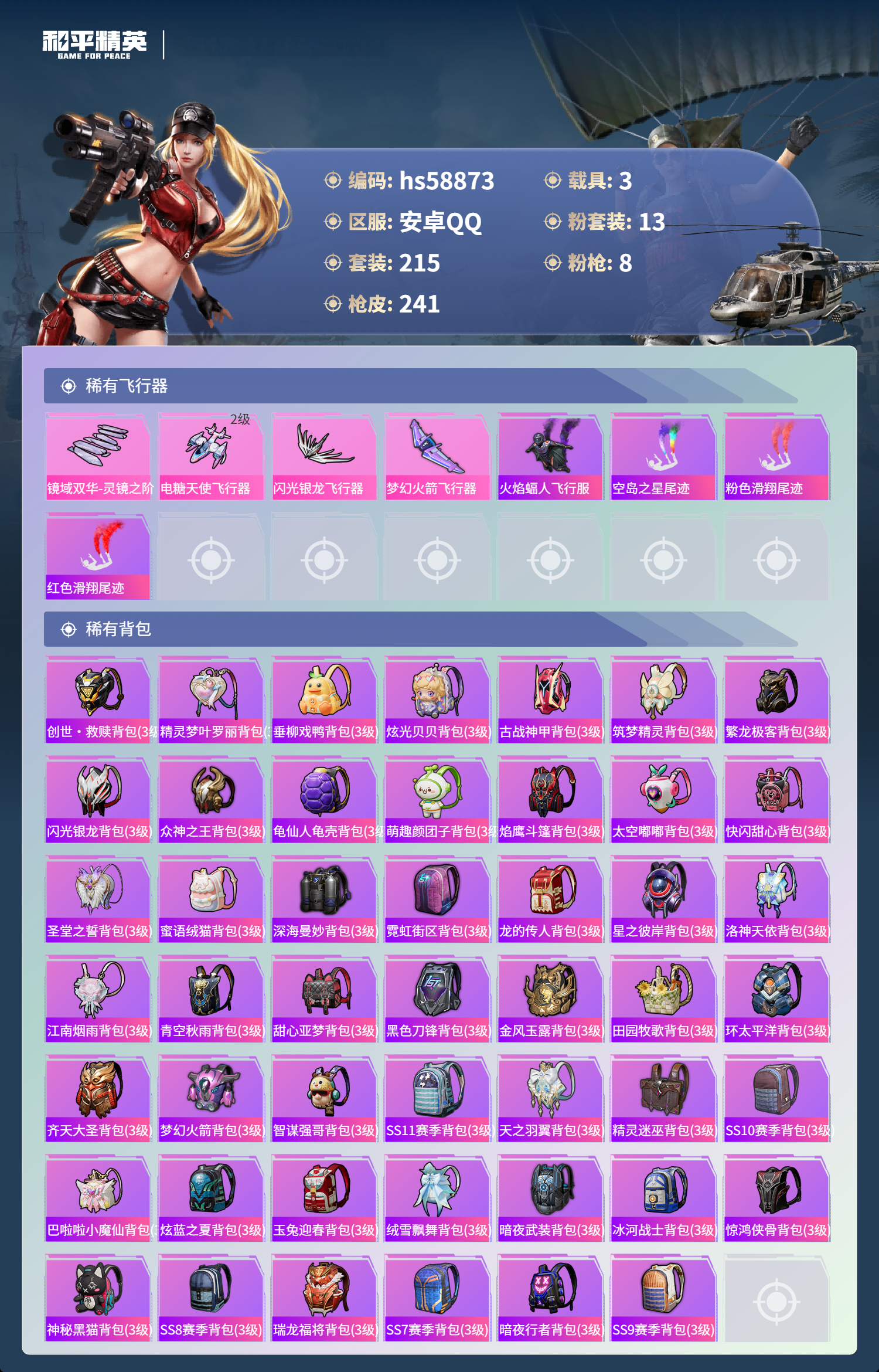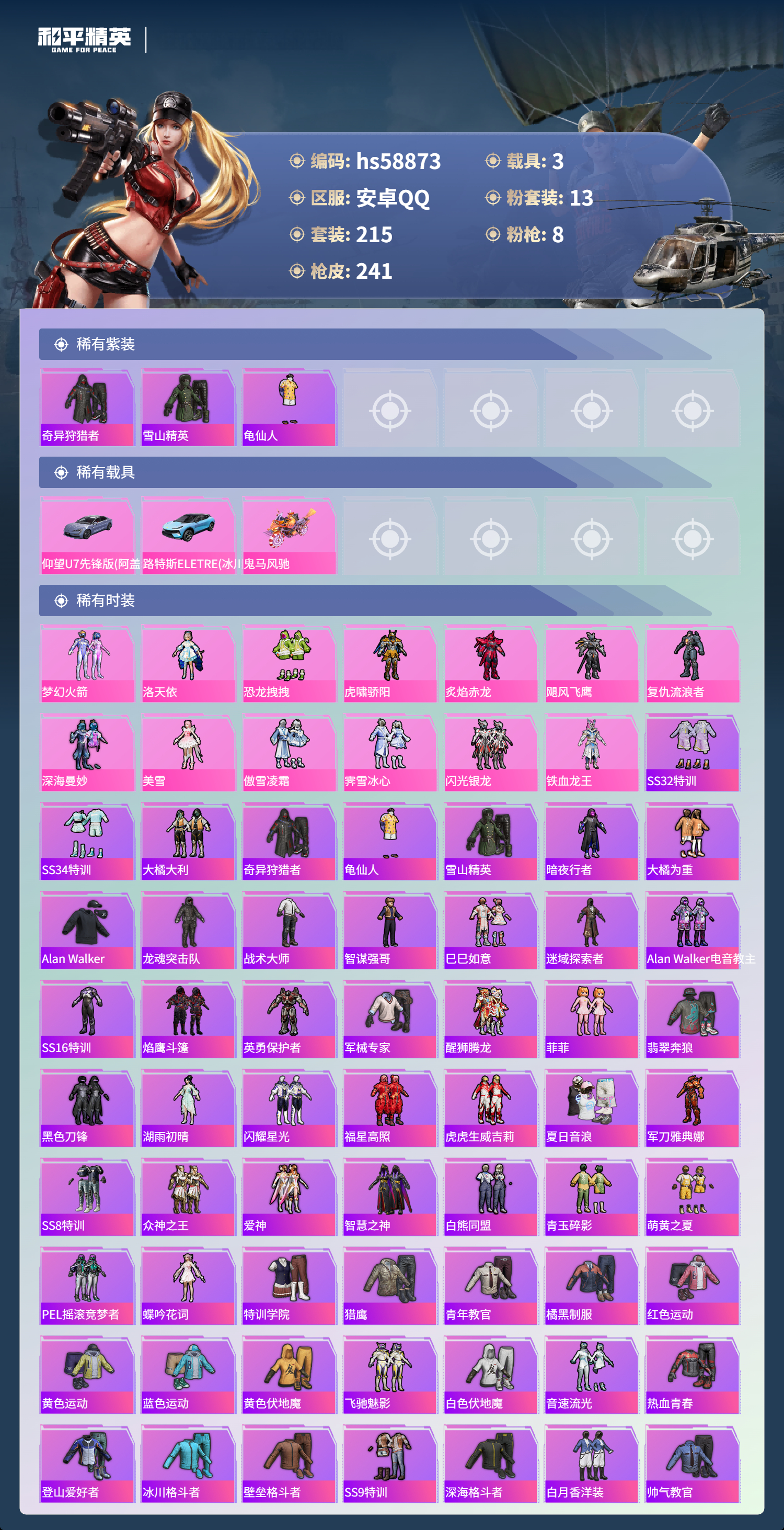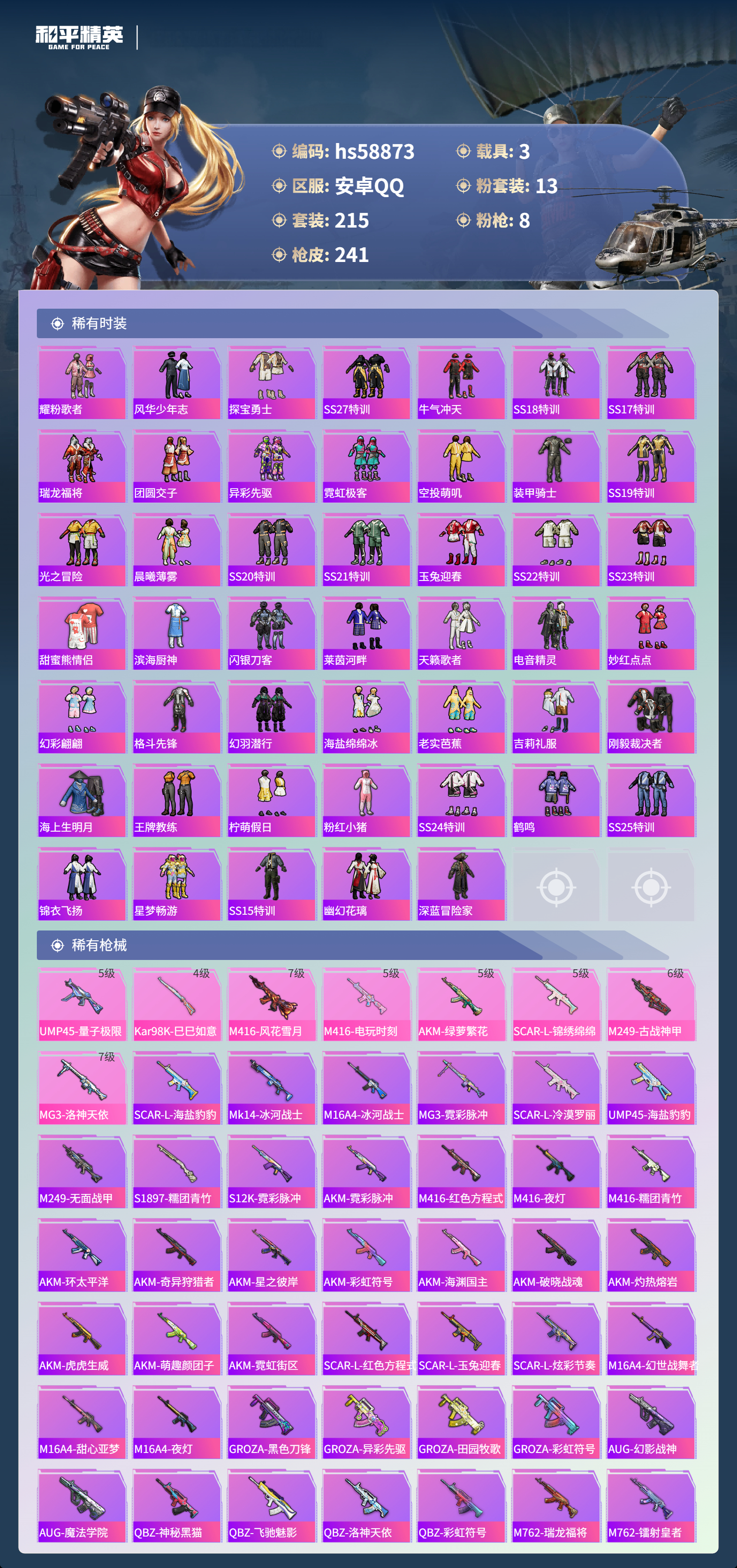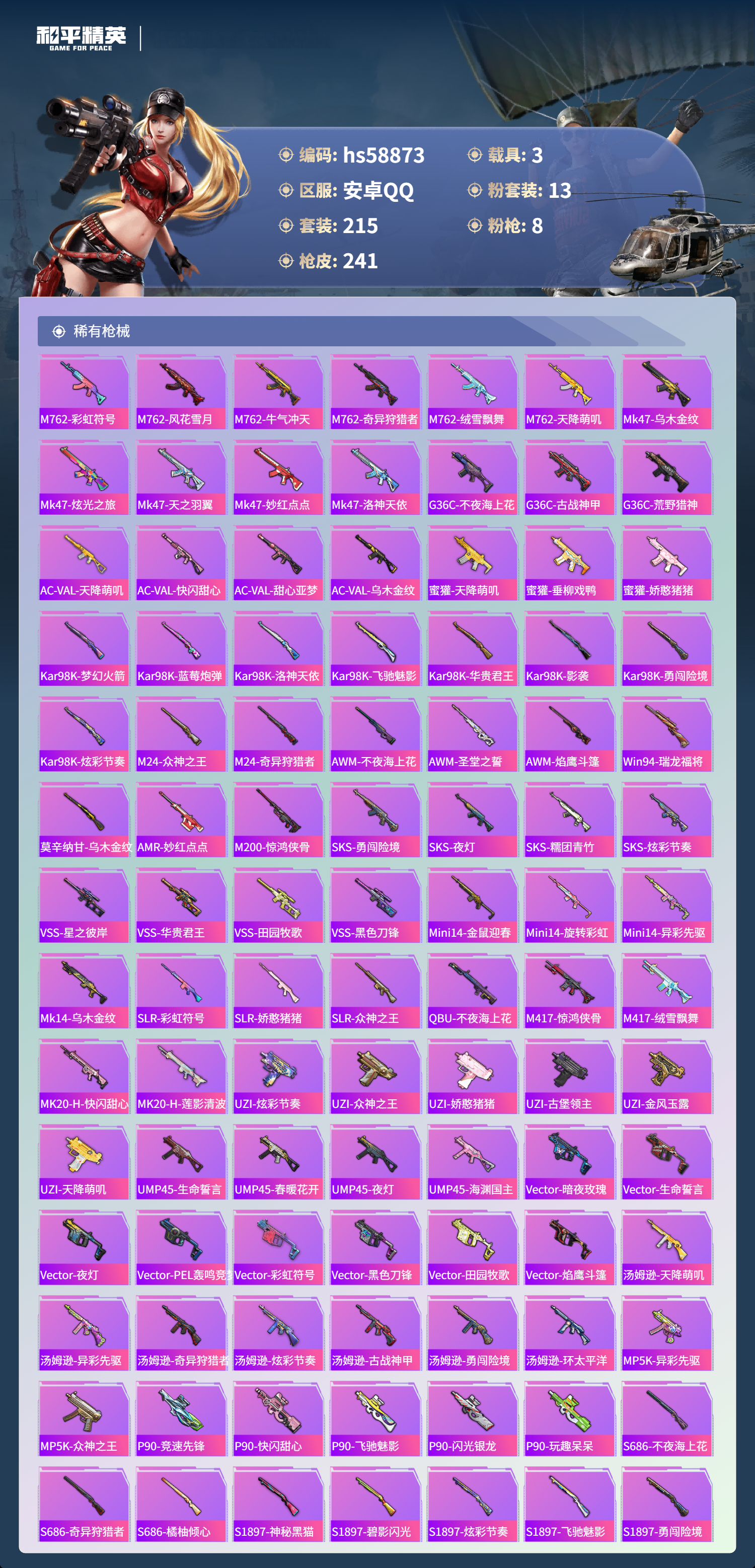 2411127安卓手q-8王牌印记-13粉装-8特效呛-3载具-93200热力值-215套装-241呛皮 【13粉装】套装-深海曼妙套装-梦幻火箭套装-霁雪冰心套装-飓风飞鹰角色-洛天依套装-虎啸骄阳套装-闪光银龙角色-复仇流浪者套装-铁血龙王套装-傲雪凌霜角色-美雪套装-恐龙拽拽套装-炙焰赤龙 【8特效呛】akm-绿萝繁花/5级m249-古战神甲/6级sca