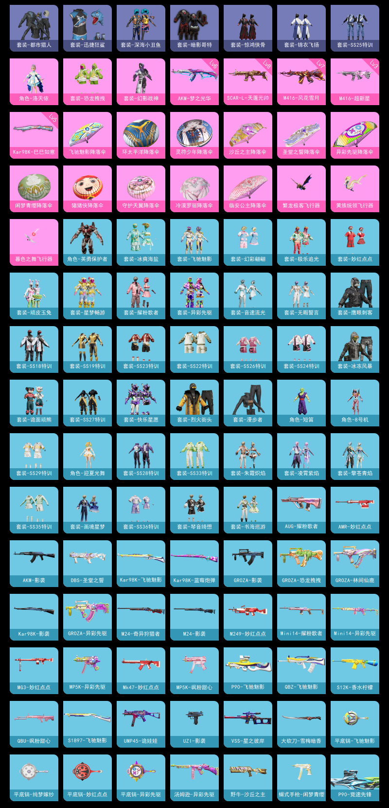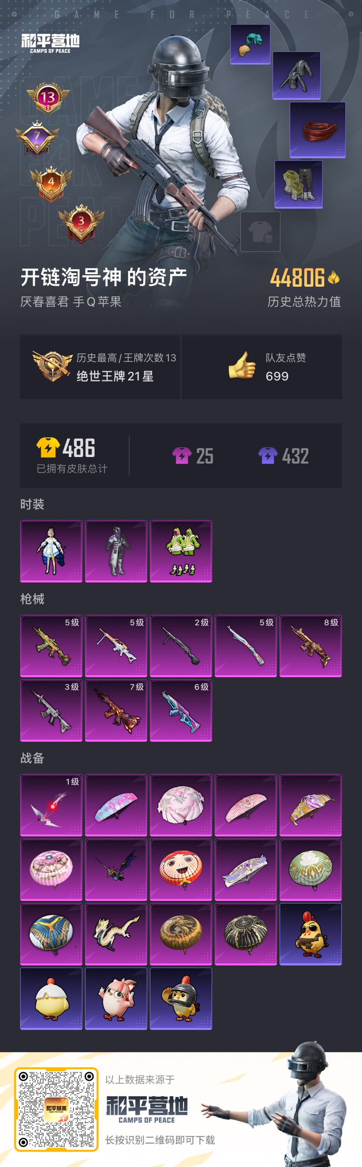 【和平精英】【txhp6567】3粉装,8特效呛,0载具,历史最高段位:绝世王牌21星 王牌印记13次 热力值:44806,97套装,133呛械,159装备,81战备;套装:套装-幻影战神,角色-洛天依,套装-恐龙拽拽,套装-蓝色运动,套装-白色伏地魔,套装-竞技名士,套装-猛禽,套装-长空猛禽,套装-漫步者,套装-旭日情侣,套装-六六大吉,套装-冷焰舞者,套装-都市猎人,套装-特殊使命,套装-鹰眼刺客,套装-冰冻风暴,套装-特战英豪,套装-蓝彩潮人,套装-魅力单车,套装-都市漫游者,套装-狂沙舞者,套装-荣耀,套装-沙漠兵团,套装-极地朋克,套装-烈火街头,套装-暗影哥特,套装-迅捷狂鲨,套装-深海小丑鱼,套装-缤纷果语,套装-龙魂突击队,套装-极速红龙,套装-破蛋小黄鸡,套装-疯狂小兔子,套装-霓虹街区,套装-夏日音浪,套装-顽皮玉兔,套装-诡面顽熊,套装-战术大师,套装-ss18特训,套装-耀粉歌者,套装-冰爽海盐,套装-快乐星愿,套装-星梦畅游,角色-英勇保护者,套装-极乐追光,套装-异彩先驱,套装-霓虹极客,套装-ss19特训,套装-飞驰魅影,套装-音速流光,套装-炫蓝之夏,套装-ss22特训,套装-绯格组合,套装-ss23特训,套装-妙红点点,套装-幻彩翩翩,套装-王牌教练,套装-ss24特训,角色-短笛,套装-龟仙人,套装-涂山之恋,套装-ss25特训,套装-惊鸿侠骨,套装-锦衣飞扬,套装-龙的传人,套装-冰河战士,套装-ss26特训,套装-空岛之星,套装-无暇誓言,套装-ss27特训,套装-老实芭蕉,套装-ss28特训,角色-迎夏光舞,角色-8号机,套装-海盐绵绵冰,套装-蝶变,套装-ss29特训,套装-星途旅人,套装-ss30特训,套装-ss31特训,套装-智谋强哥,套装-ss33特训,套装-巳巳如意,套装-ss32特训,套装-青翼流星,套装-元气之梦,套装-ss34特训,套装-擎苍青焰,套装-朱霞炽焰,套装-凌霄紫焰,套装-ss35特训,套装-琴音绮想,套装-画境星梦,套装-书海巡游,角色-月烬之祷,套装-ss36特训,套装-萌鸡速递;呛皮:7级m416-风花雪月,3级m416-超新星,m416-糯团青竹,g36c-乌木金纹,groza-影袭,groza-林间仙鹿,groza-异彩先驱,groza-恐龙拽拽,groza-海盐豹豹,6级akm-梦之光华,akm-影袭,akm-霓虹街区,akm-涂鸦街区,akm-彩虹符号,akm-龙的传人,akm-霓彩脉冲,q-飞驰魅影,8级scar-l-天蓬元帅,scar-l-星途旅人,scar-l-海盐豹豹,aug-耀粉歌者,aug-天降萌叽,aug-紫晶流影,ace32-画境星梦,ace32-冰晶雪宝,ac-val-乌木金纹,m762-天降萌叽,m16a4-幻世战舞者,m16a4-冰河战士,famas-霓彩脉冲,arx-凌霄紫焰,mk47-妙红点点,5级kar98k-巳巳如意,kar98k-影袭,kar98k-彩虹符号,kar98k-炫彩节奏,kar98k-蓝莓炮弹,kar98k-飞驰魅影,kar98k-顶峰精英,m24-影袭,m24-奇异狩猎者,m24-乌木金纹,win94-乌木金纹,amr-妙红点点,amr-乌木金纹,awm-天降萌叽,awm-暮色玫影,莫辛纳甘-乌木金纹,m200-惊鸿侠骨,m200-乌木金纹,svd-霓彩脉冲,m417-惊鸿侠骨,mk14-冰河战士,mk14-紫晶流影,m1加兰德-画境星梦,mk20-h-星途旅人,mk20-h-狂鲨锋刃,mk20-h-乌木金纹,mini14-耀粉歌者,mini14-异彩先驱,mini14-涂山之恋,mini14-香桃花海,vss-星之彼岸,vss-彩虹符号,vss-香桃花海,slr-霓彩脉冲,mk12-乌木金纹,qbu-飒粉甜心,p90-飞驰魅影,p90-竞速先锋,p90-巳巳如意,p90-乌木金纹,uzi-影袭,uzi-冰河战士,uzi-啾咪啾咪,野牛-沙丘之主,野牛-乌木金纹,汤姆逊-炫彩节奏,汤姆逊-异彩先驱,汤姆逊-天降萌叽,ump45-生命誓言,ump45-诡娃娃,ump45-涂山之恋,mp5k-异彩先驱,mp5k-飒粉甜心,mp5k-画境星梦,mp5k-乌木金纹,js9-凌霄紫焰,5级aks-74u-森灵之息,aks-74u-乌木金纹,s686-生命誓言,s686-彩虹符号,s1897-炫彩节奏,s1897-飞驰魅影,spas-12-狂鲨锋刃,spas-12-乌木金纹,aa12-g-画境星梦,dbs-圣堂之誓,dbs-乌木金纹,s12k-香水柠檬,s12k-玩趣呆呆,s12k-霓彩脉冲,m249-彩虹符号,m249-妙红点点,mg3-幻世战舞者,mg3-乌木金纹,mg3-妙红点点,mg3-惊鸿侠骨,5级mg-36-沧焰双生,mg-36-凌霄紫焰,mg-36-薄荷星砂,2级dp-28-豹影疾电,蝎式手呛-闲梦青缨,p92-凌霄紫焰,平底锅-异彩先驱,平底锅-飞驰魅影,平底锅-妙红点点,平底锅-纯梦嫁纱,平底锅-惊鸿侠骨,平底锅-空岛之星,平底锅-凌霄紫焰,平底锅-画境星梦,大砍刀-雪梅暗香,大砍刀-鬼刀,撬棍-冰晶雪宝,十子怒-异瞳寒姬,破片手留单-呆爆全场,破片手留单-星途旅人,破片手留单-拽到爆炸,破片手留单-巳巳如意,铝热弹-炫彩糖果,突击盾牌-黄族统领,爆炸猎弓-惊鸿侠骨;降落伞:黄族统领飞行器,繁龙极客飞行器,暮色之舞飞行器,空岛之星尾迹,顶峰精英尾迹,狂鲨锋刃飞行器,鸡智如我飞行器; 详情看图13印记-4.4w热力-3粉-8特 洛天依/哥特/都市/深海小丑鱼/幻影战神 8级天蓬元帅/6级梦之光华/满级风花雪月/3级超新星m4