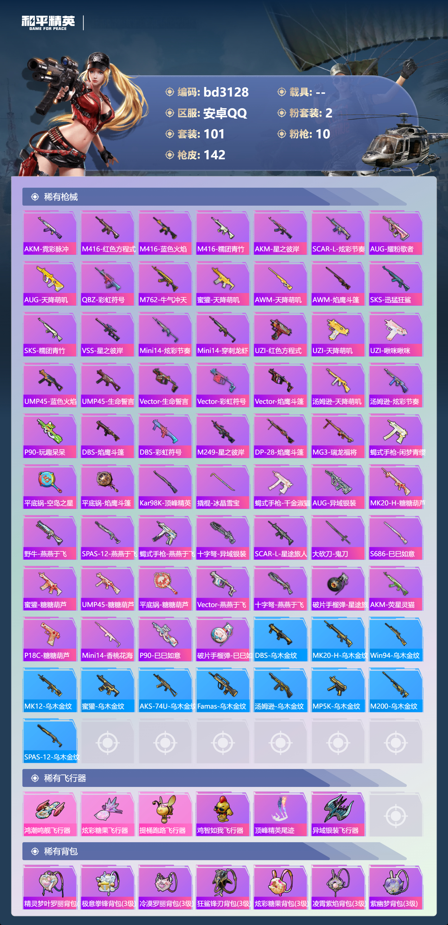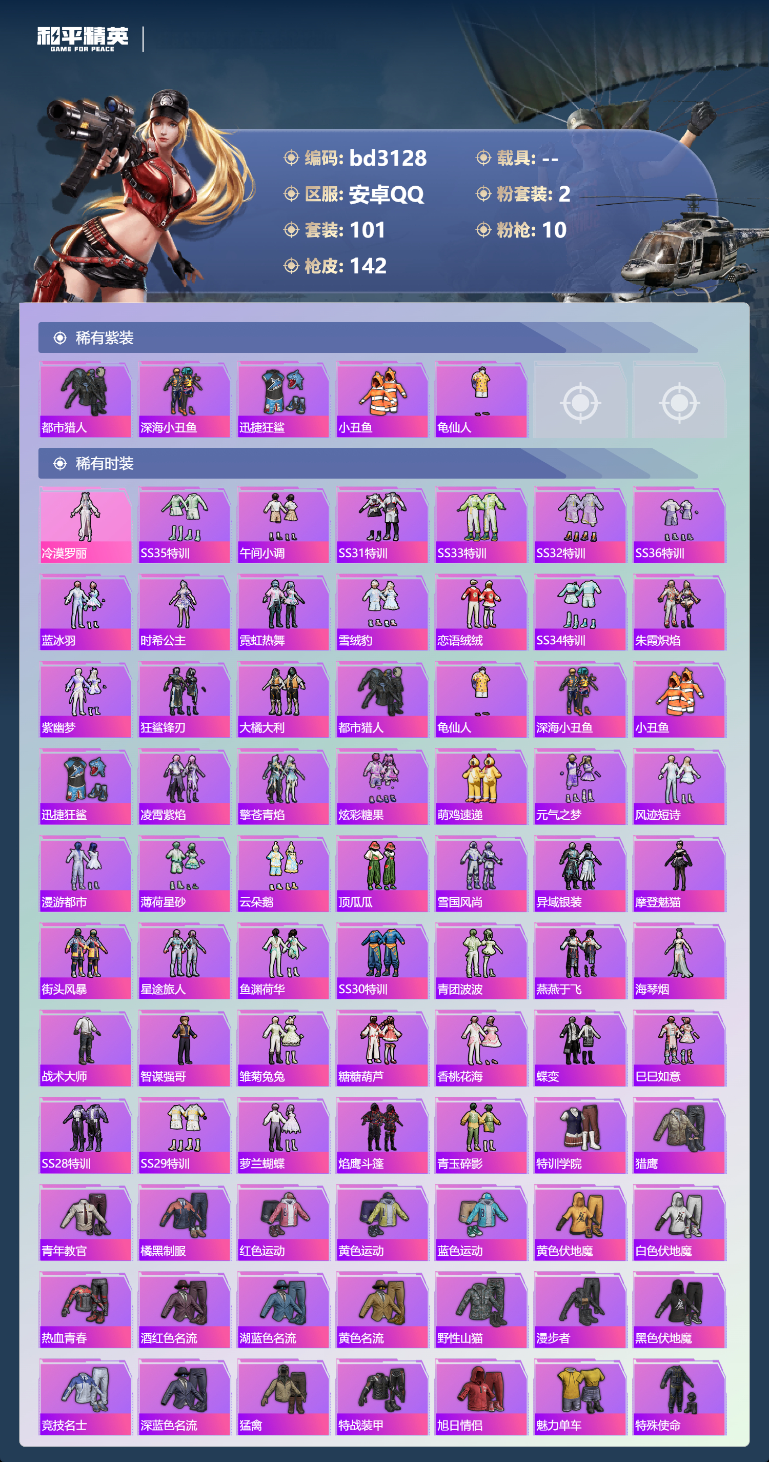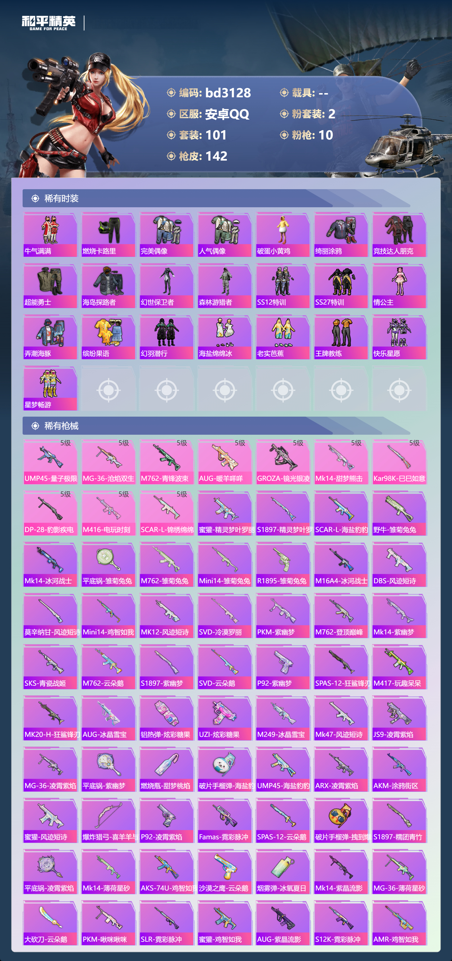 0载具-101套装-142呛皮-安卓手q-9王牌印记-2粉装-10特效呛-39972热力值-101套装-142呛皮-3卓越印记-1传奇印记【2粉装】角色-冷漠罗丽角色-罪夜之冕【10特效呛】aug-暖羊咩咩/5级mg-36-沧焰双生/5级m416-电玩时刻/5级kar98k-巳巳如意/5级ump45-量子极限/5级m762-青锋波束/5级scar-l-锦绣绵绵/5级mk14-甜梦熊击/5级dp-28-豹影疾电/