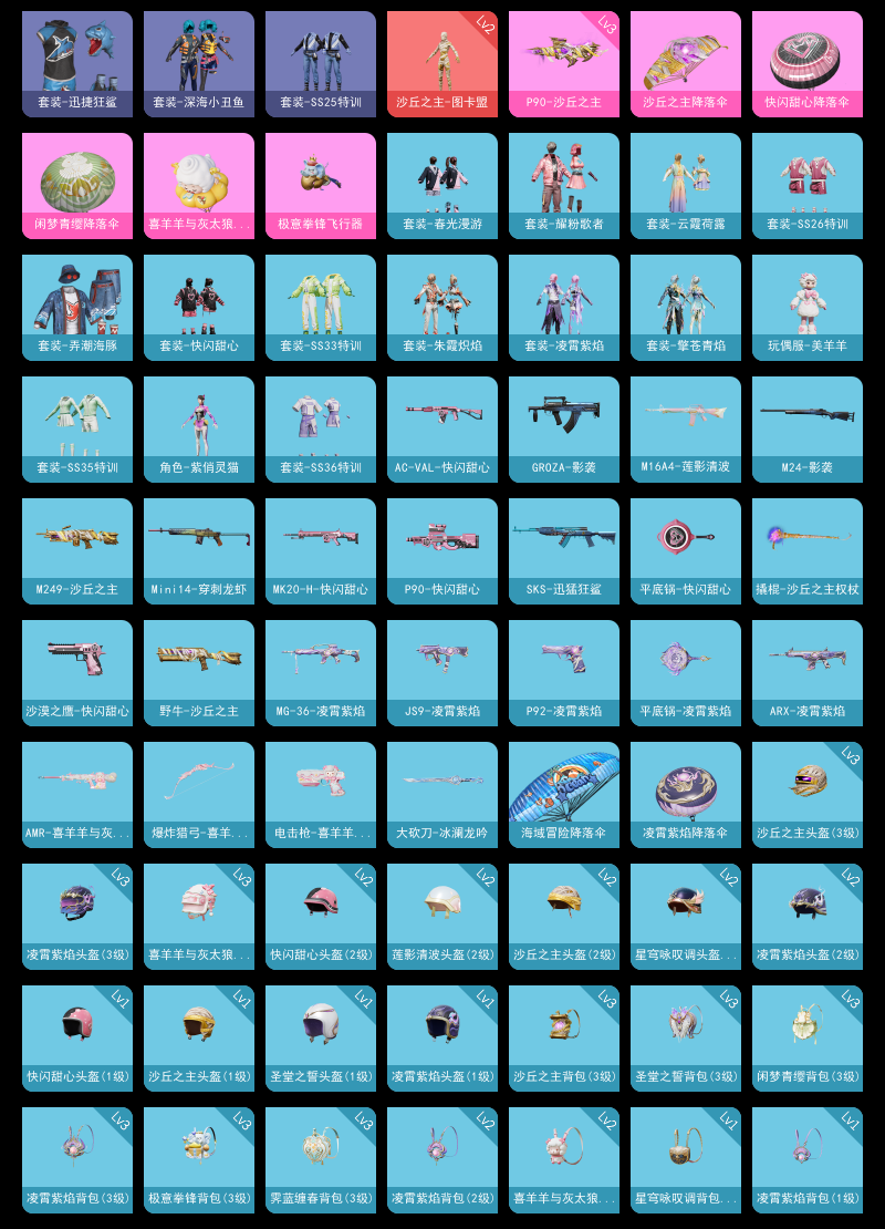 【和平精英】【txhp6548】0粉装,2特效呛,1载具,历史最高段位:超级王牌2星 王牌印记1次 热力值:17400,36套装,57呛械,51装备,21战备;套装:沙丘之主-图卡盟,套装-黑色伏地魔,套装-黄色名流,套装-长空猛禽,套装-魅力单车,套装-幻世战舞者,套装-弄潮海豚,套装-迅捷狂鲨,套装-深海小丑鱼,套装-破蛋小黄鸡,套装-霓虹街区,套装-耀粉歌者,套装-王牌教练,套装-ss25特训,套装-云霞荷露,套装-ss26特训,套装-快闪甜心,套装-春光漫游,套装-空岛之星,套装-街头风暴,角色-紫俏灵猫,套装-ss31特训,套装-ss33特训,套装-ss32特训,套装-青翼流星,玩偶服-美羊羊,套装-元气之梦,套装-ss34特训,套装-擎苍青焰,套装-朱霞炽焰,套装-凌霄紫焰,套装-薄荷星砂,套装-ss35特训,套装-ss36特训,套装-雪国风尚,套装-萌鸡速递;呛皮:aug-异域银装,aug-紫晶流影,akm-涂鸦街区,akm-龙的传人,m16a4-莲影清波,famas-霓彩脉冲,famas-乌木金纹,ace32-冰晶雪宝,groza-影袭,groza-海盐豹豹,ac-val-快闪甜心,m416-糯团青竹,q-彩虹符号,蜜獾-乌木金纹,arx-凌霄紫焰,scar-l-炫彩节奏,win94-乌木金纹,m24-影袭,amr-喜羊羊与灰太狼,amr-乌木金纹,kar98k-彩虹符号,m200-乌木金纹,mk14-薄荷星砂,mk12-乌木金纹,sks-迅猛狂鲨,mk20-h-快闪甜心,mini14-穿刺龙虾,vect-生命誓言,3级p90-沙丘之主,p90-快闪甜心,p90-乌木金纹,uzi-天降萌叽,uzi-啾咪啾咪,ump45-生命誓言,aks-74u-乌木金纹,野牛-沙丘之主,js9-凌霄紫焰,s686-生命誓言,mg3-幻世战舞者,m249-彩虹符号,m249-沙丘之主,mg-36-凌霄紫焰,mg-36-薄荷星砂,5级dp-28-豹影疾电,沙墨之鹦-快闪甜心,p92-凌霄紫焰,电击呛-喜羊羊与灰太狼,平底锅-快闪甜心,平底锅-空岛之星,平底锅-凌霄紫焰,撬棍-沙丘之主权杖,撬棍-冰晶雪宝,大砍刀-冰澜龙吟,破片手留单-呆爆全场,破片手留单-拽到爆炸,爆炸猎弓-喜羊羊与灰太狼,铝热弹-炫彩糖果;降落伞:极意拳锋飞行器,沙丘之主天马; 详情看图1.7w热力值-1红-2特-1车 2级图卡盟 深海小丑鱼 沙丘之主 合金龙骨