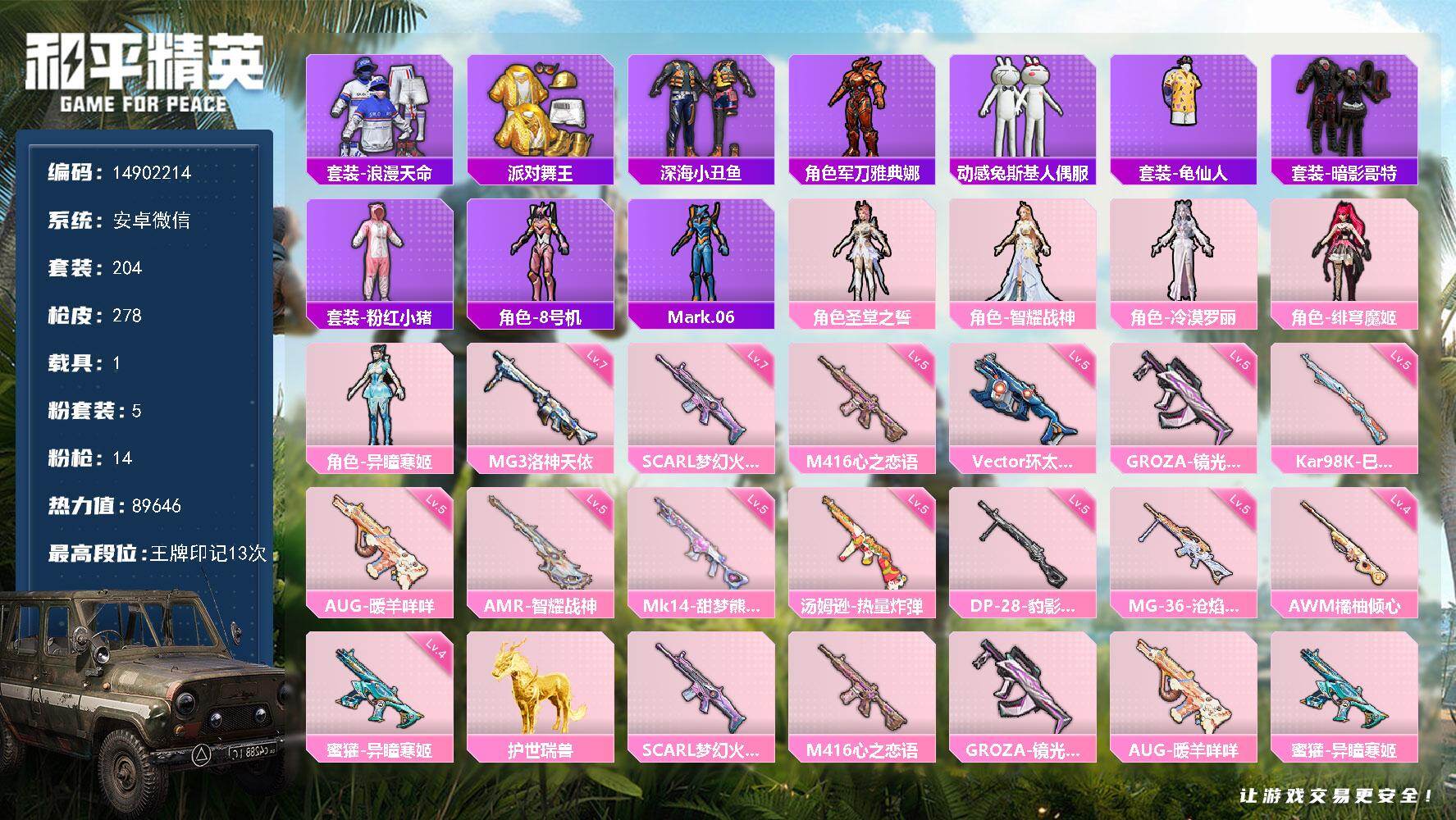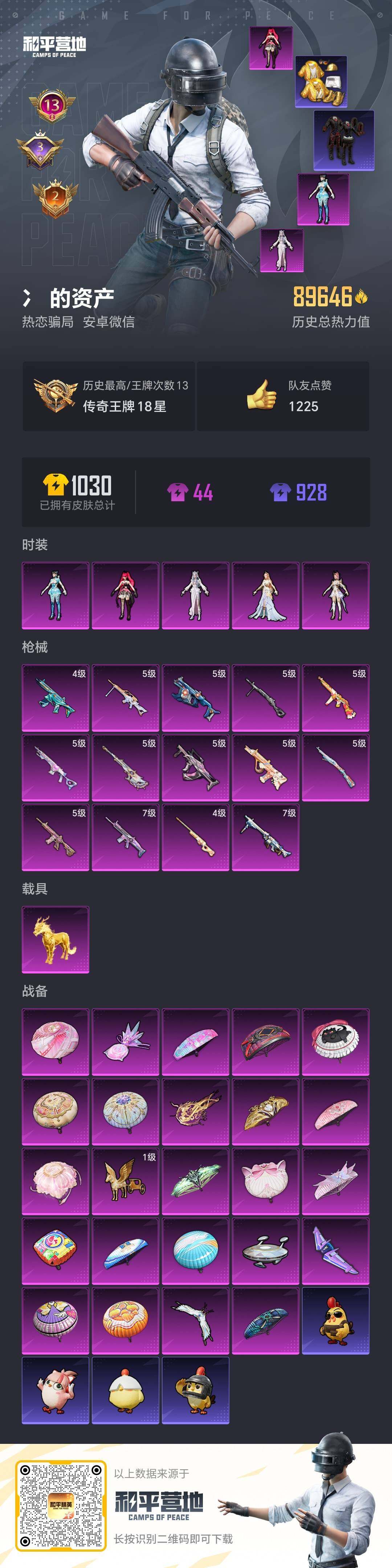 [16053202]df551有二次安卓v-3稀有1载具5粉装14特效呛21热门204套装278呛皮 89646热力值 13印记 历史传奇王牌18星 派对舞王(金靴子) 暗影哥特 scar-l-梦幻火箭 7级 mg3-洛神天依 7级 【3稀有】 浪漫天命 派对舞王 派对舞王(金靴子) 【1载具】 护世瑞兽 【5粉装】 圣堂之誓 绯穹魔姬 异瞳寒姬 冷漠罗丽 智耀战神 【14特效呛】 scar-l-梦幻火箭 7级 m416-心之恋语 5级 kar98k-巳巳如意 5级 awm-橘柚倾心 4级 mg-36-沧焰双生 5级 dp-28-豹影疾电 5级 aug-暖羊咩咩 5级 蜜獾-异瞳寒姬 4级 mk14-甜梦熊击 5级 amr-智耀战神 5级 groza-镜光银凌 5级 汤姆逊-热量炸弹 5级 mg3-洛神天依 7级 vect-环太平洋 5级 【21热门】 8号机 mark.06 龟仙人 浪漫假日 雪山精英 动感兔斯基 鹰眼刺客 奶芙汪汪 深海小丑鱼 lgd战队服 暗影哥特 迪迦奥特曼 醒狮腾龙 团圆交子 瑞龙福将 粉红小猪 狂沙舞者 漫步者 军刀雅典娜 m762-瑞龙福将 汤姆逊-林间仙鹿 【3飞行器】 梦幻火箭飞行器 千面幻镜飞行器 天之羽翼飞行器 【1头盔】 梦幻火箭头盔 【2背包】 梦幻火箭背包 幻影战神背包