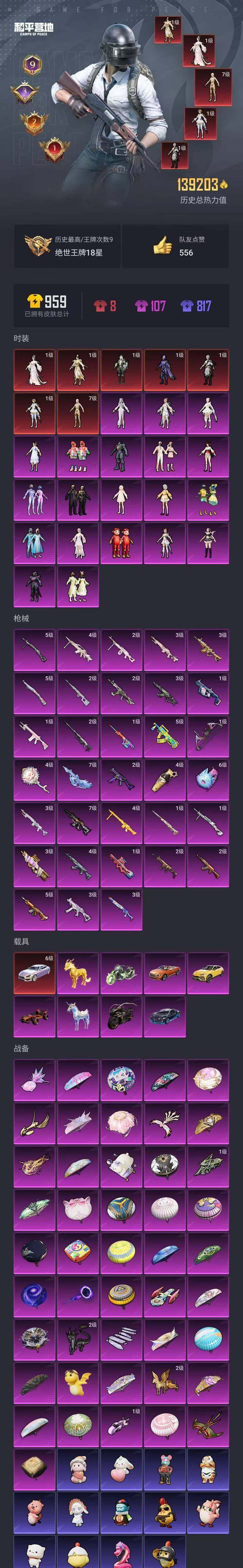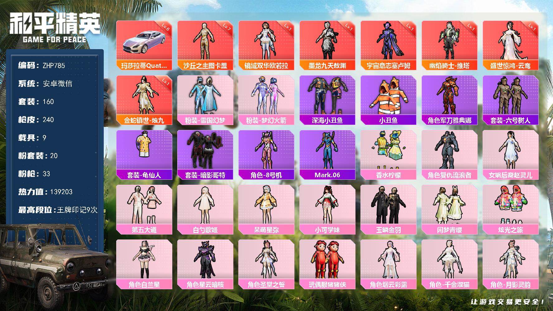 [16053215]送手机!安卓 微信-7神装-20粉装-33特效呛-9载具-13粉色飞行器-139203热力值-9王牌印记-160套装-240呛皮 【红色载具】:玛莎拉蒂quattropte(幻星粉)六级 【红色神装等级】:金蛇镇世-烛九一级,盛世惊鸿-云鸾一级,幽焰骑士-维塔一级,宇宙意志-塞卢姆一级,墨龙九天-敖渊一级,镜域双华-欧若拉一级,沙丘之主-图卡盟七级 【红色角色神装】:金蛇镇世-烛九,盛世惊鸿-云鸾,幽焰骑士-维塔,宇宙意志-塞卢姆,墨龙九天-敖渊,镜域双华-欧若拉,沙丘之主-图卡盟 【热门品类】:粉装-雪国幻梦,粉装-梦幻火箭,套装-深海小丑鱼,套装-小丑鱼,角色-军刀雅典娜,套装-六号树人,套装-龟仙人,套装-暗影哥特,角色-8号机,角色-mark.06 【粉色套装】:粉装-雪国幻梦,粉装-梦幻火箭,粉装-香水柠檬,角色-复仇流浪者,女娲后裔-赵灵儿,粉装-第五大道,角色-白勺歌姬,角色-呆萌星弥,角色-小可学妹,粉装-玉鳞金羽,粉装-闲梦青缨,粉装-炫光之旅,角色-白兰星,角色-星云暗核,角色-圣堂之誓,玩偶服-猪猪侠,角色-烟云彩露,角色-千金淑猫,角色-月影灵韵,角色-冷漠罗丽 【粉色呛皮等级】:akm-盖世英雄二级,akm-幽焰骑士三级,scar-l-天蓬元帅二级,scar-l-金蛇镇世三级,m416-至情至圣五级,m416-墨龙九天七级,groza-香水柠檬五级,aug-星梦奇缘七级,m762-激战未来四级,ump45-玉魂晶魄三级,ump45-宇宙意志二级,vect-环太平洋一级,aks-74u-信仰神谕二级,p90-能量风暴一级,p90-沙丘之主三级,kar98k-巳巳如意五级,m24-镜域双华一级,mk14-精灵梦叶罗丽三级,mk14-盛世惊鸿三级,amr-炫光之旅一级,m417-第五大道一级,m200-玉鳞金羽二级,svd-月影灵韵二级,spas-12-音爆索尼克三级,dp-28-圣堂之誓一级,dp-28-豹影疾电五级,mg3-酷泡奶龙四级,pkm-江南烟雨二级,mg-36-幻梦之森四级,燃点复合弓-时空协奏一级,平底锅-林间仙鹿四级 【粉色载具】:兰博基尼urus(明艳黄),玛莎拉