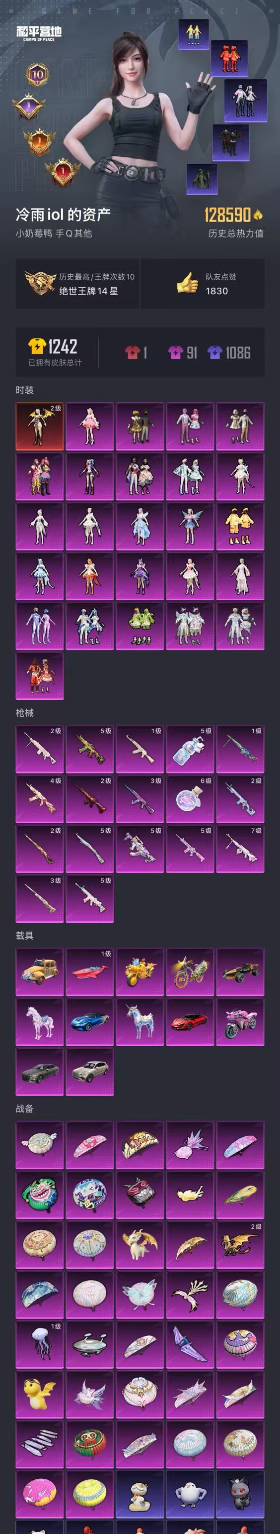 【和平精英】【lyhp20789】25粉装,17特效呛,12载具,历史最高段位:绝世王牌14星 王牌印记10次 热力值:128590,227套装,341呛械,448装备,183战备;套装:圣域龙灵-瑞拉,套装-甜心巧克力,套装-宝贝奶油派,套装-天使彩虹糖,套装-梦幻火箭,套装-缤纷油彩,套装-锦绣火鲤,套装-彩虹鹿灵,套装-山涧鹿灵,套装-恐龙拽拽,套装-未来歌姬,套装-憨憨奶龙,角色-烟云彩露,角色-电磁星,角色-小蓝,角色-美雪,角色-美琪,角色-严莉莉,角色-星梦奇缘,角色-千金淑猫,角色-樱桃泡泡,角色-女娲灵识,角色-晶梦幻蝶,套装-雪月幻音,角色-狂魅哈莉,套装-星穹咏叹调,套装-黄色伏地魔,套装-白色伏地魔,套装-黑色伏地魔,套装-冰川格斗者,套装-竞技名士,套装-长空猛禽,套装-竞技勇士朋克,套装-蓝色守护者,套装-冷焰舞者,套装-刚毅裁决者,套装-特战装甲,套装-战地菁英,套装-特殊使命,套装-灰色格斗者,套装-甜蜜告白,套装-春日漫步,套装-完美偶像,套装-千禧之恋,套装-神秘领域,套装-绮丽涂鸦,套装-沙漠兵团,套装-丛林猎人,套装-ss2特训,套装-雪山精英,套装-酷潮明星,套装-传奇侦探,套装-幻世战舞者,套装-暗影哥特,套装-甜蜜熊情侣,套装-青涩时光,套装-龙魂突击队,套装-冰川特警,套装-格斗先锋,套装-太极红客,套装-麻辣教官,套装-粉红小猪,套装-疯狂小兔子,套装-深蓝冒险家,套装-迷域探索者,套装-ss5特训,套装-圣诞大吉,套装-金鼠迎春,套装-军械专家,套装-北国孤狼,套装-ss6特训,套装-拳皇97草薙京,套装-炽焰拳师,套装-格斗专家,套装-奇迹天团,套装-仓鼠灰灰,套装-玲珑飞花,套装-跃动心情,套装-ss7特训,套装-黑色刀锋,套装-核芯基因,套装-精神漫游,套装-霓虹街区,套装-罗小黑,套装-潮萌小黄鸭,套装-ss8特训,套装-神秘黑猫,套装-白熊同盟,套装-萌黄之夏,套装-夏日音浪,套装-ss9特训,套装-神秘舞者,套装-丝绸行者,套装-探宝勇士,套装-牛气满满,套装-ss11特训,套装-诡面顽熊,套装-青春冒险家,套装-潮流游乐家,套装-朱雀圣者,套装-原初圣火,套装-逆风勇士,套装-萌趣颜团子,套装-特种颜团子,套装-战术大师,套装-ss12特训,套装-牛气冲天,套装-ss18特训,套装-闪金天王,套装-镭射皇者,套装-银白舞王,套装-暗影爵士,套装-治愈之星,套装-科技之星,套装-飞行日记,套装-ss13特训,套装-曼妙人鱼,套装-热情海星,套装-纯真浪花,套装-ss14特训,套装-吉莉礼服,套装-ss15特训,套装-ss16特训,套装-暴风机械师,套装-时空追击者,套装-ss17特训,套装-醒狮腾龙,套装-瑞龙福将,套装-团圆交子,套装-福星高照,套装-虎虎生威吉莉,套装-异彩先驱,套装-霓虹极客,套装-空投萌叽,套装-ss19特训,套装-兔兔白日梦,套装-浓情蜜辣,套装-飞驰魅影,套装-音速流光,套装-ss20特训,套装-甜心亚梦,套装-虚音幻奏,套装-ss21特训,套装-萌趣咩咩,套装-娇憨猪猪,套装-红熊茄茄,套装-酸甜橘柚,套装-玉兔迎春,套装-ss22特训,套装-轻风白浪,套装-绯格组合,套装-ss23特训,套装-糯粉咩咩,套装-龟仙人,套装-ss25特训,套装-元气发射,套装-香桃花海,套装-童真绒兔,套装-傲娇队长,套装-焰鹰斗篷,套装-幽夜迷踪,套装-幻羽潜行,套装-ss27特训,套装-恋语绒绒,套装-老实芭蕉,套装-ss28特训,角色-蝶吟花词,角色-湖雨初晴,套装暗影刺翼,玩偶服-卖崽青蛙,角色-粉雾星云,角色-白光莹,角色-情公主,角色-冰公主,套装-新风雅兰,套装-街头风暴,套装-海盐绵绵冰,套装-小熊娃娃,套装-ss29特训,套装-雏菊兔兔,套装-萝兰蝴蝶,角色-紫俏灵猫,套装-火种守卫者,角色-蜜桃派对,角色-都市丽猫,套装-ss30特训,套装-青团波波,套装-棉花软糖,套装-暗夜风云,套装-糖糖葫芦,套装-萌萌史莱姆,套装-蓝调潮影,套装-纯白跃动,套装-诡诞巡游,套装-ss31特训,套装-鱼渊荷华,套装-石蕴玉辉,套装-燕燕于飞,套装-晶灵使者,角色-瑰梦爱神,套装-紫幽梦,套装-粉恋花,套装-晶辉守护,套装-ss33特训,套装-云朵鹅,套装-ss32特训,套装-彩虹兔,套装-青翼流星,套装-樱梦幻音,套装-蓝冰羽,套装-雪绒豹,套装-混沌火种,套装-大橘大利,套装-极速光影,套装-星渊小夜曲,套装-霓虹热舞,套装-炫彩糖果,套装-星影赞美诗,套装-ss34特训,套装-朱霞炽焰,套装-ss35特训,玩偶服-小熊虫,套装-阳光菠萝,角色-杯旋调茶师,套装-ss36特训,角色-云端星象师,套装-雪国风尚;呛皮:ac-val-甜心亚梦,ac-val-乌木金纹,3级akm-炫紫旋律,1级akm-白勺歌姬,akm-灼热熔岩,akm-生命誓言,akm-破晓战魂,akm-霓虹街区,akm-夜灯,akm-彩虹符号,akm-萌趣颜团子,akm-虎虎生威,akm-江南烟雨,akm-砺玉逐花,akm-乌木金纹,m16a4-蓝色火焰,m16a4-红色方程式,m16a4-夜灯,m16a4-甜心亚梦,m16a4-幻世战舞者,m16a4-冰河战士,m16a4-乌木金纹,m762-绯红前夜,m762-诡娃娃,m762-甜心宝贝,m762-拳皇97,m762-牛气冲天,m762-镭射皇者,m762-瑞龙福将,m762-第五大道,m762-雏菊兔兔,m762-云朵鹅,m762-乌木金纹,2级m416-风花雪月,5级m416-电玩时刻,m416-蓝色火焰,m416-绯红前夜,m416-红色方程式,m416-乌木金纹,5级scar-l-锦绣绵绵,scar-l-红色方程式,scar-l-黄金龙骨,scar-l-炫彩节奏,scar-l-暗夜玫瑰,scar-l-玉兔迎春,scar-l-海盐豹豹,scar-l-乌木金纹,scar-l-绿洲时空,5级groza-巴啦啦小魔仙,groza-生命誓言,groza-黑色刀锋,groza-治愈之星,groza-异彩先驱,groza-恐龙拽拽,groza-田园牧歌,groza-晶梦幻蝶,groza-乌木金纹,q-原初圣火,q-飞驰魅影,q-妙趣可丽,q-纯真浪花,q-乌木金纹,蜜獾-娇憨猪猪,蜜獾-垂柳戏鸭,蜜獾-天降萌叽,蜜獾-精灵梦叶罗丽,蜜獾-糖糖葫芦,蜜獾-绯穹魔姬,蜜