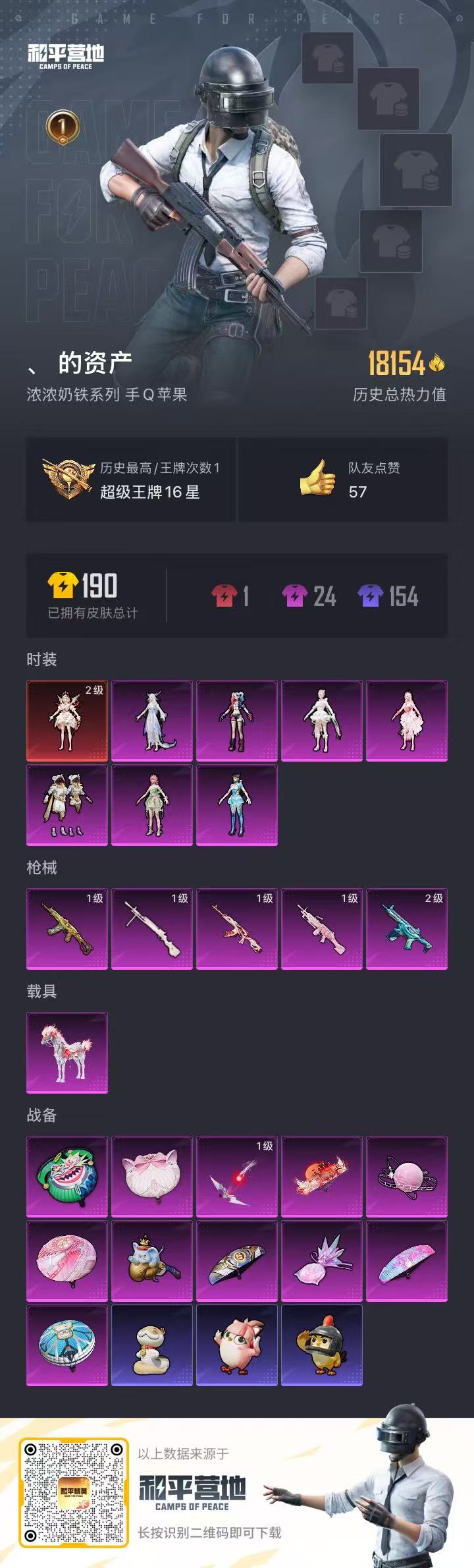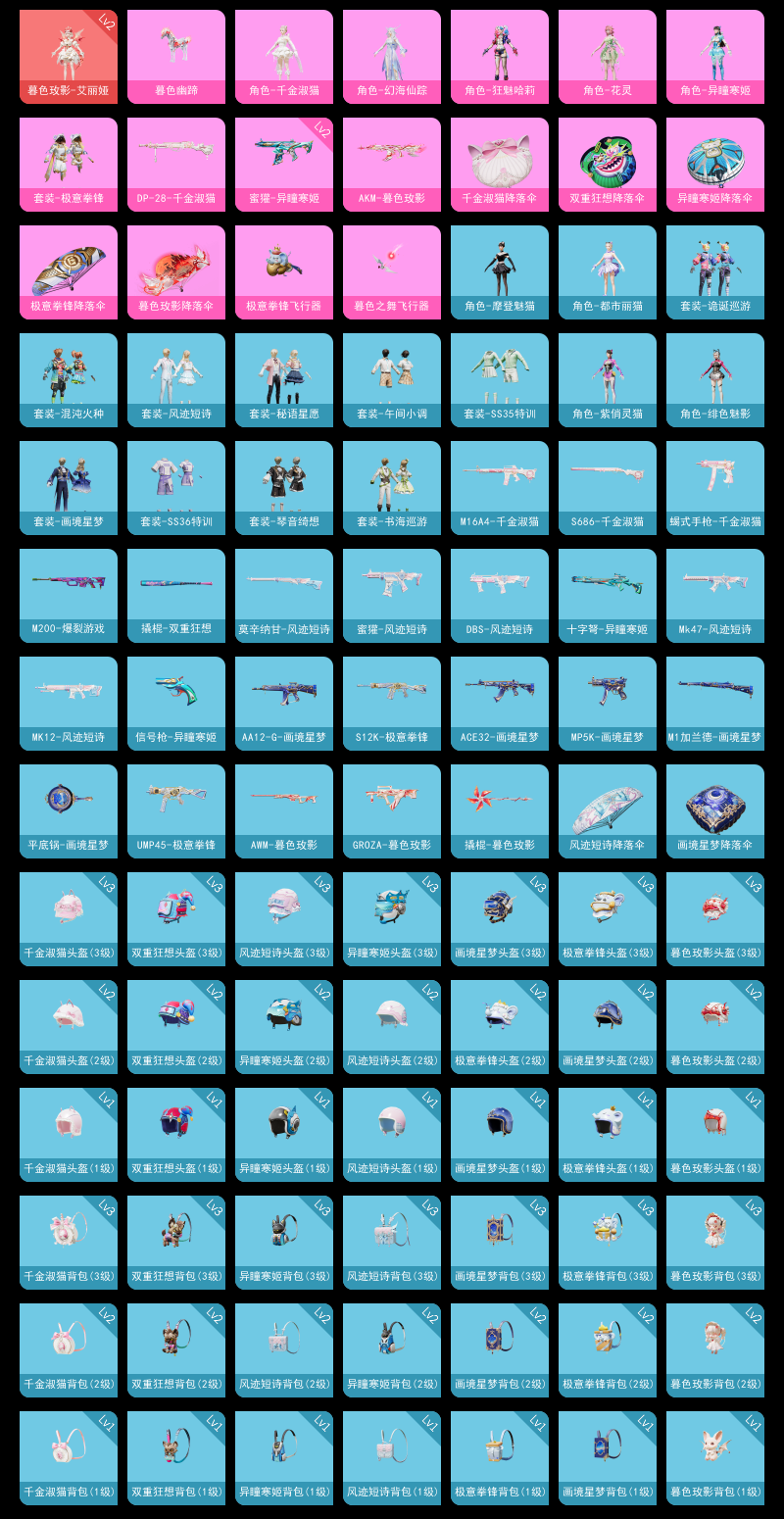 【和平精英】【lyhp20790】7粉装,5特效呛,1载具,历史最高段位:超级王牌16星 王牌印记1次 热力值:18154,32套装,46呛械,76装备,26战备;套装:暮色玫影-艾丽娅,角色-异瞳寒姬,角色-千金淑猫,角色-狂魅哈莉,角色-幻海仙踪,角色-花灵,角色-绝对恒星,套装-极意拳锋,套装-疯狂小兔子,套装-街头风暴,角色-绯色魅影,角色-紫俏灵猫,角色-摩登魅猫,角色-都市丽猫,套装-诡诞巡游,套装-青翼流星,套装-混沌火种,套装-炫彩糖果,套装-ss35特训,套装-午间小调,套装-秘语星愿,套装-风迹短诗,套装-琴音绮想,角色-超感刻度,套装-缠丝流银,套装-画境星梦,套装-书海巡游,角色-甜心蒙太奇,套装-ss36特训,套装-理性主义,套装-雪国风尚,套装-超能元气;呛皮:aug-绝对恒星,aug-冰晶雪宝,m16a4-千金淑猫,mk47-风迹短诗,ace32-画境星梦,ace32-冰晶雪宝,1级akm-暮色玫影,2级蜜獾-异瞳寒姬,蜜獾-风迹短诗,m762-登顶巅峰,groza-暮色玫影,m200-爆裂游戏,莫辛纳甘-风迹短诗,win94-乌木金纹,awm-暮色玫影,m1加兰德-画境星梦,mk12-风迹短诗,mk12-乌木金纹,mk20-h-狂鲨锋刃,mp5k-画境星梦,1级aks-74u-森灵之息,汤姆逊-天降萌叽,ump45-极意拳锋,uzi-炫彩糖果,s686-彩虹符号,s686-千金淑猫,s12k-幻世战舞者,s12k-极意拳锋,spas-12-狂鲨锋刃,aa12-g-画境星梦,dbs-风迹短诗,1级m249-绝对恒星,m249-冰晶雪宝,1级dp-28-千金淑猫,dp-28-彩虹符号,mg-36-薄荷星砂,信号呛-异瞳寒姬,蝎式手呛-千金淑猫,撬棍-双重狂想,撬棍-暮色玫影,撬棍-冰晶雪宝,平底锅-画境星梦,铝热弹-炫彩糖果,十子怒-异瞳寒姬,突击盾牌-绝对恒星,破片手留单-爆破雪人;载具:暮色幽蹄;降落伞:炫彩糖果飞行器,绝对恒星飞行器,极意拳锋飞行器,暮色之舞飞行器,狂鲨锋刃飞行器,登顶巅峰飞行器; 详情看图7粉5特效呛1载具 2级艾丽娅 狂魅哈莉
