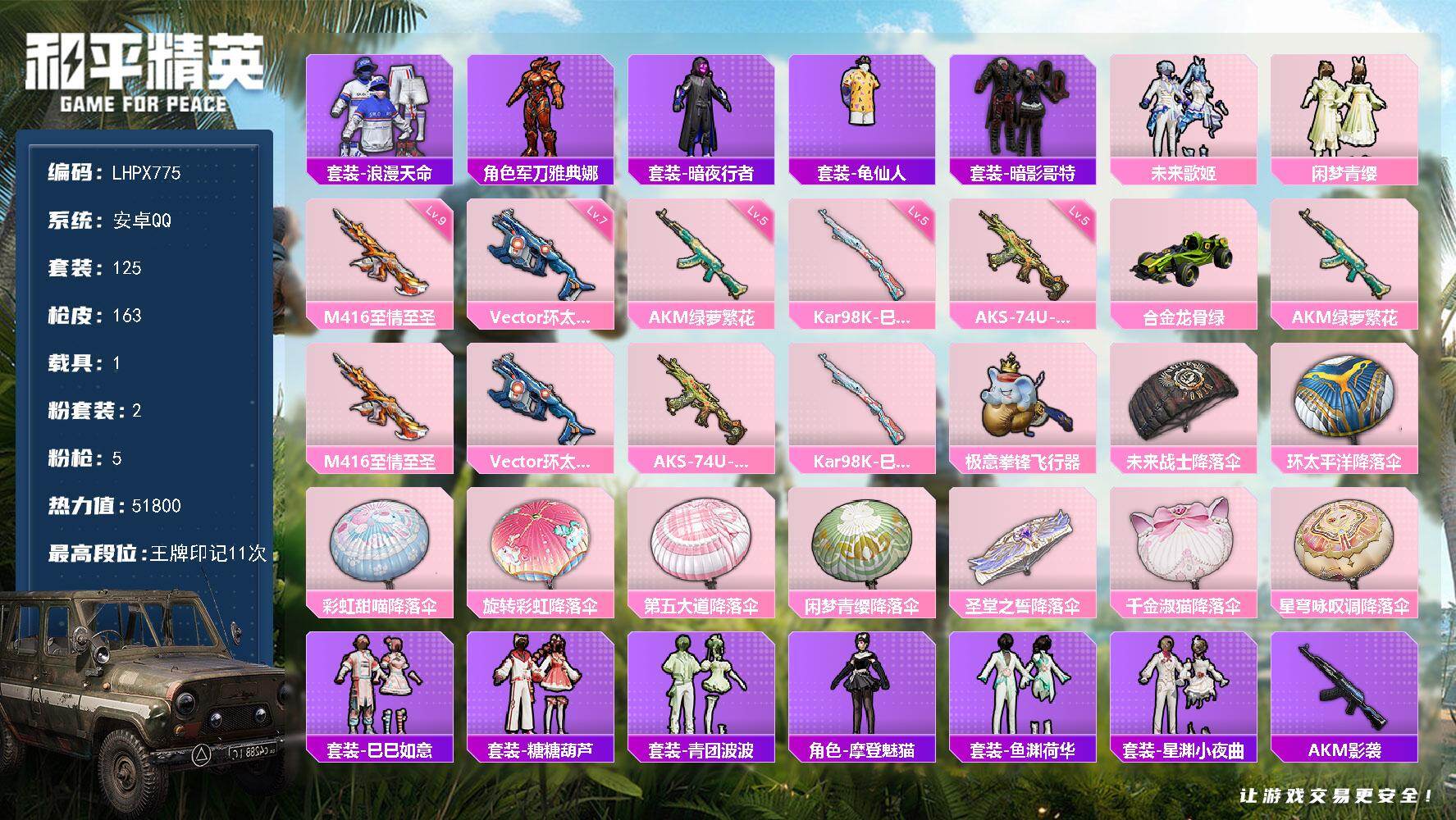 [16063297]【特价出售/店主推荐】安卓 手q-2粉装-5特效呛-1载具-1粉色飞行器-51800热力值-11王牌印记-125套装-163呛皮 【热门品类】:套装-浪漫天命,角色-军刀雅典娜,套装-暗夜行者,套装-龟仙人,套装-暗影哥特 【粉色套装】:粉装-未来歌姬,粉装-闲梦青缨 【粉色呛皮等级】:akm-绿萝繁花五级,m416-至情至圣九级,vect-环太平洋七级,aks-74u-森灵之息五级,kar98k-巳巳如意五级 【粉色载具】:合金龙骨(绿) 【粉色呛皮】:akm-绿萝繁花,m416-至情至圣,vect-环太平洋,aks-74u-森灵之息,kar98k-巳巳如意 【粉色飞行器】:极意拳锋飞行器 【粉色降落伞】:未来战士降落伞,环太平洋降落伞,彩虹甜喵降落伞,旋转彩虹降落伞,第五大道降落伞,闲梦青缨降落伞,圣堂之誓降落伞,千金淑猫降落伞,星穹咏叹调降落伞,炫彩糖果降落伞 【稀有套装】:套装-龟仙人,套装-巳巳如意,套装-雪国风尚,套装-糖糖葫芦,套装-青团波波,角色-摩登魅猫,套装-鱼渊荷华,套装-星渊小夜曲 【稀有呛皮】:akm-影袭,akm-环太平洋,akm-霓虹街区,akm-龙的传人,m16a4-幻世战舞者,m16a4-甜心亚梦,scar-l-夜灯,scar-l-未来战士,scar-l-炫彩节奏,scar-l-玉兔迎春,m416-糯团青竹,m416-诡夜天鹅,groza-彩虹符号,groza-影袭,groza-懵萌河马,groza-田园牧歌,aug-天降萌叽,aug-闲梦青缨,q-未来歌姬,q-银碳小老虎,m762-动感兔斯基,m762-天降萌叽,m762-第五大道,mk47-妙红点点,g36c-六号树人,g36c-懵萌河马,ac-val-天降萌叽,ac-val-快闪甜心,ac-val-甜心亚梦,蜜獾-天降萌叽,蜜獾-娇憨猪猪,uzi-啾咪啾咪,uzi-天降萌叽,uzi-娇憨猪猪,uzi-影袭,uzi-金风玉露,ump45-涂山之恋,ump45-炫光之旅,vect-生命誓言,vect-田园牧歌,汤姆逊-天降萌叽,汤姆逊-环太平洋,p90-倾城蜜语,p90-快闪甜心,p90-飞驰魅影,p90-巳巳如意,kar98k-2b战斗服款,kar98k-影袭,kar98k-星穹咏叹调,m24-影袭,m24-奇异狩猎者,awm-圣堂
