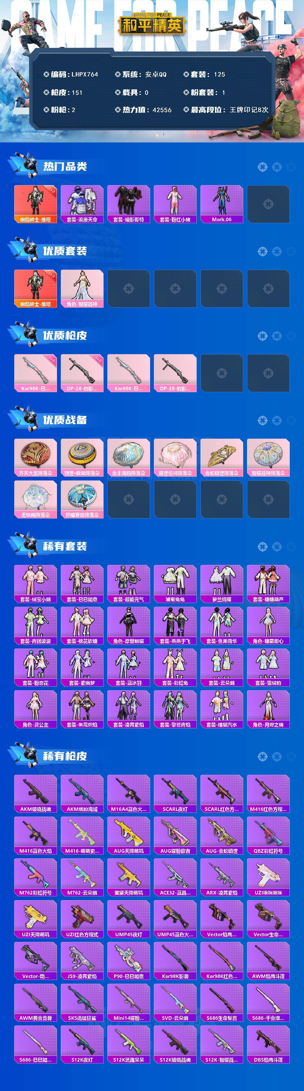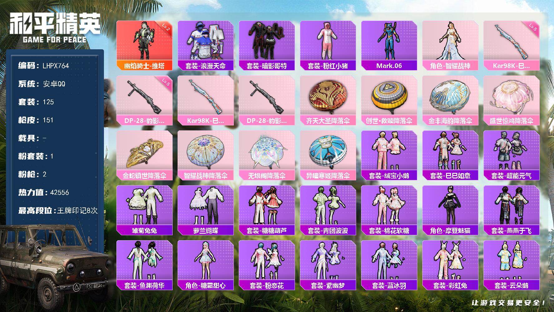 [16063343]【特价出售/店主推荐】安卓 手q-1神装-1粉装-2特效呛-0载具-1粉色飞行器-42556热力值-8王牌印记-125套装-151呛皮 【红色神装等级】:幽焰骑士-维塔二级 【红色角色神装】:幽焰骑士-维塔 【热门品类】:套装-浪漫天命,套装-暗影哥特,套装-粉红小猪,角色-mark.06 【粉色套装】:角色-智耀战神 【粉色呛皮等级】:kar98k-巳巳如意五级,dp-28-豹影疾电五级 【粉色呛皮】:kar98k-巳巳如意,dp-28-豹影疾电 【粉色降落伞】:齐天大圣降落伞,创世·救赎降落伞,金丰海韵降落伞,盛世惊鸿降落伞,金蛇镇世降落伞,智耀战神降落伞,无垠阁降落伞,异瞳寒姬降落伞,炫彩糖果降落伞 【稀有套装】:套装-绒宝小鹅,套装-巳巳如意,套装-超能元气,套装-雪国风尚,套装-炫彩糖果,套装-雏菊兔兔,套装-萝兰蝴蝶,套装-糖糖葫芦,套装-青团波波,套装-棉花软糖,角色-摩登魅猫,套装-燕燕于飞,套装-鱼渊荷华,角色-糖霜甜心,套装-粉恋花,套装-紫幽梦,套装-蓝冰羽,套装-彩虹兔,套装-云朵鹅,套装-雪绒豹,角色-灵公主,套装-朱霞炽焰,套装-凌霄紫焰,套装-擎苍青焰,套装-橘猫汽水,角色-月烬之祷 【稀有呛皮】:aug-冰晶雪宝,akm-破晓战魂,akm-缤纷海域,m16a4-蓝色火焰,scar-l-夜灯,scar-l-红色方程式,m416-红色方程式,m416-蓝色火焰,m416-萌萌史莱姆,aug-天降萌叽,aug-耀粉歌者,aug-金蛇镇世,q-彩虹符号,m762-彩虹符号,m762-云朵鹅,蜜獾-天降萌叽,ace32-蓝晶绮麟,arx-凌霄紫焰,uzi-啾咪啾咪,uzi-天降萌叽,uzi-红色方程式,ump45-夜灯,ump45-蓝色火焰,vect-焰鹰斗篷,vect-生命誓言,vect-动力核心,js9-凌霄紫焰,p90-巳巳如意,kar98k-影袭,kar98k-红色方程式,awm-焰鹰斗篷,awm-黄金龙骨,sks-迅猛狂鲨,mini14-耀粉歌者,svd-云朵鹅,s686-生命誓言,s686-巳巳如意,s686-千金淑猫,s12k-玩趣呆呆,s12k-破晓战魂,s12k-夜灯,s12k-智耀战神,dbs-焰鹰斗篷,dbs-幻彩电音,spas-12-云朵鹅,m249-彩虹符号,dp-28-焰鹰斗篷,dp-2
