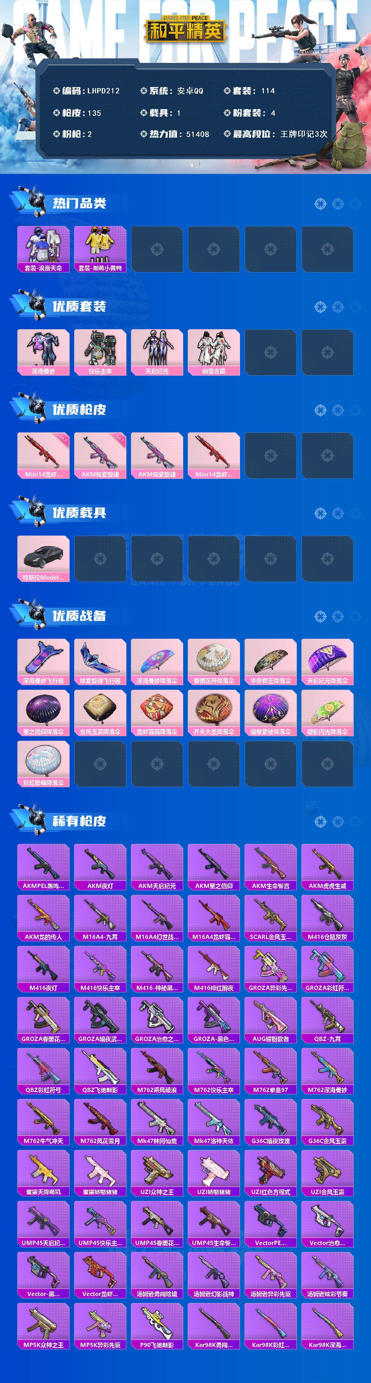 1载具-114套装-135呛皮-【特价出售/店主推荐】安卓 手q-4粉装-2特效呛-1载具-2粉色飞行器-51408热力值-3王牌印记-114套装-135呛皮【热门品类】:套装-浪漫天命,套装-潮萌小黄鸭【粉色套装】:粉装-深海曼妙,粉装-快乐主宰,粉装-天启纪元,粉装-俏雪含霜【粉色呛皮等级】:akm-炫紫旋律七级,mini