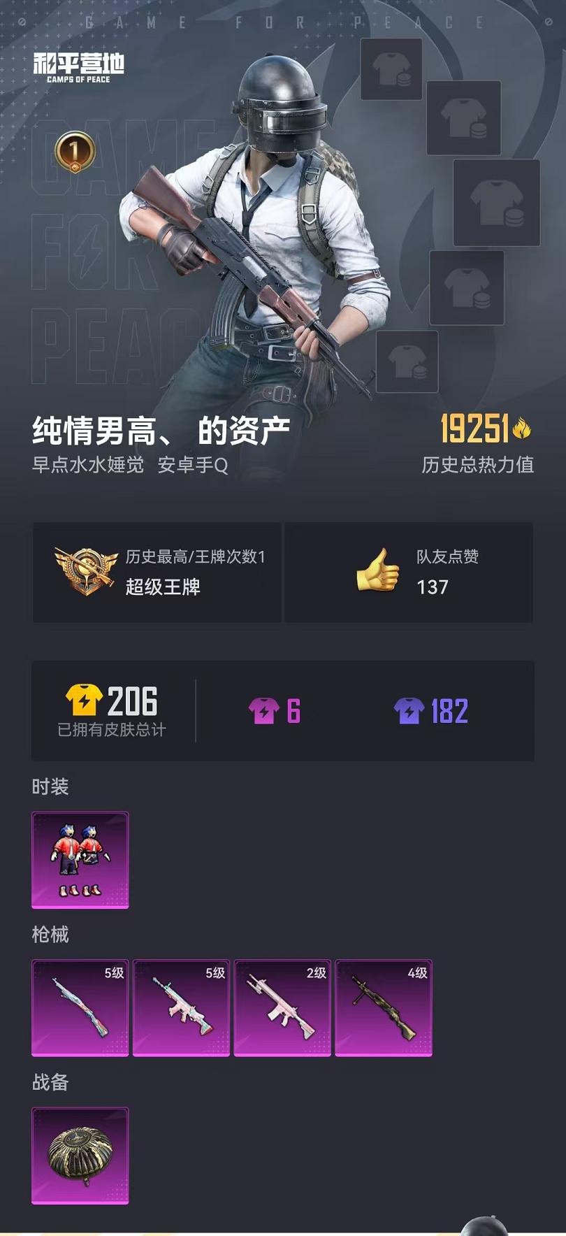 可二次【1粉装4特效呛】 安卓q区-19251热力值-1印记-43套装-72呛皮 【1粉装】 音爆索尼克【4特效呛】 scar-l-锦绣绵绵5级 dp-28-暗夜鎏金4级 m417-第五大道2级 kar98k-巳巳如意5级【4热门】 mg3-乌木金纹 kar98k-彩虹符号 m416-糯团青竹 akm-彩虹符号【1背包】 深海小丑鱼背包 营地id:940184867