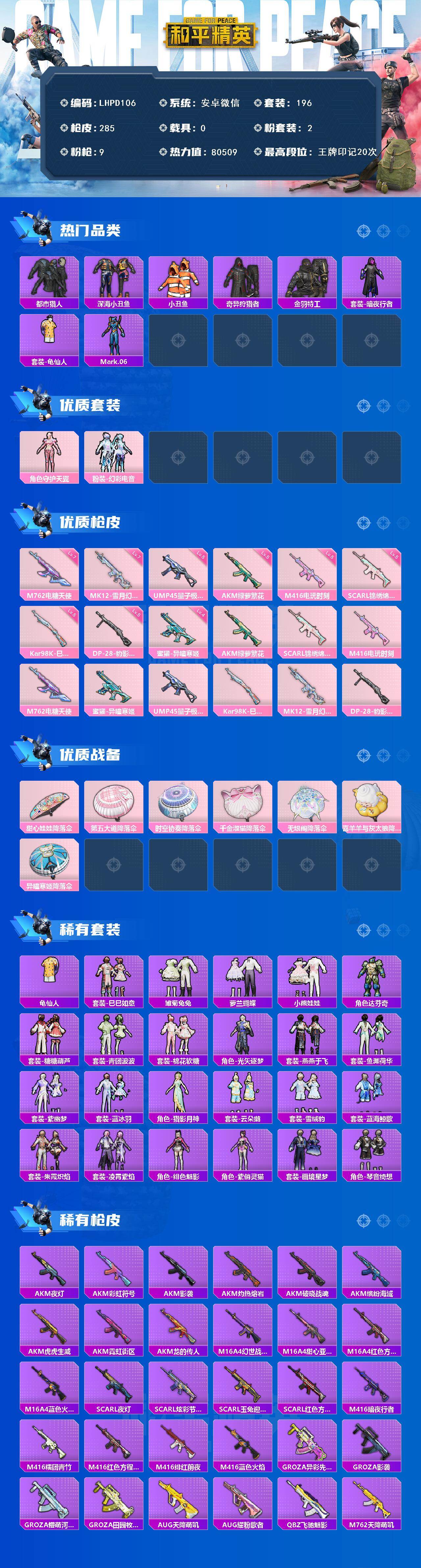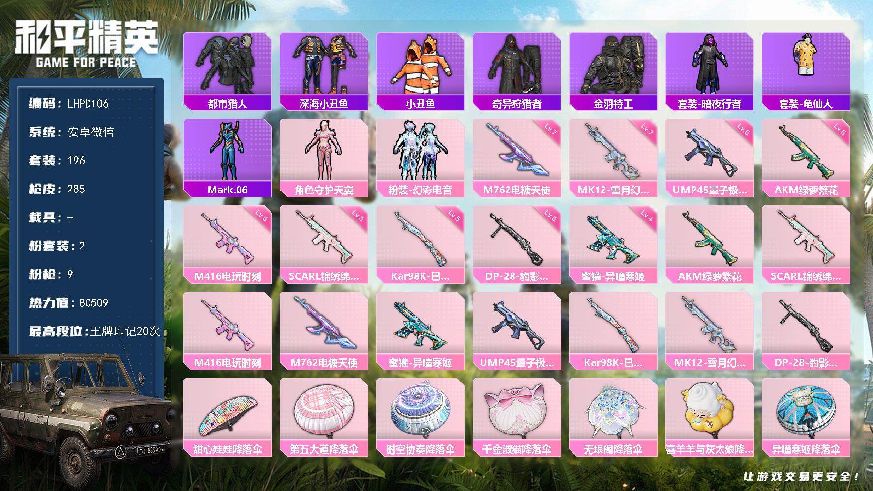 [15946767]【特价出售/店主推荐】安卓 微信-2粉装-9特效呛-0载具-1粉色飞行器-80509热力值-20王牌印记-196套装-285呛皮【热门品类】:套装-都市猎人,套装-深海小丑鱼,套装-小丑鱼,套装-奇异狩猎者,套装-金羽特工,套装-暗夜行者,套装-龟仙人,角色-mark.06【粉色套装】:角色-守护天翼,粉装-幻彩电音【粉色呛皮等级】:akm-绿萝繁花五级,scar-l-锦绣绵绵五级,m416-电玩时刻五级,m762-电糖天使七级,蜜獾-异瞳寒姬四级,ump45-量子极限五级,kar98k-巳巳如意五级,mk12-雪月幻音七级,dp-28-豹影疾电五级【粉色呛皮】:akm-绿萝繁花,scar-l-锦绣绵绵,m416-电玩时刻,m762-电糖天使,蜜獾-异瞳寒姬,ump45-量子极限,kar98k-巳巳如意,mk12-雪月幻音,dp-28-豹影疾电