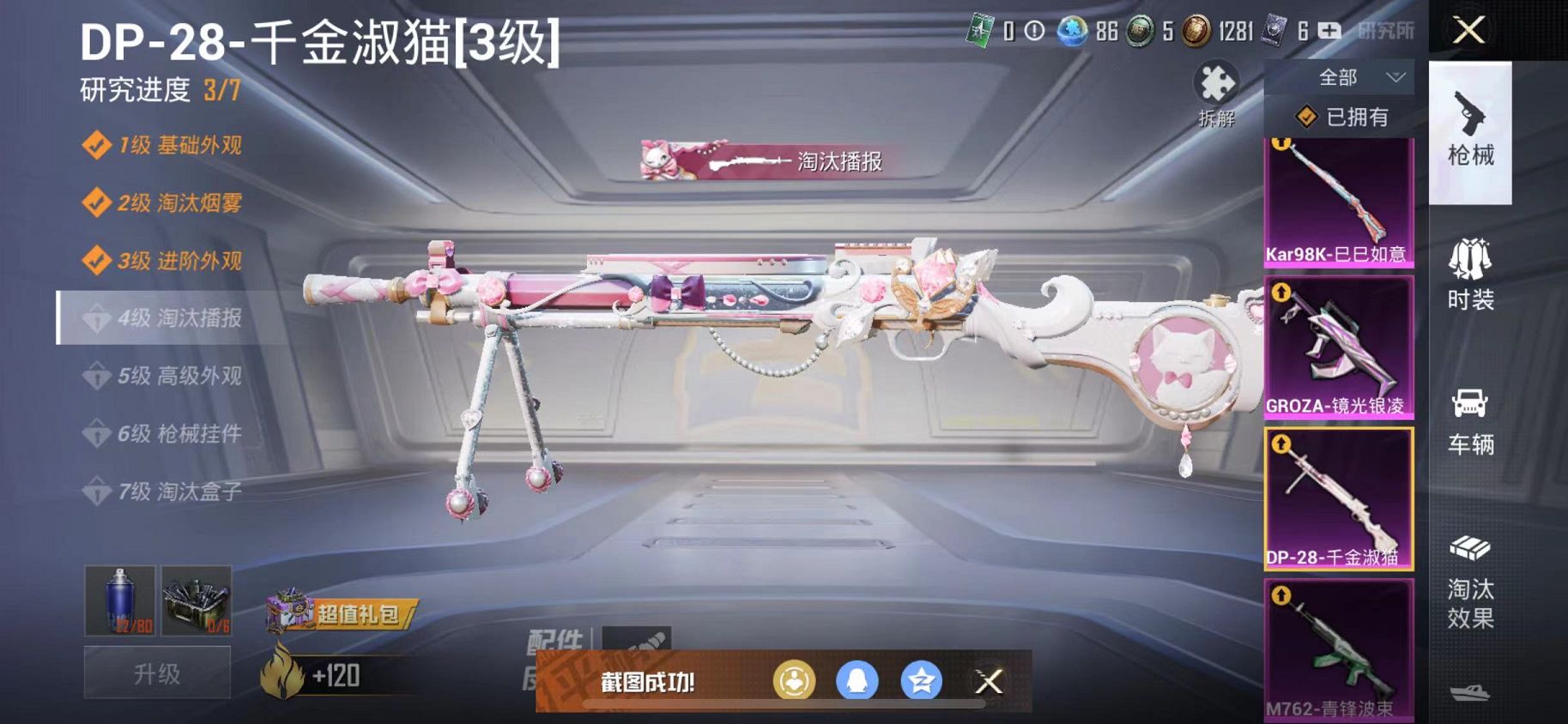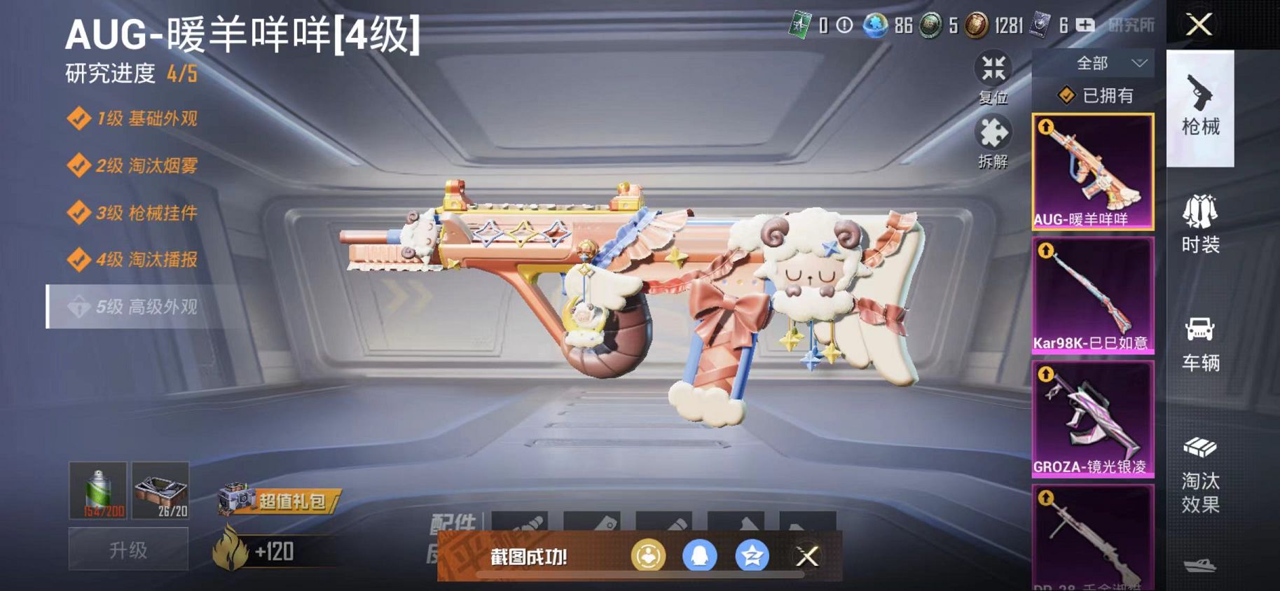 【1红装2级维塔2粉装5特效呛1载具】 苹果q区-32781热力值-5印记-61套装-105呛皮 【1红装】 幽焰骑士-维塔2级【1载具】 布加迪威龙海洋蓝【2粉装】 蜜语绒猫【5特效呛】 m762-青锋波束5级 dp-28-千金淑猫3级 groza-镜光银凌4级 kar98k-巳巳如意5级 aug-暖羊咩咩4级【4热门】 mark.06 mg3-乌木金纹 mini14-炫彩节奏 m416-糯团青竹【4飞行器】 深渊漩涡飞行器 祥瑞起舞飞行器 万象金身飞行器 彩虹独角兽飞行器 营地id:936980237