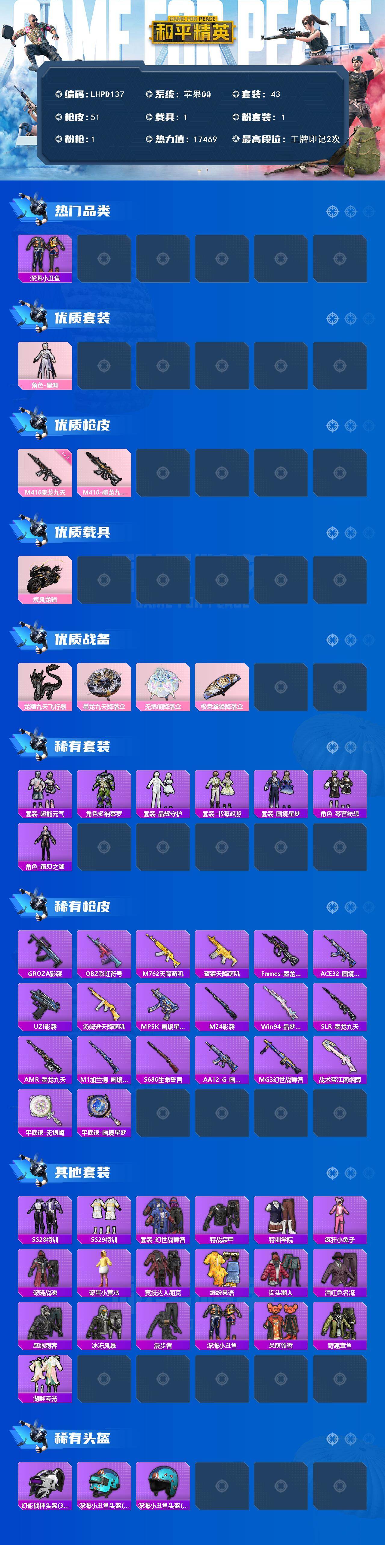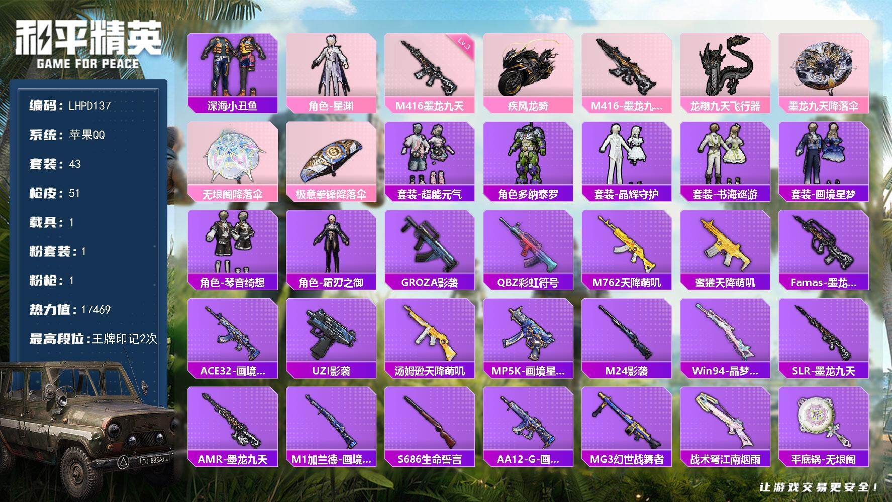 [15759718]【特价出售/店主推荐】苹果 手q-1粉装-1特效呛-1载具-2粉色飞行器-17469热力值-2王牌印记-43套装-51呛皮【热门品类】:套装-深海小丑鱼【粉色套装】:角色-星渊【粉色呛皮等级】:m416-墨龙九天三级【粉色载具】:疾风龙骑【粉色呛皮】:m416-墨龙九天【粉色飞行器】:龙翔九天飞行器