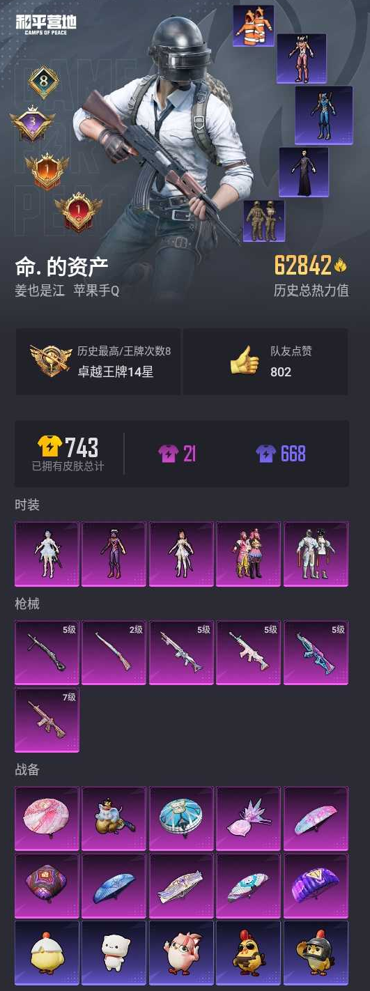 【和平精英】【lyhp20851】5粉装,6特效呛,0载具,历史最高段位:卓越王牌14星 王牌印记8次 热力值:62842,179套装,198呛械,230装备,108战备;套装:套装-智能音符,套装-缤纷油彩,角色-圣堂之誓,角色-初号机 觉醒ver.,角色-冰魄,套装-特训学院,套装-猎鹰,套装-青年教官,套装-橘黑制服,套装-红色运动,套装-黄色运动,套装-蓝色运动,套装-黄色伏地魔,套装-白色伏地魔,套装-黑色伏地魔,套装-骑行爱好者,套装-竞技名士,套装-深蓝色名流,套装-酒红色名流,套装-湖蓝色名流,套装-黄色名流,套装-猛禽,套装-长空猛禽,套装-漫步者,套装-竞技勇士朋克,套装-沙漠探路者,套装-旭日情侣,套装-六六大吉,套装-冷焰舞者,套装-灼焰舞者,套装-特战装甲,套装-青春校园,套装-甜蜜告白,套装-迎春赐吉,套装-龙腾端午,套装-燃烧卡路里,套装-鹰眼刺客,套装-冰冻风暴,套装-完美偶像,套装-人气偶像,套装-街头潮人,套装-蓝彩潮人,套装-魅力单车,套装-绮丽涂鸦,套装-耀眼新星,套装-雪山征服者,套装-坚韧舞者,套装-竞技达人朋克,套装-朋克治安官,套装-夜莺强袭者,套装-都市漫游者,套装-野性战魂,套装-都市魅力,套装-热血青春,套装-沙漠兵团,套装-雪山精英,套装-酷潮明星,套装-传奇侦探,套装-蓝调潮人,套装-甜蜜熊情侣,套装-缤纷果语,套装-龙魂突击队,套装-特种空勤,套装-和平特警,套装-风暴特警,套装-冰川特警,套装-麻辣教官,套装-ss3特训,套装-小丑鱼,套装-东方飞龙,套装-ss4特训,套装-梦魇先生,套装-黑夜传说,套装-破蛋小黄鸡,套装-疯狂小兔子,套装-ss5特训,套装-圣诞大吉,套装-冰原使者,套装-凛冬战士,套装-北国孤狼,套装-ss6特训,套装-炽焰拳师,套装-格斗专家,套装-奇迹天团,套装-蔷薇魔法师,套装-ss7特训,套装-霓虹街区,套装-ss10特训,套装-ss8特训,套装-夏日音浪,套装-ss9特训,套装-牛气满满,套装-ss11特训,套装-白虎圣者,套装-原初圣火,套装-逆风勇士,套装-战术大师,套装-ss12特训,套装-牛气冲天,套装-飞行日记,套装-ss13特训,套装-竞技角斗士,套装-曼妙人鱼,套装-热情海星,套装-纯真浪花,套装-ss14特训,套装-福星高照,套装-雪兔飞飞,套装-ss19特训,套装-飞驰魅影,套装-音速流光,套装-ss20特训,套装-ss21特训,套装-萌趣咩咩,套装-娇憨猪猪,套装-玉兔迎春,套装-ss22特训,套装-田园牧歌,套装-轻风白浪,套装-熠彩粉晶,套装-光之冒险,套装-绯格组合,套装-ss23特训,套装-妙红点点,套装-幻彩翩翩,套装-王牌教练,套装-柠萌假日,套装-ss24特训,套装-龟仙人,套装-ss25特训,套装-龙的传人,套装-冰河战士,套装-ss26特训,套装-快闪甜心,套装-春光漫游,套装-空岛之星,套装-明鸳圣池,套装-贝斯之夜,套装-焰鹰斗篷,套装-幻羽潜行,套装-ss27特训,套装-老实芭蕉,套装-ss28特训,角色-粉雾星云,角色-8号机,角色-mark.06,套装-街头风暴,套装-海盐绵绵冰,套装-蝶变,套装-粉日山川,套装-小熊娃娃,套装-ss29特训,套装-雏菊兔兔,套装-萝兰蝴蝶,套装-ss30特训,套装-ss31特训,角色-海琴烟,套装-巳巳如意,套装-ss32特训,套装-青翼流星,套装-狂鲨锋刃,套装-炫彩糖果,玩偶服-懒羊羊,套装-元气之梦,套装-ss34特训,套装-擎苍青焰,套装-朱霞炽焰,角色-申公豹,套装-凌霄紫焰,套装-ss35特训,套装-午间小调,套装-秘语星愿,套装-风迹短诗,套装-琴音绮想,角色-超感刻度,套装-画境星梦,套装-书海巡游,套装-ss36特训,套装-雪国风尚;呛皮:5级scar-l-锦绣绵绵,scar-l-雷霆特警,scar-l-彩虹符号,scar-l-玉兔迎春,scar-l-海盐豹豹,scar-l-乌木金纹,5级akm-梦之光华,akm-破晓战魂,akm-夜灯,akm-涂鸦街区,akm-彩虹符号,akm-乌木金纹,m762-诡娃娃,m762-拳皇97,m762-牛气冲天,m762-天降萌叽,m762-雏菊兔兔,m762-登顶巅峰,7级m416-心之恋语,m416-蓝色火焰,m416-糯团青竹,m416-乌木金纹,groza-影袭,groza-生命誓言,groza-雷霆特警,groza-恐龙拽拽,groza-田园牧歌,groza-海盐豹豹,groza-乌木金纹,q-诡娃娃,q-原初圣火,q-洛神天依,q-飞驰魅影,q-纯真浪花,q-乌木金纹,m16a4-红色方程式,m16a4-冰河战士,m16a4-乌木金纹,蜜獾-娇憨猪猪,蜜獾-风迹短诗,mk47-乌木金纹,mk47-妙红点点,mk47-风迹短诗,famas-突变脉冲,aug-魔法学院,aug-异域银装,aug-绝对恒星,aug-乌木金纹,g36c-荒野猎神,ac-val-乌木金纹,ac-val-快闪甜心,ace32-画境星梦,ace32-冰晶雪宝,arx-凌霄紫焰,m24-影袭,m24-未来战士,m24-冰封烈焰,m24-乌木金纹,awm-圣堂之誓,awm-焰鹰斗篷,awm-纯真浪花,awm-乌木金纹,2级kar98k-巳巳如意,kar98k-红色方程式,kar98k-影袭,kar98k-炫彩节奏,kar98k-飞驰魅影,莫辛纳甘-乌木金纹,莫辛纳甘-风迹短诗,win94-乌木金纹,m200-乌木金纹,amr-妙红点点,amr-乌木金纹,mini14-生命誓言,mini14-穿刺龙虾,mini14-原初圣火,mini14-旋转彩虹,mini14-涂山之恋,mini14-香桃花海,mini14-雏菊兔兔,mini14-乌木金纹,sks-金玉无双,sks-诡娃娃,sks-炫彩节奏,sks-乌木金纹,m1加兰德-画境星梦,mk20-h-快闪甜心,mk20-h-狂鲨锋刃,mk20-h-乌木金纹,slr-娇憨猪猪,slr-彩虹符号,slr-金丰海韵,5级mk14-精灵梦叶罗丽,mk14-童趣迷兔,mk14-冰河战士,mk12-风迹短诗,mk12-乌木金纹,vss-雷霆特警,vss-未来战士,vss-田园牧歌,uzi-影袭,uzi-娇憨猪猪,uzi-冰河战士,uzi-啾咪啾咪,uzi-炫彩糖果,uzi-乌木金纹,aks-74u-乌木金纹,汤姆逊-奇异狩猎者,汤姆逊-耀粉歌者,汤姆逊-天降萌叽,汤姆逊-纯真浪花,汤姆逊-乌木金纹,ump45-生命誓言,ump45-粉色回忆,ump45-诡娃娃,p90-飞驰魅影,p90-快闪甜心,p90-玩趣呆呆,p90-乌木金纹,vect-生命誓言,vect-彩虹符号,vect-田园牧歌,vect-音爆索尼克,vec