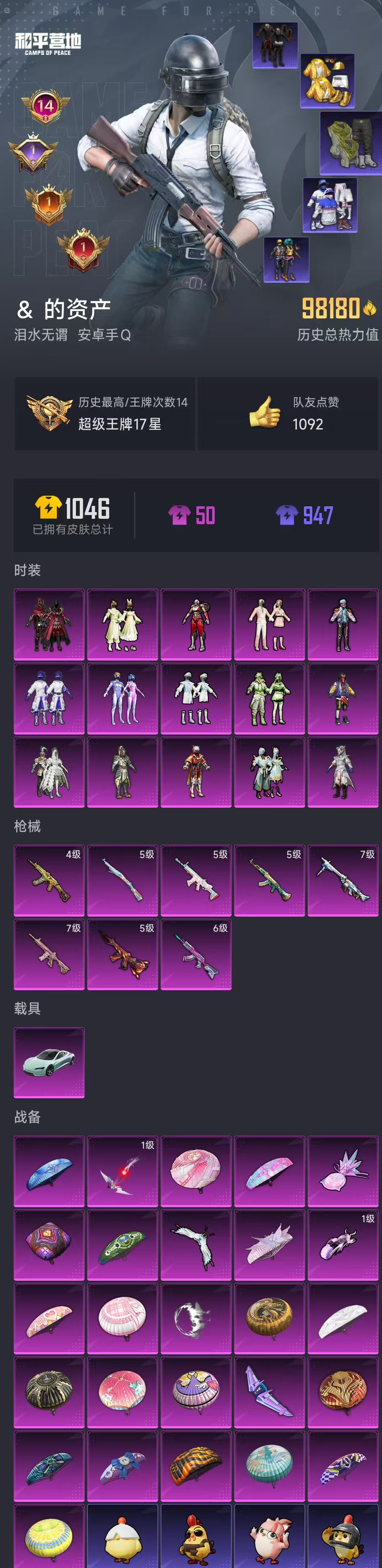 【和平精英】【lyhp20843】15粉装,8特效呛,1载具,历史最高段位:超级王牌17星 王牌印记14次 热力值:98300,237套装,254呛械,347装备,177战备;套装:套装-金曜白虎,套装-梦幻火箭,套装-天禅智恒,套装-彗云及圣,套装-新星烈龙,套装-银刃赛罗,套装-冰霜白皇,套装-炙焰红王,套装-桀骜红莲,套装-绮梦青鸾,套装-碧影闪光,套装-海盐物语,套装-第五大道,套装-闲梦青缨,角色-阿尔茜,套装-特训学院,套装-猎鹰,套装-青年教官,套装-橘黑制服,套装-红色运动,套装-黄色运动,套装-蓝色运动,套装-黄色伏地魔,套装-白色伏地魔,套装-黑色伏地魔,套装-冰川格斗者,套装-竞技名士,套装-深蓝色名流,套装-酒红色名流,套装-湖蓝色名流,套装-黄色名流,套装-猛禽,套装-长空猛禽,套装-漫步者,套装-黎明保卫者,套装-六六大吉,套装-冷焰舞者,套装-灼焰舞者,套装-青羽突袭者,套装-浪漫天命,套装-特战装甲,套装-浪漫假日,套装-贵族骑装,套装-战地督导,套装-特殊使命,套装-甜蜜告白,套装-春日漫步,套装-龙腾端午,套装-燃烧卡路里,套装-沙漠毒蛇,套装-鹰眼刺客,套装-冰冻风暴,套装-完美偶像,套装-人气偶像,套装-幻影武者,套装-街头潮人,套装-蓝彩潮人,套装-神秘领域,套装-魅力单车,套装-绮丽涂鸦,套装-耀眼新星,套装-坚韧舞者,套装-竞技达人朋克,套装-野性战心,套装-野性战魂,套装-金羽特工,套装-狂沙舞者,套装-破晓战魂,套装-都市魅力,套装-荣耀,套装-热血青春,套装-沙漠兵团,套装-派对舞王,套装-雪山精英,套装-极地朋克,套装-幻世战舞者,套装-清新柠檬,套装-金耀舞者,套装-暗影哥特,套装-弄潮海豚,套装-迅捷狂鲨,套装-呆萌铁蟹,套装-深海小丑鱼,套装-恒星战甲,套装-青涩时光,套装-缤纷果语,套装-alan walker,套装-冰川特警,套装-耀动青春,套装-元素星魂,套装-极速红龙,套装-格斗先锋,套装-海上生明月,套装-麻辣教官,套装-小丑鱼,套装-粉红小猪,套装-破蛋小黄鸡,套装-军械专家,套装-拳皇97草薙京,套装-核芯基因,套装-精神漫游,套装-鹤鸣,套装-霓虹街区,套装-滑板小狐,套装-萌黄之夏,套装-超能拳王,套装-夏日音浪,套装-探宝勇士,套装-牛气满满,套装-青春冒险家,套装-潮流游乐家,套装-诡谋托雷基亚,套装-萌趣颜团子,套装-特种颜团子,套装-战术大师,套装-ss12特训,套装-牛气冲天,套装-ss18特训,套装-耀粉歌者,套装-暗影爵士,套装-暗黑裁决,套装-迅捷之星,套装-治愈之星,套装-科技之星,套装-飞行日记,套装-ss13特训,套装-光影梦想家,套装-梦起落英,套装-星河入梦,套装-热情海星,套装-纯真浪花,套装-灵绣,套装-ss14特训,套装-天籁歌者,角色-赛罗奥特曼,套装-吉莉礼服,套装-星梦畅游,套装-ss15特训,套装-ss16特训,套装-暴风机械师,套装-时空追击者,角色-英勇保护者,套装-ss17特训,套装-瑞龙福将,套装-团圆交子,套装-福星高照,套装-虎虎生威吉莉,套装-异彩先驱,套装-霓虹极客,套装-空投萌叽,套装-ss19特训,套装-飞驰魅影,套装-音速流光,套装-炫蓝之夏,套装-ss20特训,套装-粉团憨憨,套装-软羊咩咩,套装-猎梦纪元,套装-甜心亚梦,套装-虚音幻奏,套装-ss21特训,套装-萌趣咩咩,套装-娇憨猪猪,套装-灵幻魔术师,角色-李,套装-玉兔迎春,套装-ss22特训,套装-和煦暖阳,套装-田园牧歌,套装-轻风白浪,套装-白啸长虹,套装-碧波幻想,套装-绚烂繁星,套装-绯格组合,套装-ss23特训,套装-莱茵河畔,套装-白兰地假日,套装-龙舌兰冰茶,套装-甜梦熊熊,套装-神气柴柴,套装-懵萌河马,套装-灵蜜圈圈,套装-妙红点点,套装-幻彩翩翩,套装-王牌教练,套装-柠萌假日,套装-青玉碎影,套装-ss24特训,套装-日照花林,套装-龟仙人,套装-涂山之恋,套装-ss25特训,套装-惊鸿侠骨,套装-锦衣飞扬,套装-晨曦薄雾,套装-绝对偶像,套装-沙丘之歌,套装-龙的传人,套装-冰河战士,套装-ss26特训,套装-快闪甜心,套装-春光漫游,套装-空岛之星,套装-贝斯之夜,套装-焰鹰斗篷,套装-幽夜迷踪,套装-幻羽潜行,套装-ss27特训,套装-ss28特训,玩偶服-卖崽青蛙,角色-银尘,角色-mark.06,套装-街头风暴,套装-海盐绵绵冰,套装-蝶变,套装-ss29特训,套装-雏菊兔兔,套装-萝兰蝴蝶,套装-先驱飞行员,套装-ss30特训,套装-ss31特训,套装-智谋强哥,角色-海琴烟,套装-巳巳如意,套装-ss32特训,套装-青翼流星,套装-狂鲨锋刃,套装-炫彩糖果,套装-ss35特训,套装-琴音绮想,套装-画境星梦,套装-书海巡游,角色-甜心蒙太奇,角色-月烬之祷,套装-ss36特训,套装-雪国风尚,套装-超能元气;呛皮:m762-牛气冲天,m762-瑞龙福将,m762-暖熊萌萌,m762-第五大道,m762-天降萌叽,m762-雏菊兔兔,m762-登顶巅峰,5级scar-l-锦绣绵绵,scar-l-王牌四分卫,scar-l-炫彩节奏,scar-l-玉兔迎春,scar-l-海盐豹豹,groza-影袭,groza-治愈之星,groza-彩虹符号,groza-异彩先驱,groza-田园牧歌,groza-懵萌河马,m16a4-蓝色火焰,m16a4-红色方程式,m16a4-甜心亚梦,m16a4-幻世战舞者,m16a4-冰河战士,7级m416-心之恋语,5级m416-风花雪月,m416-红色方程式,m416-滑板小狐,m416-糯团青竹,m416-彩虹嘻嘻猴,m416-摩登王国,m416-极冰使者,6级akm-炫紫旋律,5级akm-绿萝繁花,akm-影袭,akm-缤纷海域,akm-霓虹街区,akm-夜灯,akm-彩虹符号,akm-萌趣颜团子,akm-虎虎生威,akm-龙的传人,aug-甜蜜菠萝,aug-青春冒险家,aug-纯梦嫁纱,aug-天降萌叽,aug-黑白懵懵牛,aug-绝对恒星,aug-冰晶雪宝,q-赛罗,q-彩虹符号,q-暗翼战神,q-电玩视界,q-飞驰魅影,q-未来歌姬,q-纯真浪花,g36c-绮梦青鸾,g36c-时空追击者,g36c-懵萌河马,g36c-乌木金纹,mk47-青春