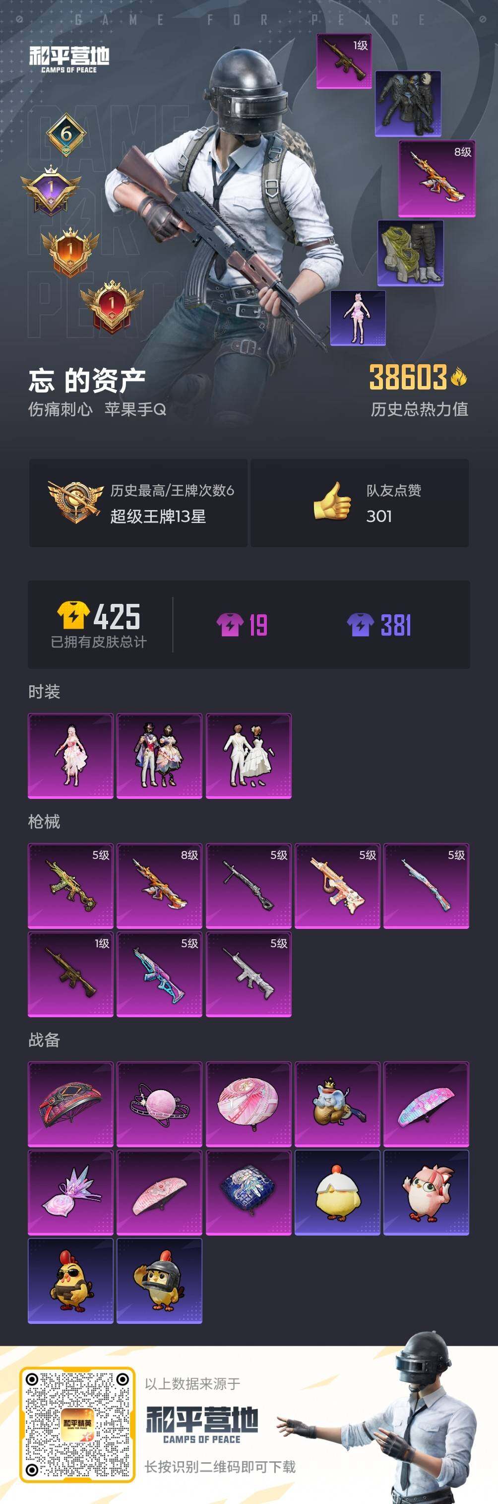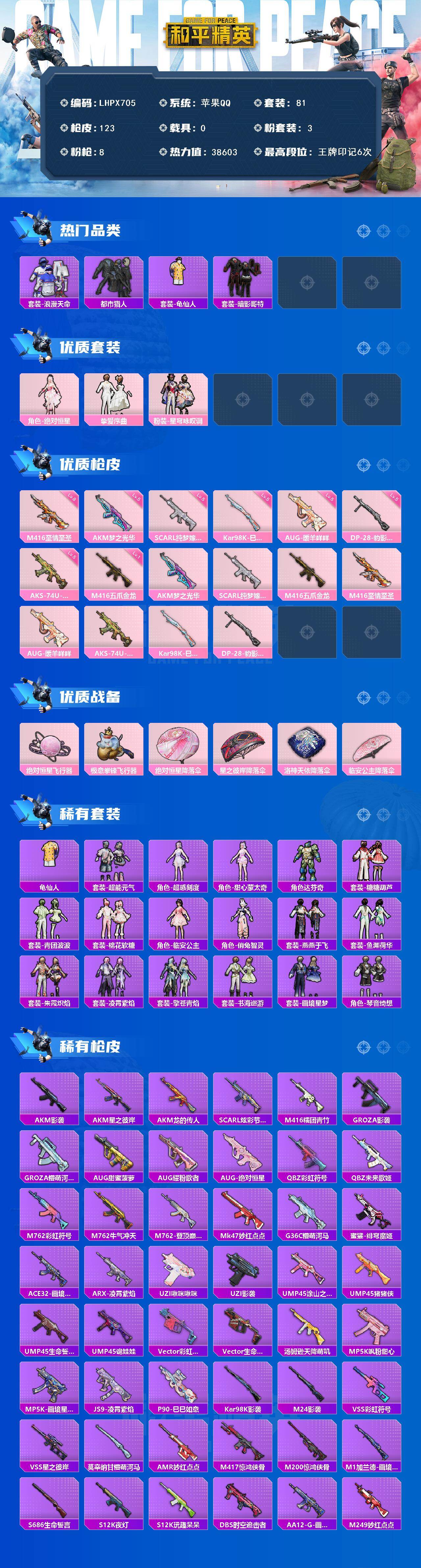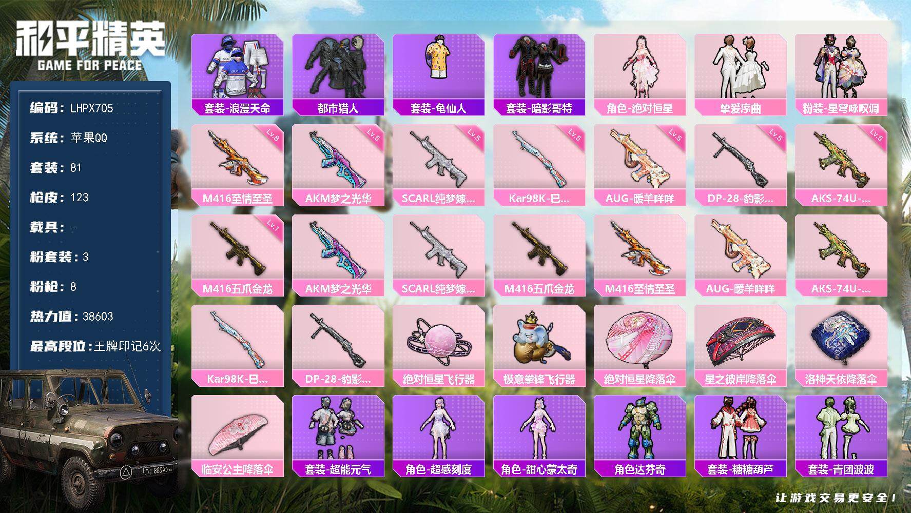 [15829551]【店主推荐捡漏号!可直接换绑】苹果 手q-3粉装-8特效呛-0载具-3粉色飞行器-38603热力值-6王牌印记-81套装-123呛皮【热门品类】:套装-浪漫天命,套装-都市猎人,套装-龟仙人,套装-暗影哥特【粉色套装】:角色-绝对恒星,粉装-挚爱序曲,粉装-星穹咏叹调【粉色呛皮等级】:akm-梦之光华五级,scar-l-纯梦嫁纱五级,m416-五爪金龙一级,m416-至情至圣八级,aug-暖羊咩咩五级,aks-74u-森灵之息五级,kar98k-巳巳如意五级,dp-28-豹影疾电五级【粉色呛皮】:akm-梦之光华,scar-l-纯梦嫁纱,m416-五爪金龙,m416-至情至圣,aug-暖羊咩咩,aks-74u-森灵之息,kar98k-巳巳如意,dp-28-豹影疾电【粉色飞行器】:绝对恒星飞行器,极意拳锋飞行器