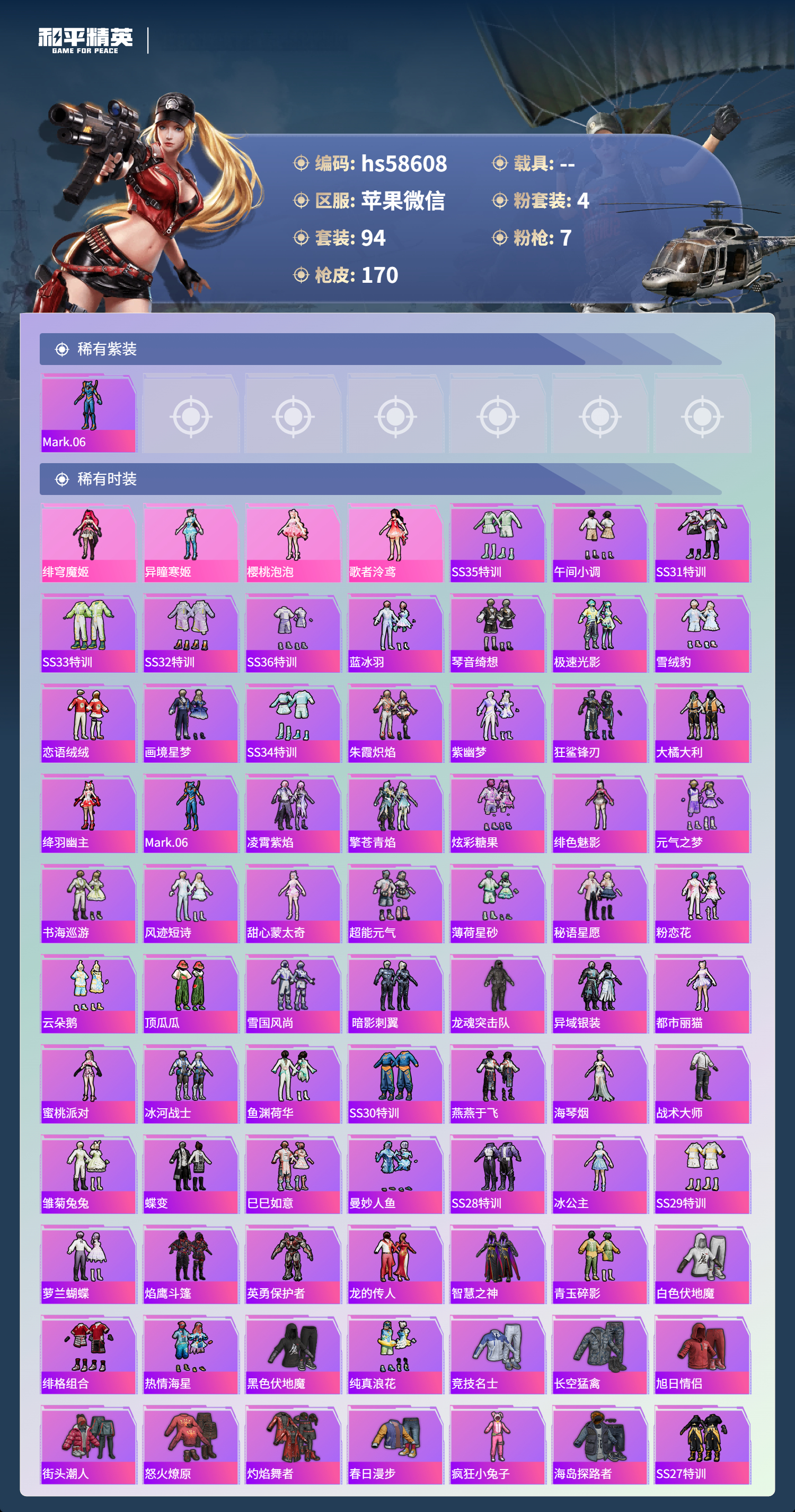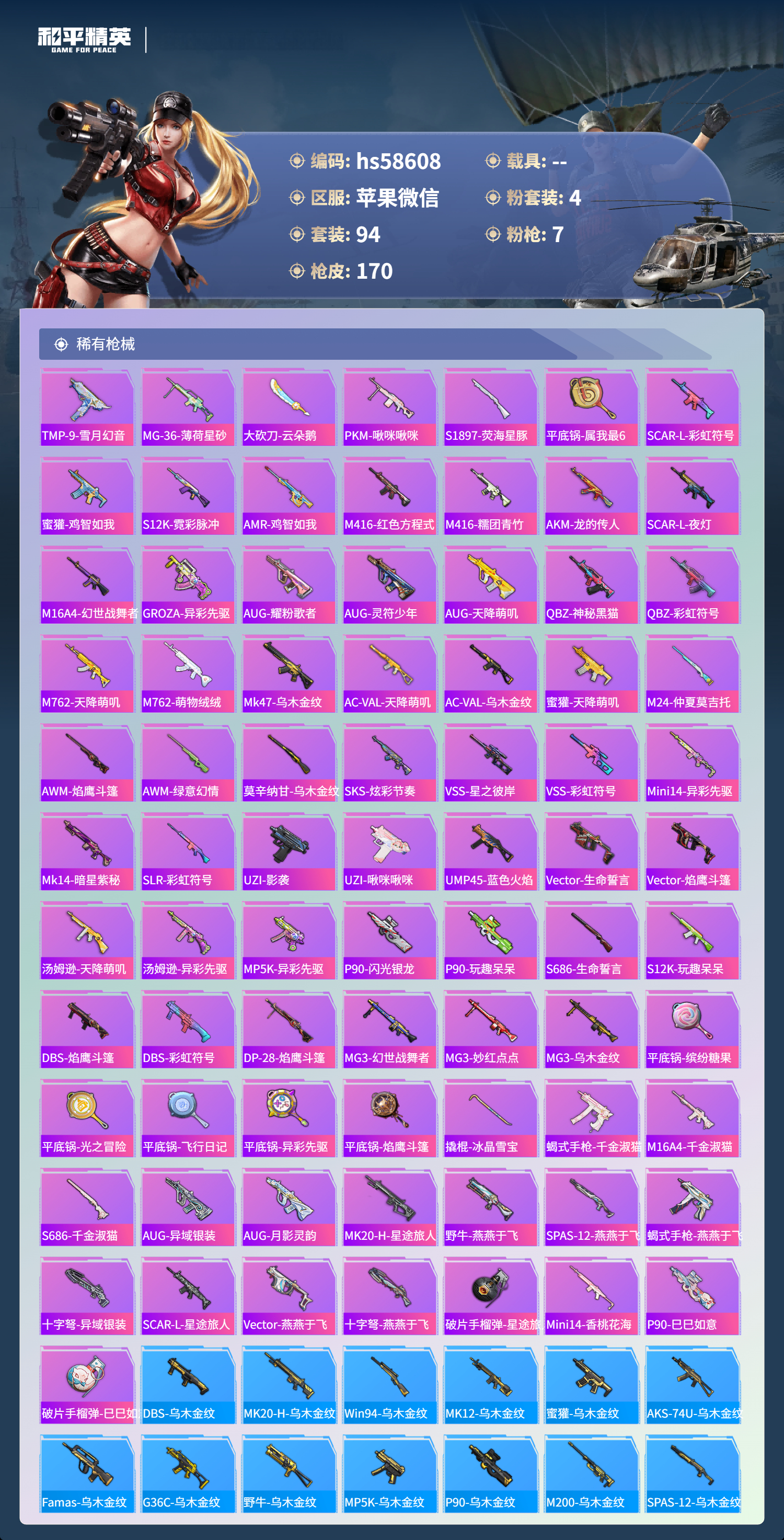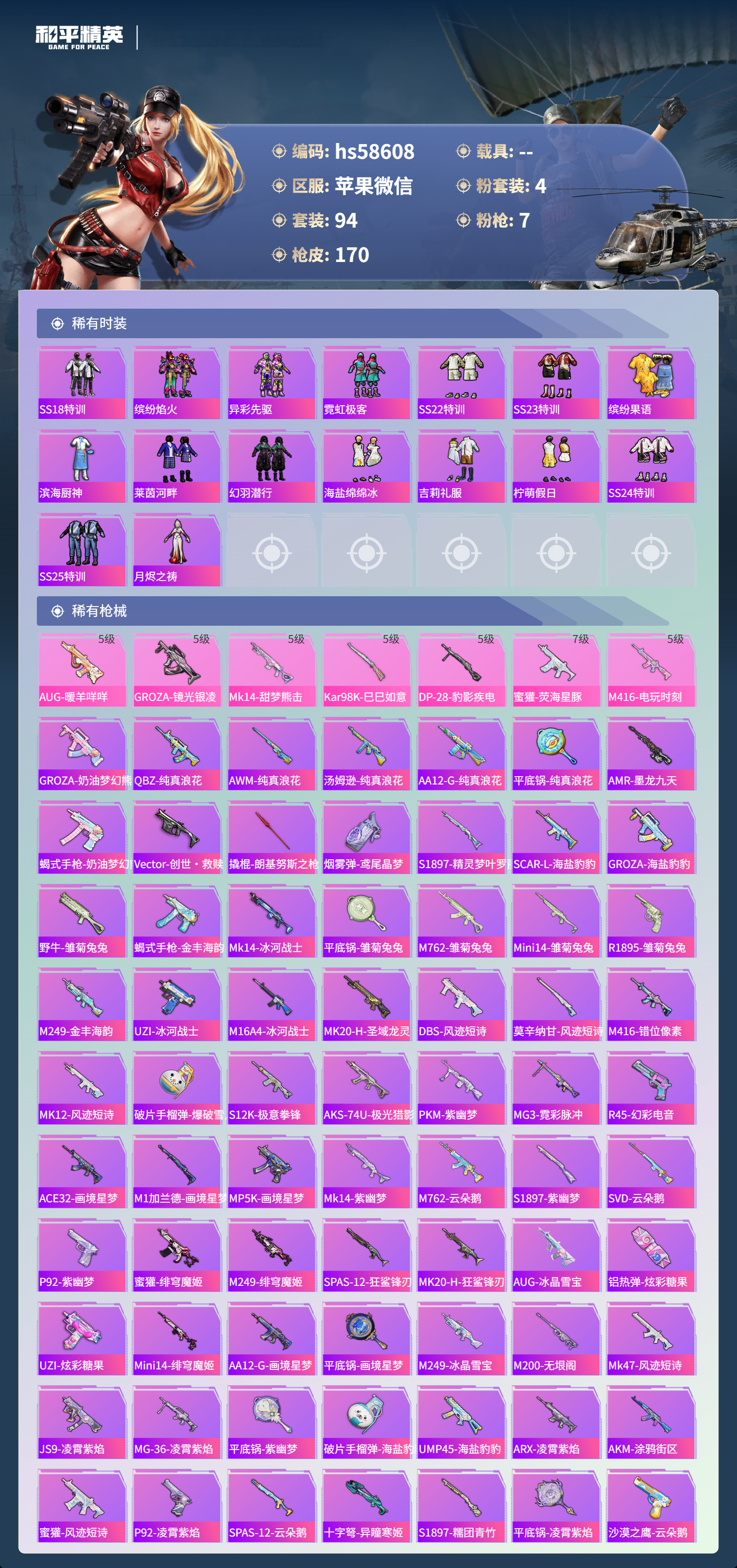hs58608 苹果微信-9王牌印记-4粉装-7特效呛-49277热力值-94套装-170呛皮-5卓越印记-3传奇印记【4粉装】角色-异瞳寒姬角色-歌者泠鸢角色-绯穹魔姬角色-樱桃泡泡【7特效呛】蜜獾-荧海星豚/7级m416-电玩时刻/5级groza-镜光银凌/5级kar98k-巳巳如意/5级dp-28-豹影疾电/5级mk14-甜梦熊击/5级aug-暖羊咩咩/5级【1稀有紫