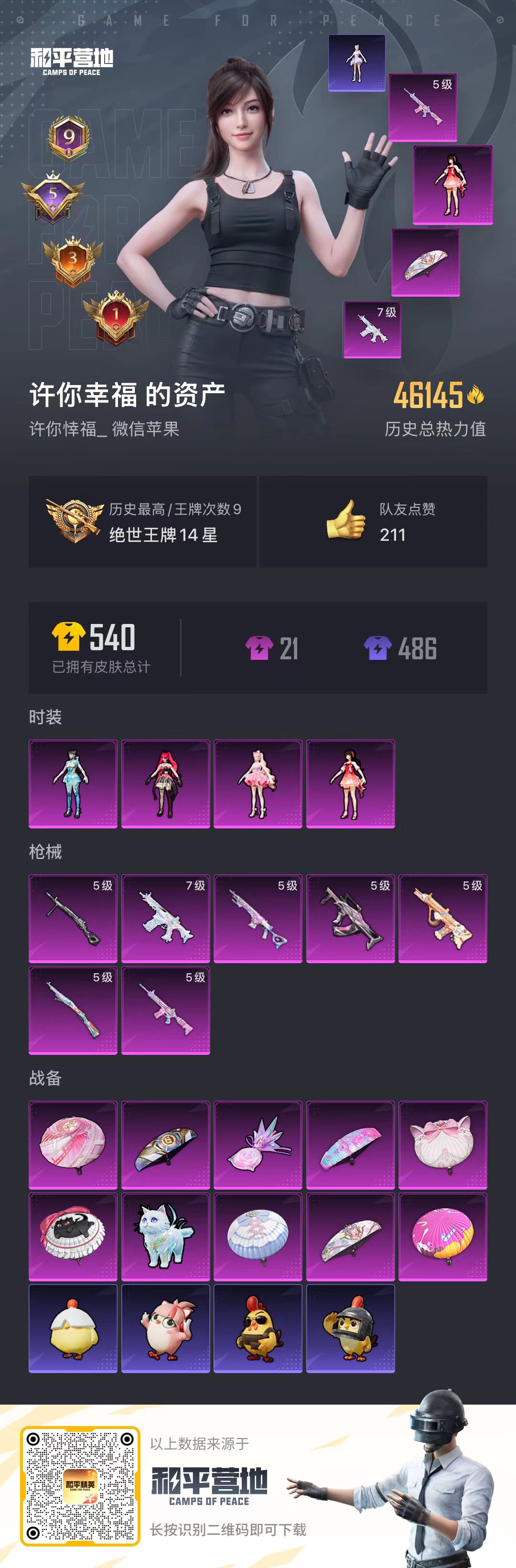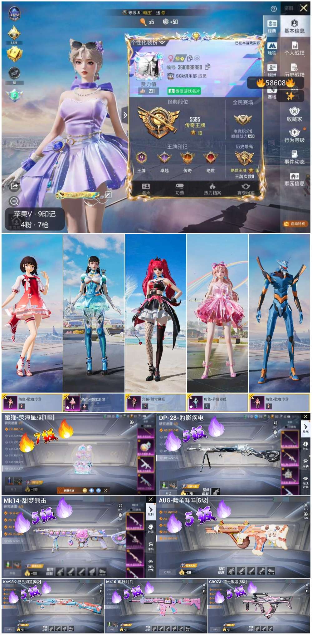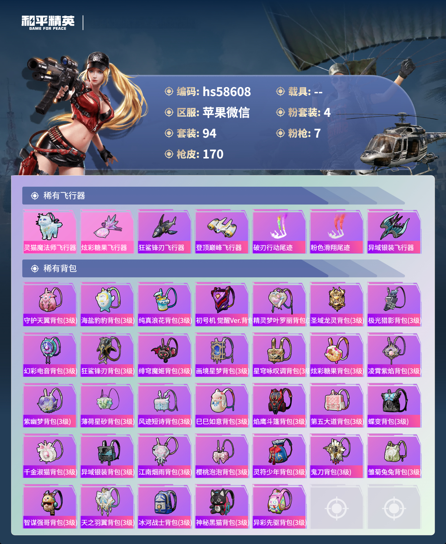 hs58608 苹果微信-9王牌印记-4粉装-7特效呛-49277热力值-94套装-170呛皮-5卓越印记-3传奇印记【4粉装】角色-异瞳寒姬角色-歌者泠鸢角色-绯穹魔姬角色-樱桃泡泡【7特效呛】蜜獾-荧海星豚/7级m416-电玩时刻/5级groza-镜光银凌/5级kar98k-巳巳如意/5级dp-28-豹影疾电/5级mk14-甜梦熊击/5级aug-暖羊咩咩/5级【1稀有紫