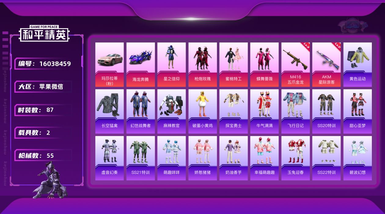 [16038459]4粉装 2特效呛 2.0载具 3印记 可二次 【热门装扮】星之信仰呛炮玫瑰蜜桃特工蝶舞蔷薇 【载具】玛莎拉蒂ghibli粉海龙奔腾 【稀有呛皮】akm星际浪客m416五爪金龙 【三级特效呛】三级m416-五爪金龙 【二级特效呛】二级akm-星际浪客 【紫色装扮】黄色运动长空猛禽幻世战舞者麻辣教官破蛋小黄鸡探宝勇士牛气满满飞行日记ss20特训甜心亚梦虚音幻奏ss21特训萌趣咩咩娇憨猪猪奶油香芋幸福萌趣趣玉兔迎春ss22特训碧波幻想柠萌假日龟仙人 【优质战备】飞行翼-星之信仰千面幻镜飞行器星际浪客飞行器飒粉甜心降落伞呛炮玫瑰降落伞南瓜骑士降落伞粉色回忆降落伞歌者泠鸢降落伞