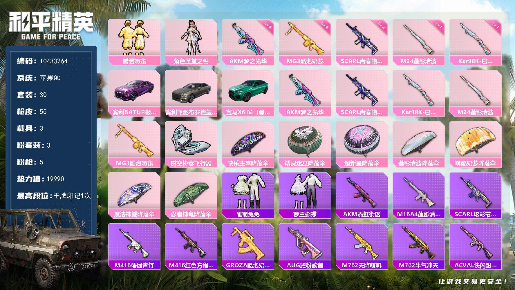 [16074905]【编号25464可秒换绑】店长推荐特价处理精品号苹果 手q-3粉装-5特效呛-3载具-19990热力值-1印记-30套装-55呛皮 【稀有载具】:宾利batur(极速紫),宾利飞驰(布罗德盖棕双色),宝马x6 m(曼岛绿) 【特效呛等级】:akm-梦之光华四级,scar-l-青春物语二级,kar98k-巳巳如意一级,m24-莲影清波一级,mg3-酷泡奶龙四级 【优质套装】:粉装-缤纷油彩,粉装-暖暖奶龙,角色-圣堂之誓 【稀有套装】:套装-雏菊兔兔,套装-萝兰蝴蝶 【优质武器皮肤】:akm-梦之光华,scar-l-青春物语,kar98k-巳巳如意,m24-莲影清波,mg3-酷泡奶龙 【稀有武器皮肤】:akm-霓虹街区,m16a4-莲影清波,scar-l-炫彩节奏,m416-糯团青竹,m416-红色方程式,groza-酷泡奶龙,aug-耀粉歌者,m762-天降萌叽,m762-牛气冲天,ac-val-快闪甜心,uzi-啾咪啾咪,uzi-红色方程式,uzi-金风玉露,p90-快闪甜心,awm-激战未来,sks-心之恋语,slr-四圣焕新,amr-超新星,mk20-h-快闪甜心,mk20-h-莲影清波,m200-酷泡奶龙,s686-生命誓言,m249-彩虹符号,m249-莲影清波,r1895-六号树人,沙墨之鹦-快闪甜心 【其他套装】:套装-ss9特训,套装-ss12特训,套装-ss13特训,套装-ss26特训,套装-ss29特训,套装-丛林猎人,套装-北国孤狼,套装-牛气满满,套装-空岛之星,套装-竞技名士,套装-耀粉歌者,套装-酒红色名流,套装-长空猛禽,套装-霓虹街区,套装-青年教官,套装-鹤鸣,角色-英勇保护者,套装-云霞荷露,套装-晨曦薄雾,套装-快闪甜心,套装-春光漫游,套装-贝斯之夜,套装-彩霞狙击 【优质飞行器】:时空协奏飞行器 【优质降落伞】:快乐主宰降落伞,精灵迷巫降落伞,超新星降落伞,莲影清波降落伞,萌酷奶龙降落伞,魔法神域降落伞,忍者神龟降落伞 【稀有头盔】:九霄头盔(2级),九霄头盔(1级),甜蜜誓约头盔(2级) 【稀有背包】:九霄背包(1级) 【营地id】:708483374
