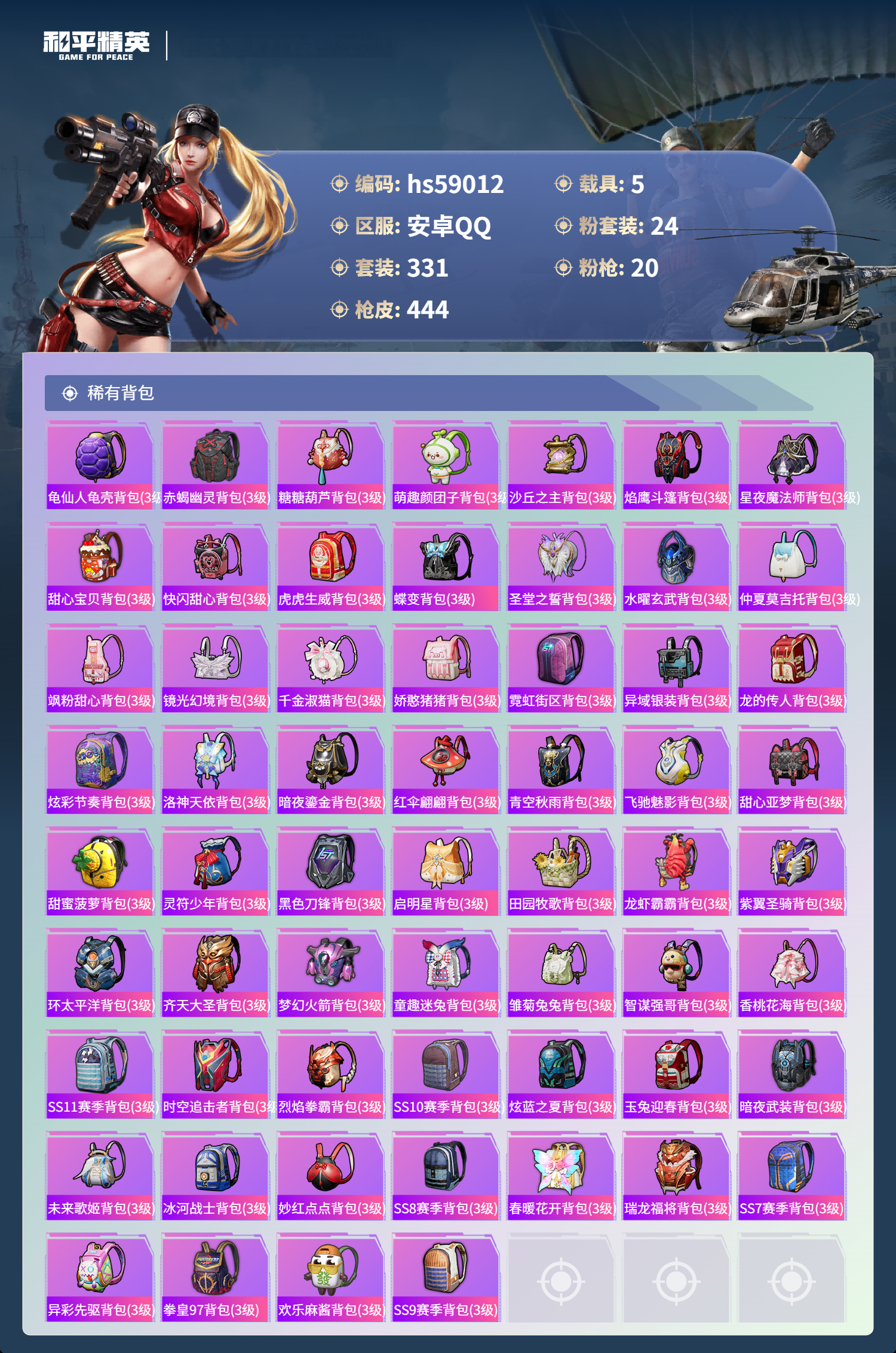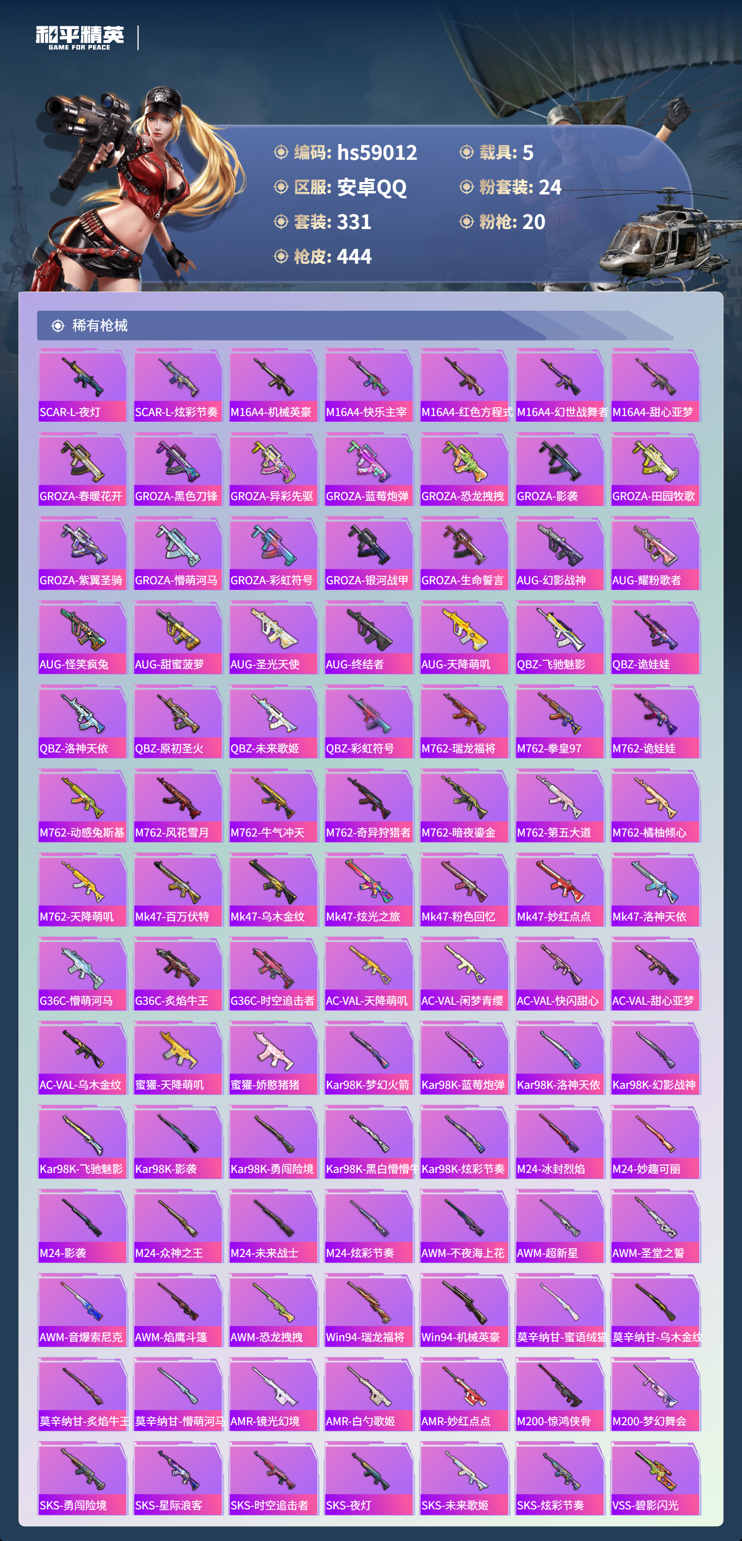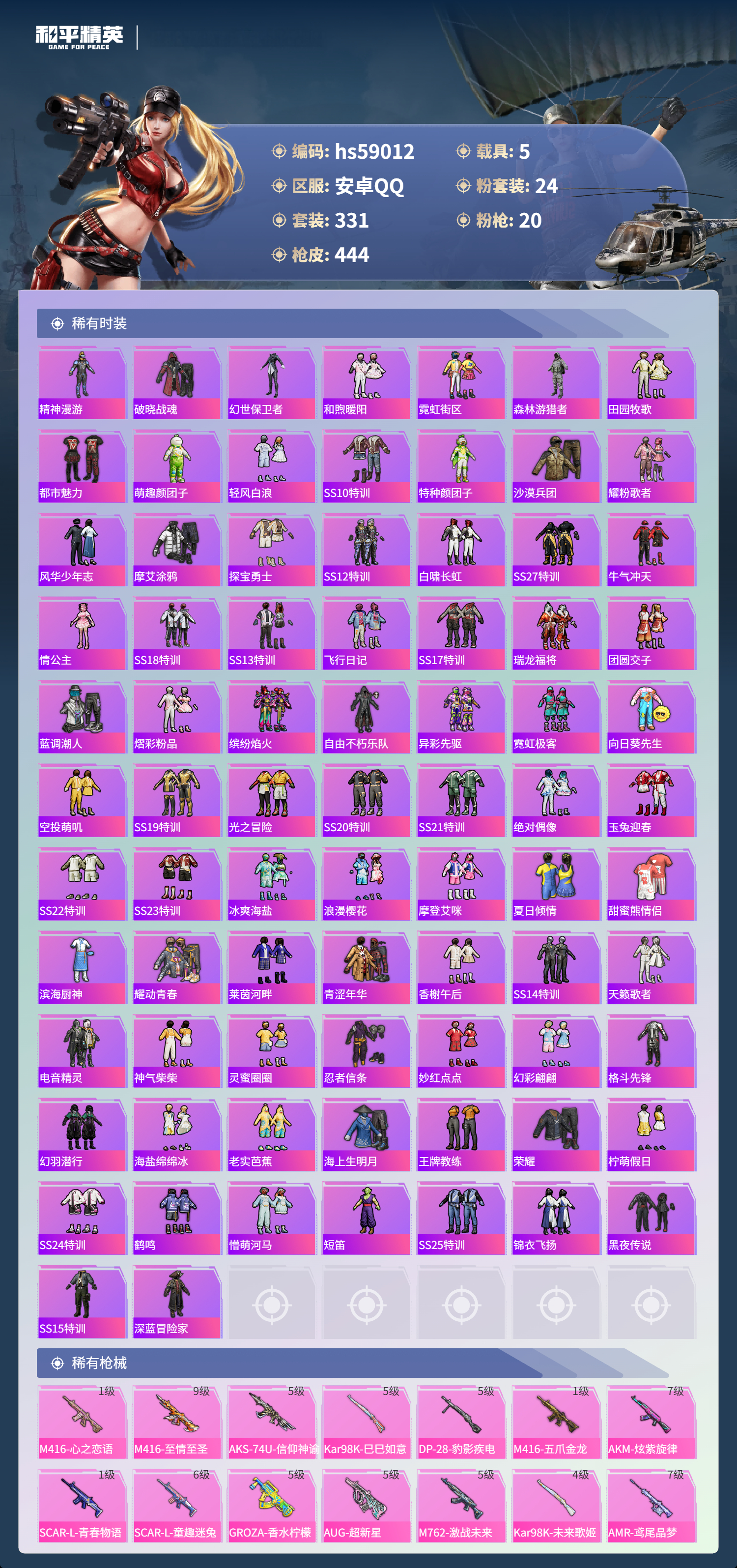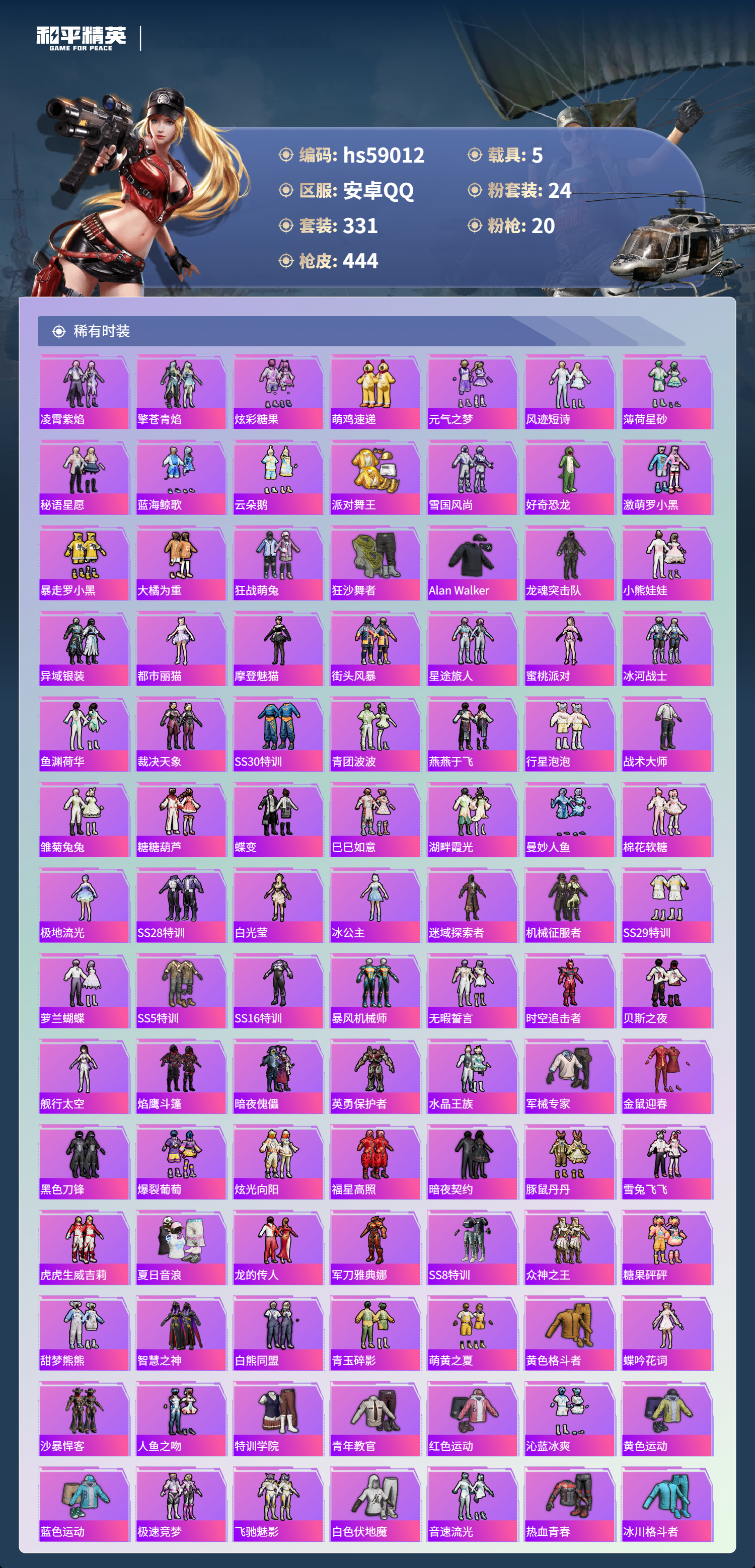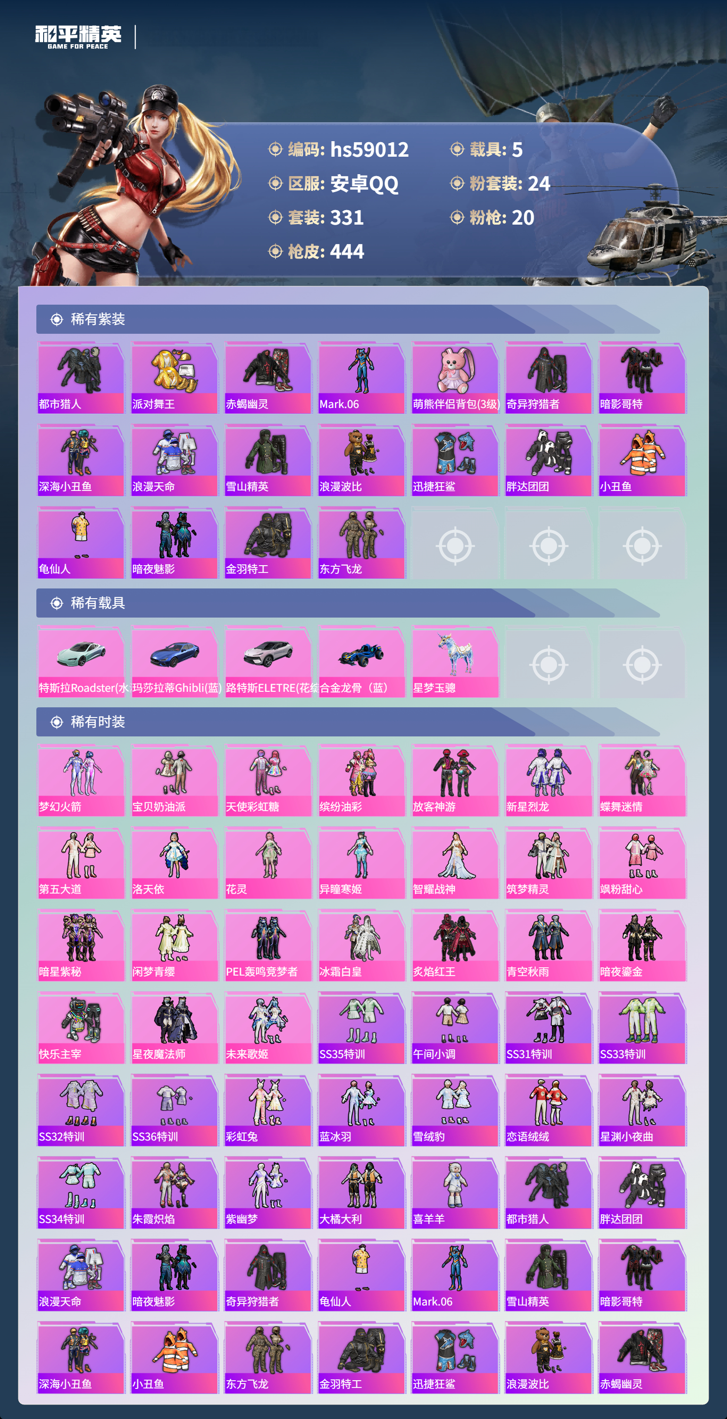 5载具-331套装-444呛皮-hs59012 安卓手q-22王牌印记-24粉装-20特效呛-5载具-热力值-331套装-444呛皮-3卓越印记-1传奇印记【24粉装】套装-梦幻火箭套装-宝贝奶油派套装-炙焰红王角色-花灵套装-未来歌姬套装-新星烈龙套装-冰霜白皇套装-pel轰鸣竞梦者套装-第五大道套装-闲梦青缨角色-异瞳寒姬套装-青空秋雨套装-筑梦精灵套装-蝶舞迷情套装-暗夜鎏金套装