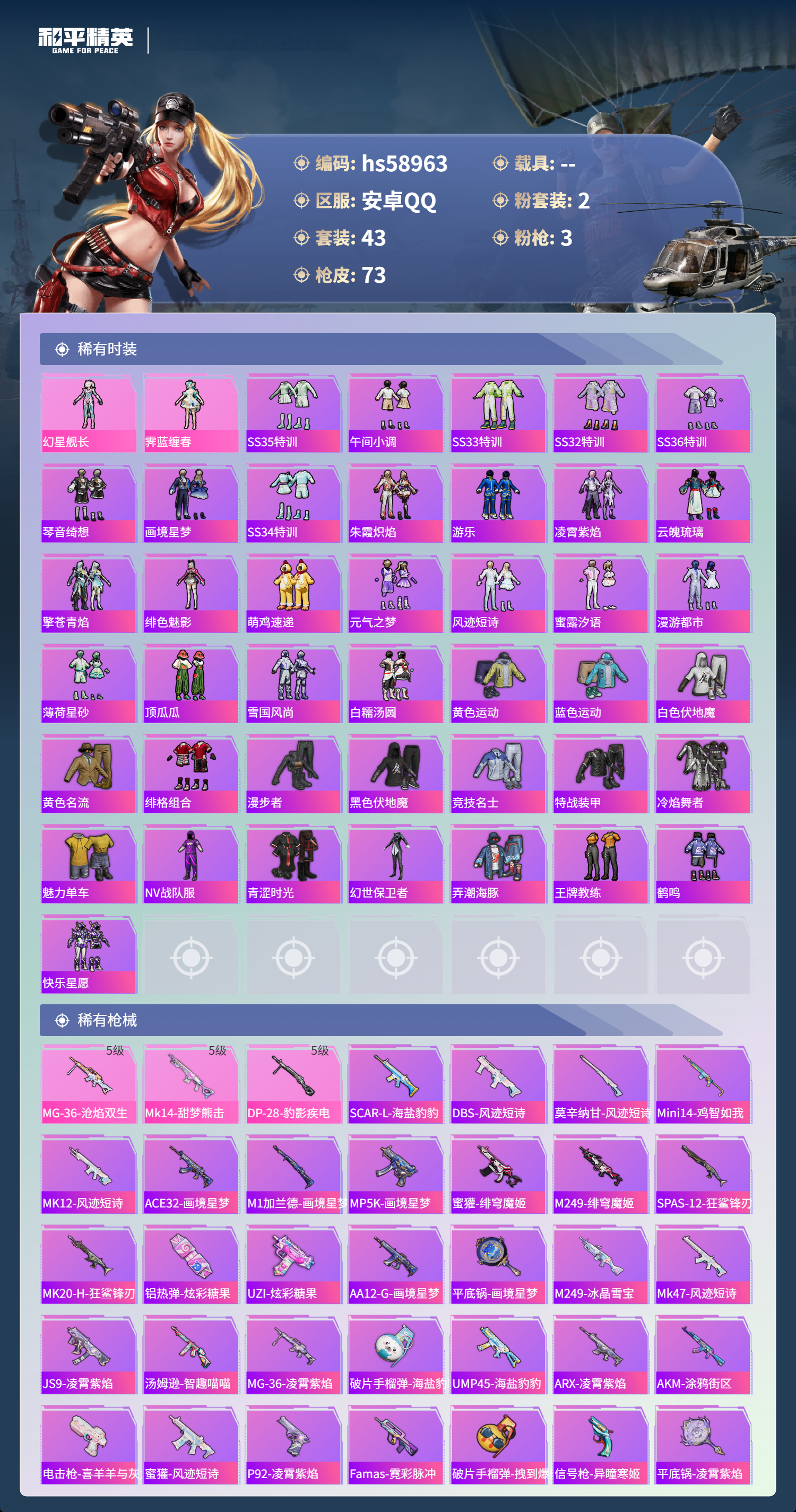 0载具-43套装-73呛皮-hs58963 安卓手q-3王牌印记-2粉装-3特效呛-17150热力值-43套装-73呛皮-1卓越印记【2粉装】角色-幻星舰长角色-霁蓝缠春【3特效呛】dp-28-豹影疾电/5级mg-36-沧焰双生/5级mk14-甜梦熊击/5级【43稀有时装】幻星舰长ss35特训午间小调ss33特训ss32特训ss36特训琴音绮想画境星梦ss34特训朱霞炽焰游乐凌霄紫焰云魄琉