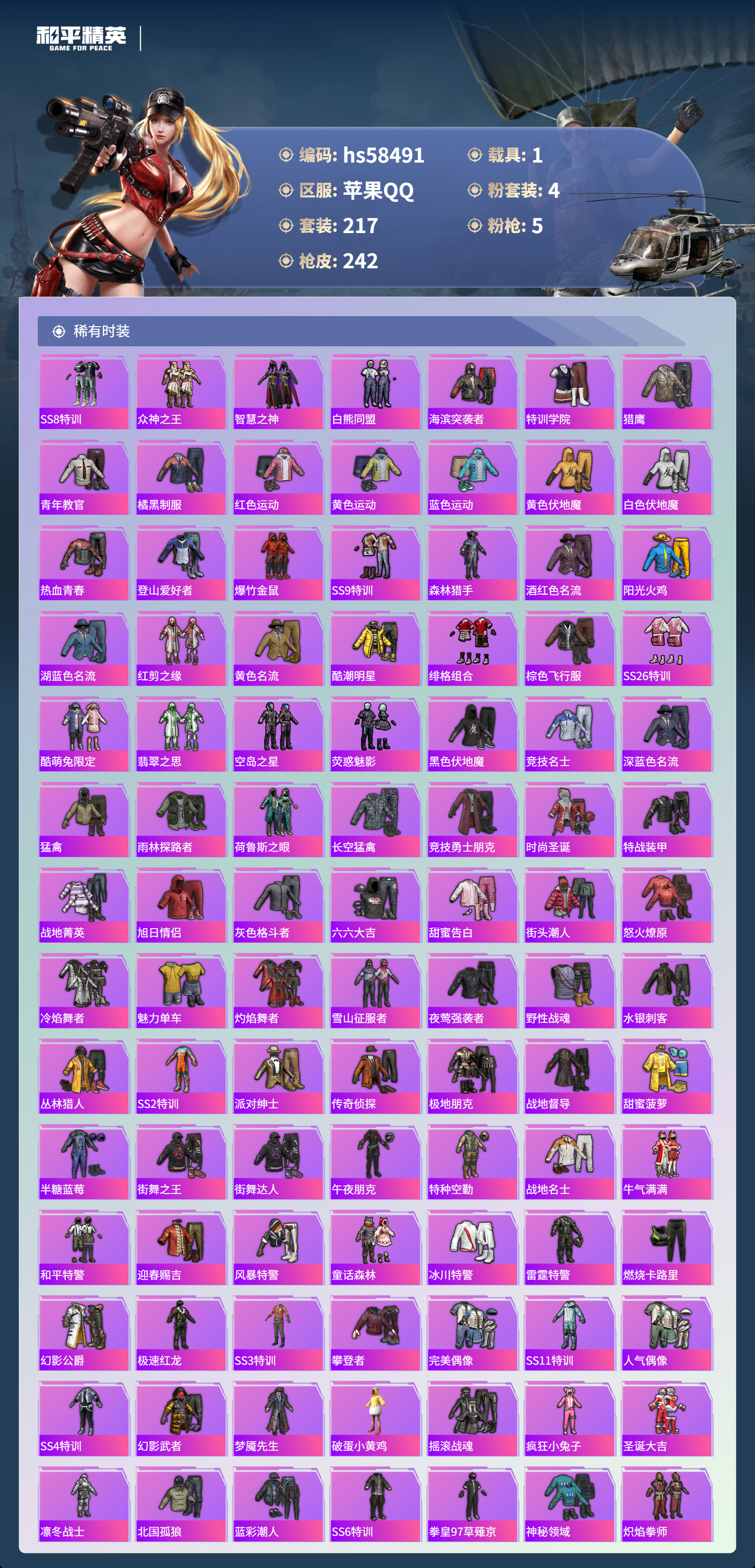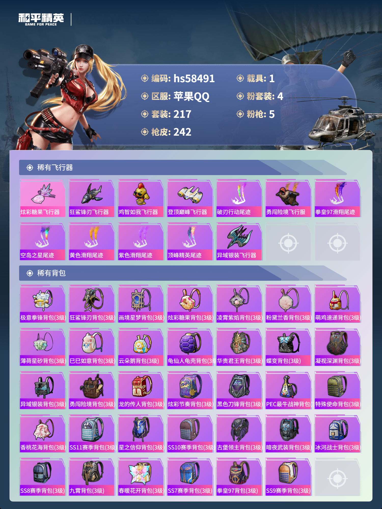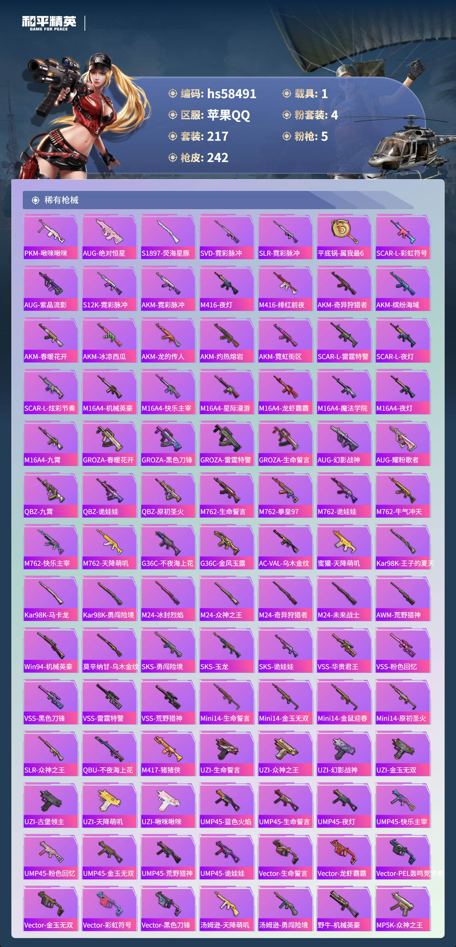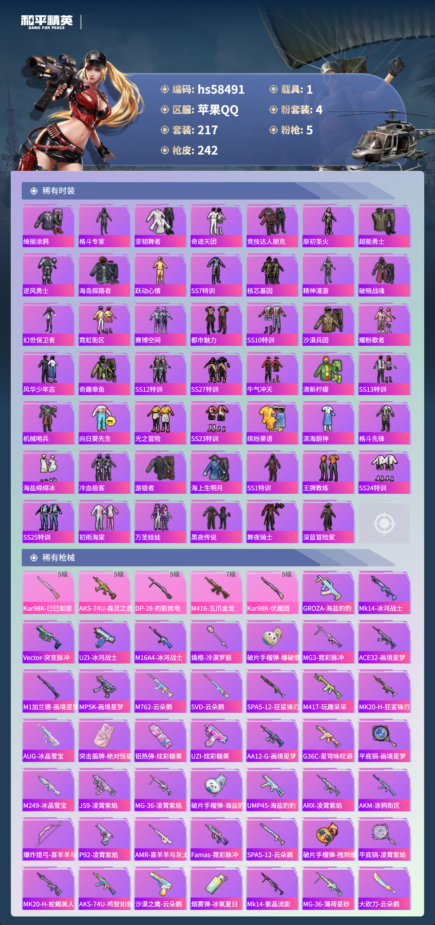 hs58491 苹果手q-9王牌印记-4粉装-5特效呛-1载具-71977热力值-217套装-242呛皮-1卓越印记【4粉装】套装-怪诞乔克套装-恐龙拽拽套装-华贵君王套装-向日葵【5特效呛】dp-28-豹影疾电/5级m416-五爪金龙/7级kar98k-伏魔团/5级kar98k-巳巳如意/5级aks-74u-森灵之息/5级【5稀有紫装】暗影哥特雪山精英胖达圆圆浪漫波比