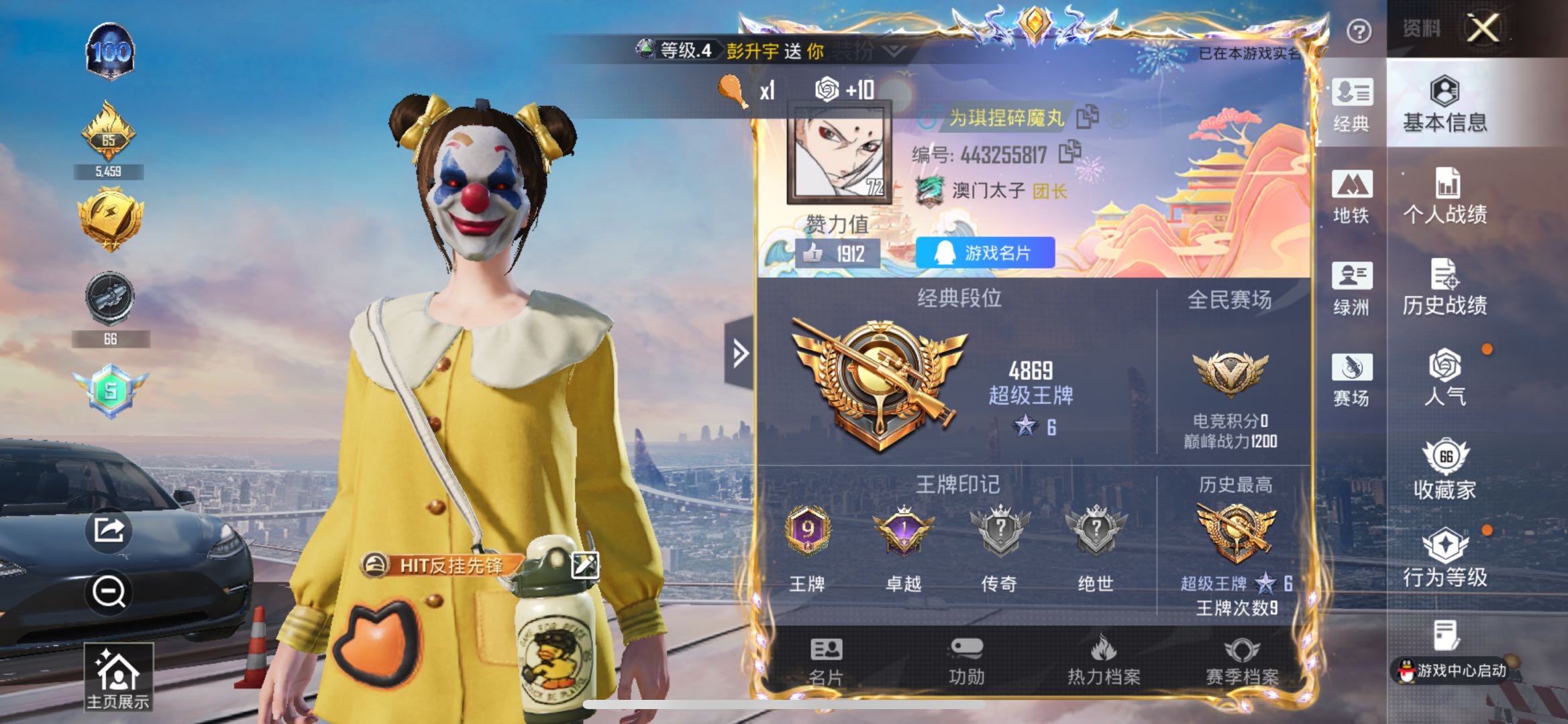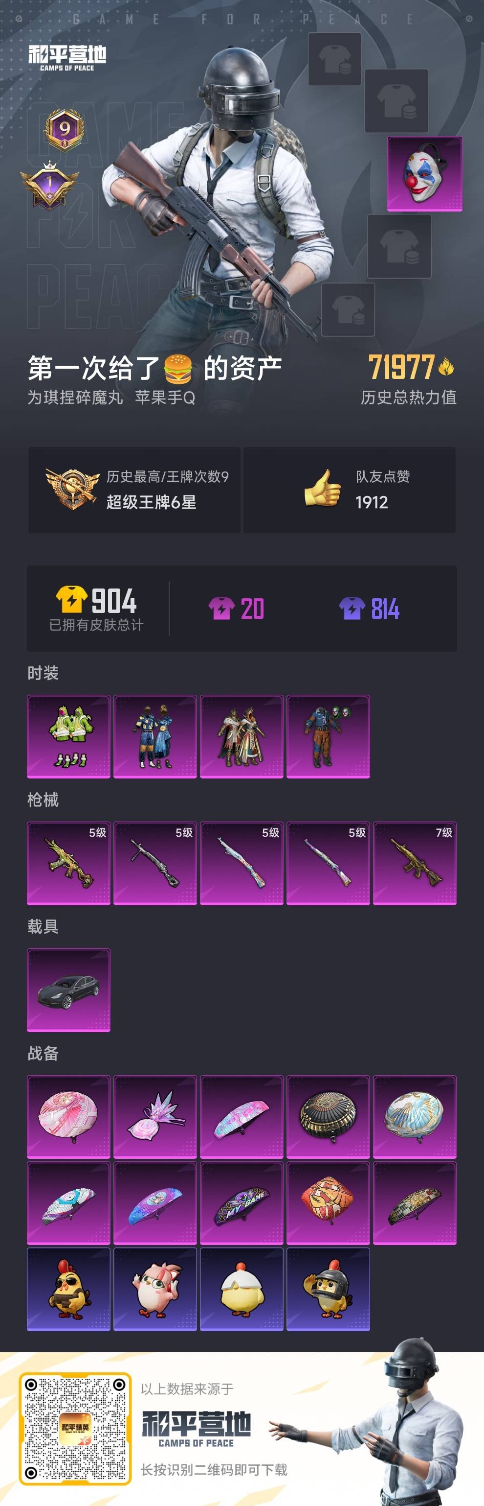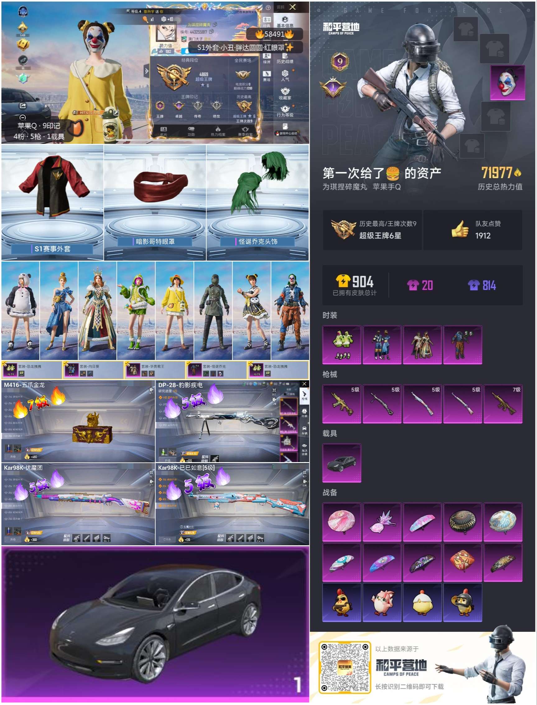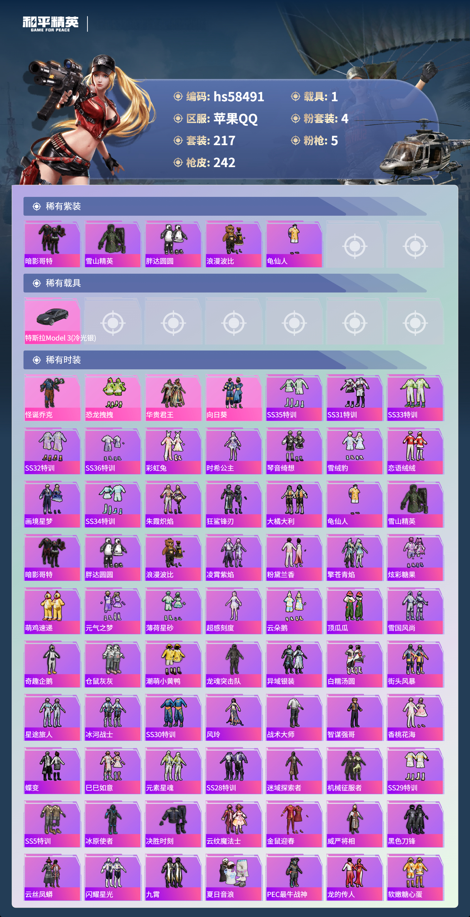 hs58491 苹果手q-9王牌印记-4粉装-5特效呛-1载具-71977热力值-217套装-242呛皮-1卓越印记【4粉装】套装-怪诞乔克套装-恐龙拽拽套装-华贵君王套装-向日葵【5特效呛】dp-28-豹影疾电/5级m416-五爪金龙/7级kar98k-伏魔团/5级kar98k-巳巳如意/5级aks-74u-森灵之息/5级【5稀有紫装】暗影哥特雪山精英胖达圆圆浪漫波比