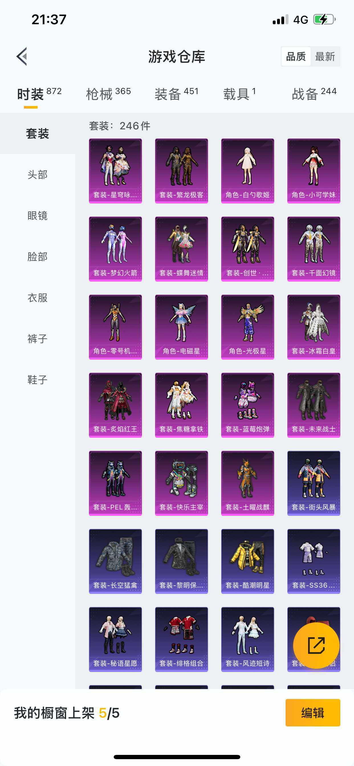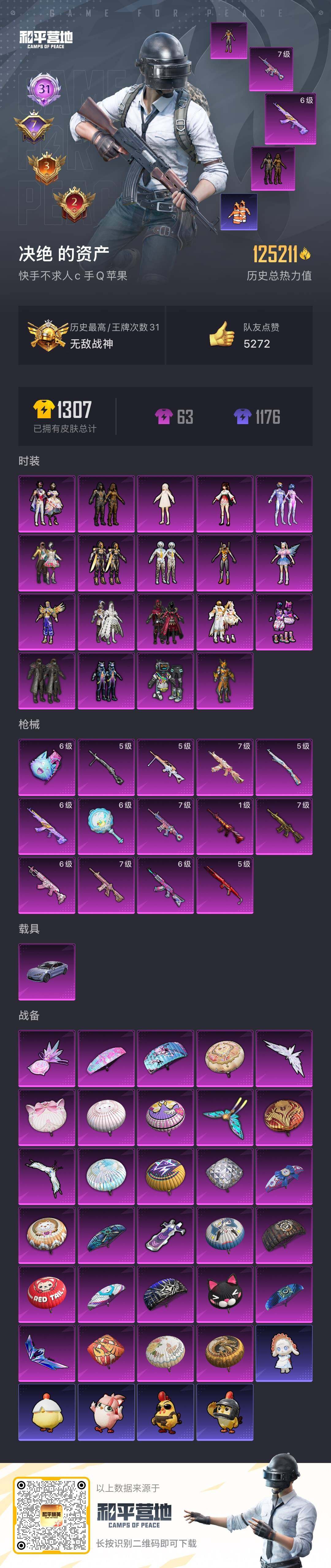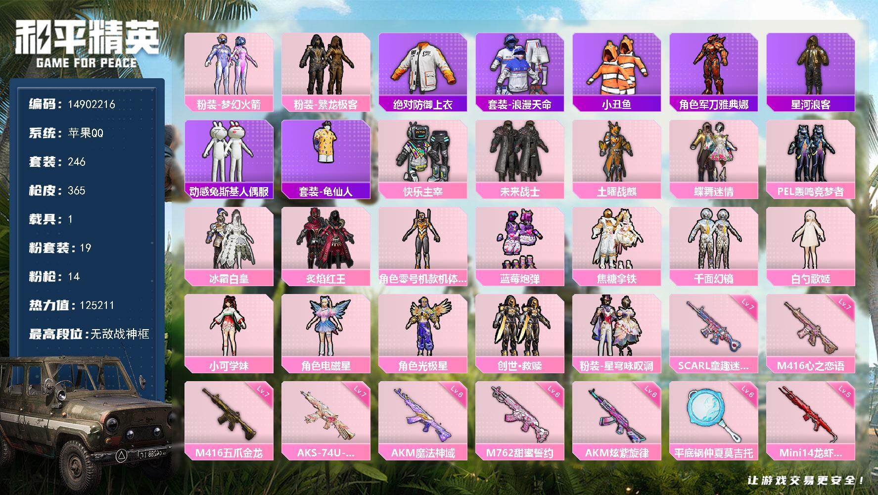[16054165]实名: 可修改 时装数: 246 载具数: 1 呛械数: 365 战备数: 244 热门装扮: 梦幻火箭新101蝶舞迷情未来战士快乐主宰梦魇先生土曜战麒迅捷狂鲨东方飞龙pel轰鸣竞梦者炙焰红王冰霜白皇蓝莓炮弹零号机款机体服焦糖拿铁千面幻镜大橘为重萌神柯基动感兔斯基小可学妹白勺歌姬繁龙极客电磁星光极星创世·救赎星穹咏叹调 载具: 仰望u7先锋版阿盖尔紫 稀有呛皮: mini14龙虾霸霸m762甜蜜誓约akm炫紫旋律m416五爪金龙m416心之恋语scar-l童趣迷兔m416风花雪月平底锅仲夏莫吉托破片手留单粉粉猫爪akm魔法神域kar98k-巳巳如意aks-74u-星穹咏叹调dp-28-豹影疾电mg-36-沧焰双生