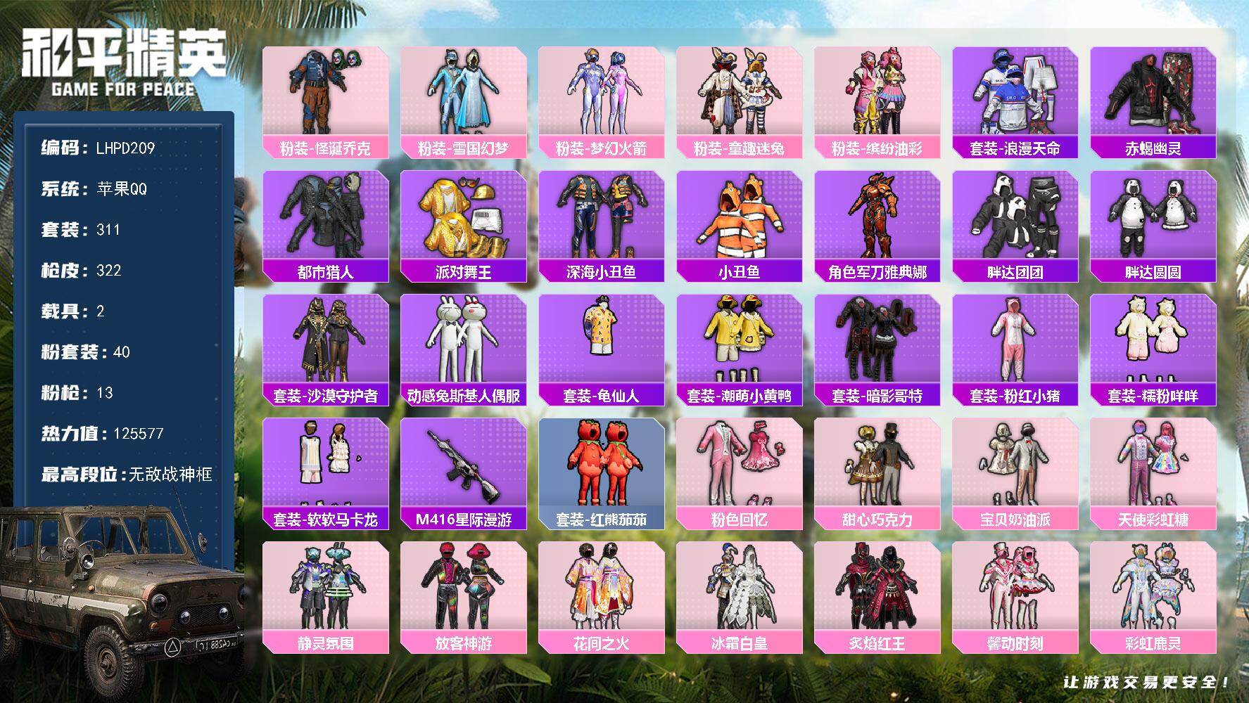 [16079773]【特价出售/店主推荐】苹果 手q-无敌战神框-40粉装-13特效呛-2载具-5粉色飞行器-125577热力值-21王牌印记-311套装-322呛皮【热门品类】:粉装-怪诞乔克,粉装-雪国幻梦,粉装-梦幻火箭,粉装-童趣迷兔,粉装-缤纷油彩,套装-浪漫天命,套装-赤蝎幽灵,套装-都市猎人,套装-派对舞王,套装-深海小丑鱼,套装-小丑鱼,角色-军刀雅典娜,套装-胖达团团,套装-胖达圆圆,套装-沙漠守护者,套装-动感兔斯基人偶服,套装-龟仙人,套装-潮萌小黄鸭,套装-暗影哥特,套装-粉红小猪,套装-糯粉咩咩,套装-软软马卡龙,m416-星际漫游,套装-红熊茄茄【粉色套装】:粉装-粉色回忆,粉装-怪诞乔克,粉装-甜心巧克力,粉装-宝贝奶油派,粉装-天使彩虹糖,粉装-雪国幻梦,粉装-梦幻火箭,粉装-静灵氛围,粉装-缤纷油彩,粉装-放客神游,粉装-花间之火,粉装-冰霜白皇,粉装-童趣迷兔,粉装-炙焰红王,粉装-馨动时刻,粉装-彩虹鹿灵,粉装-甜心娃娃,粉装-精灵娃娃,粉装-酣梦娃娃,粉装-海盐物语,粉装-橘柚倾心,粉装-甜梦小狐,粉装-暖熊萌萌,粉装-霁雪冰心,粉装-冰川粉黛,粉装-冰川幽秘,粉装-青空秋雨,粉装-第五大道,粉装-心之回忆,角色-白勺歌姬,角色-呆萌星弥,角色-小可学妹,粉装-炫光之旅,粉装-憨憨奶龙,角色-鸢尾晶梦,套装-创世·救赎,角色-智耀战神,粉装-绯果甜心,粉装-幻彩电音,角色-异瞳寒姬【粉色呛皮等级】:akm-梦之光华一级,akm-白勺歌姬七级,m16a4-垂柳戏鸭五级,scar-l-梦幻火箭七级,scar-l-锦绣绵绵五级,m416-心之恋语六级,m416-暖熊萌萌六级,groza-香水柠檬五级,aug-星梦奇缘三级,aks-74u-星穹咏叹调四级,kar98k-巳巳如意五级,dp-28-豹影疾电五级,平底锅-仲夏莫吉托三级【粉色载具】:萌喵橘座,双人摩托-梦幻火箭【粉色呛皮】:akm-梦之光华,akm-白勺歌姬,m16a4-垂柳戏鸭,scar-l-梦幻火箭,scar-l-锦绣绵绵,m416-心之恋语,m416-暖熊萌萌,groza-香水柠檬,aug-星梦奇缘,aks-74u-星穹咏叹调,kar98k-巳巳如意,dp-28-豹影疾电,平底锅-仲夏莫吉托【粉色飞行器】:绝对恒星飞行器,粉樱探戈飞行
