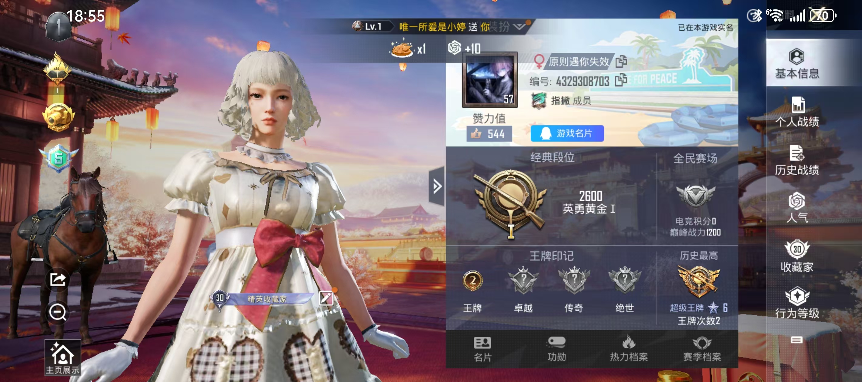 [6579756]h3209 实名: 可修改 时装数: 374 呛械数: 97 战备数: 69 热门装扮: 宝贝奶油派梦魇先生万圣娃娃恒星战甲暗夜行者 稀有呛皮: kar98k-巳巳如意 亮点: 精品1粉1特 宝贝奶油派