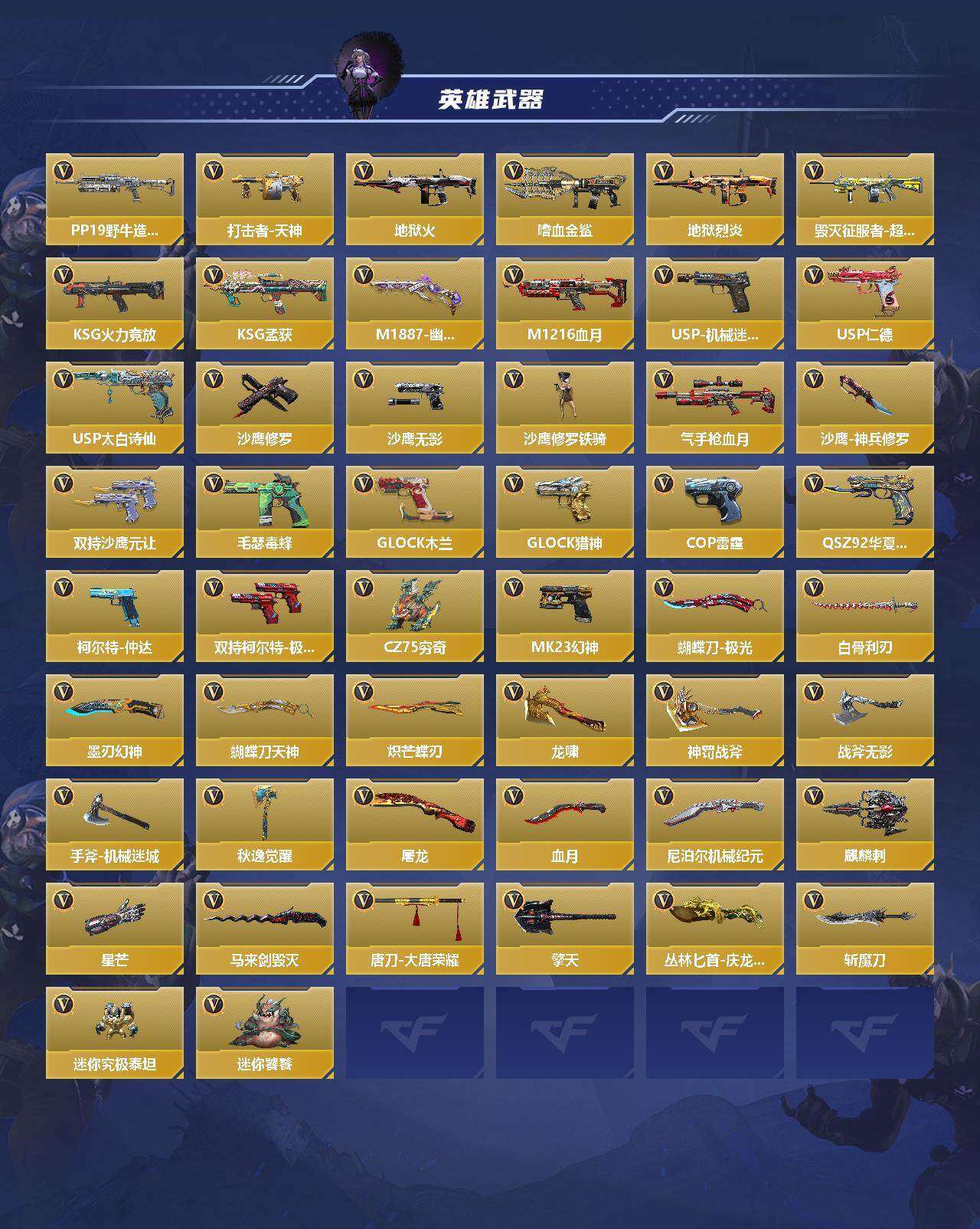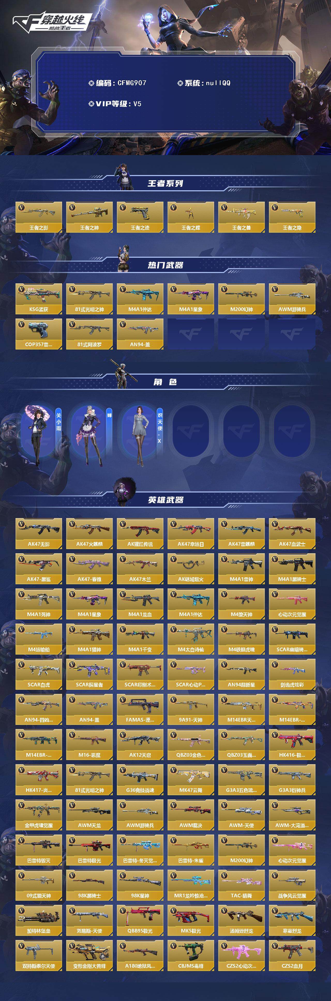 【cfmg907】vip5/258v/6王者/王者之影/王者之神/王者之迹/王者之蝶/王者之兽/王者之隐/ksg-孟获/81式-光明之神/m4a1-仲达/m4a1-星象/m200-幻神/awm-游骑兵/cop357-雷霆/81式-阿波罗/an94-盖/关小雨/蝉/炽天使-x/ak47-无影/ak47-火麒麟/ak47-猩红传说/ak47-幸运日/ak47-雷麒麟/ak47-血武士/ak47-黑