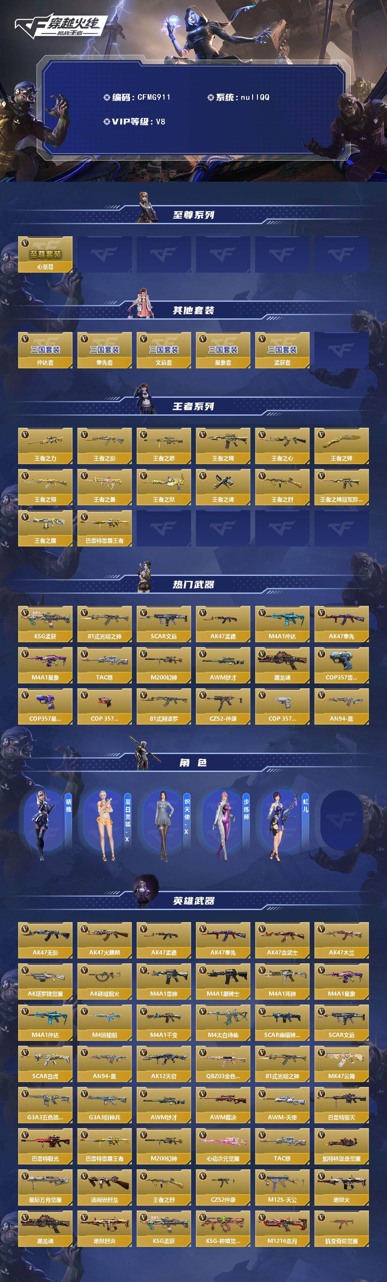 【cfmg911】vip8/198v/14王者/王者之心至尊套/仲达套/奉先套/星象套/孟获套/文远套/王者之力/王者之影/王者之怒/王者之魄/王者之心/王者之锋/王者之翎/王者之兽/王者之狱/王者之魂/王者之烈/王者之魄-冠军珍藏/王者之霆/芭蕾特-雷霆王者/ksg-孟获/81式-光明之神/scar-文远/ak47-孟德/m4a1-仲达/ak47-奉先/m4a1-星象/tac-慈/m200-
