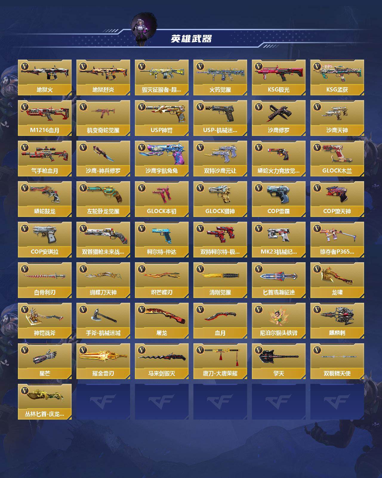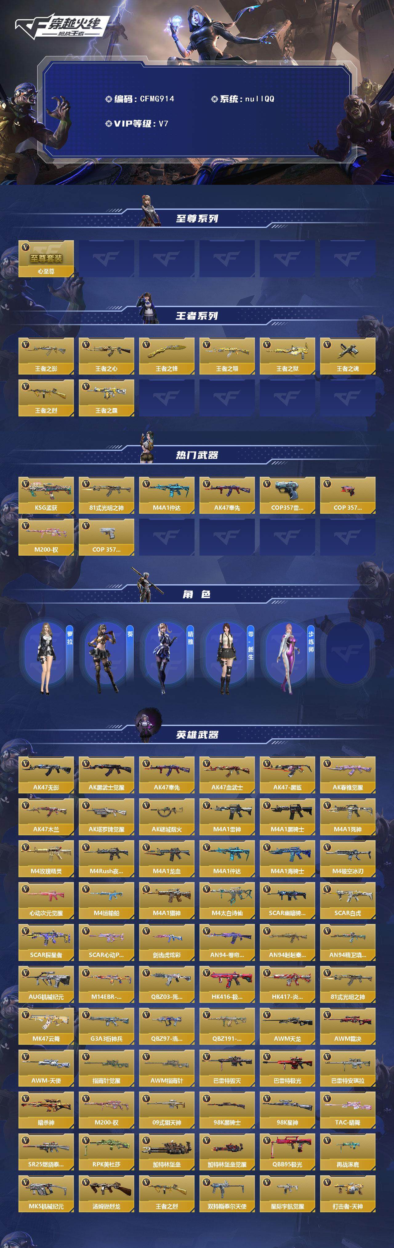 【cfmg914】vip7/229v/心至尊/王者之影/王者之心/王者之锋/王者之翎/王者之狱/王者之魂/王者之烈/王者之霆/ksg-孟获/81式-光明之神/m4a1-仲达/ak47-奉先/cop 357-雷霆/cop 357-堕天神/m200-权/cop 357-安琪拉/萝拉/葵/晴雅/零-新生/步练师/ak47-无影/ak47-黑武士觉醒/ak47-血武士/ak47-黑鲨/ak47-春雅觉醒/ak47-木兰/ak47-塔罗牌觉醒/ak47-谜城烟火/m4a1-雷神/m4a1-黑骑士/m4a1-死神/m4a1-玫瑰精灵/m4a1-rush-夜袭/m4a1-龙血/m4a1-海骑士/m4a1-破空冰刃/m4a1-心动次元觉醒/m4a1-运输船/m4a1-猎神/m4a1-太白诗仙/scar-幽暗骑士/scar light-白虎/scar-探星者/scar-心动pick/剑齿虎-炫彩/an94-卷帘大将军/an94-赳赳秦师/an94-精卫填海/aug-机械纪元/m14ebr-拂影/q03-死神/hk416-极光/hk417-炎龙铠甲/mk47-云舞/g3a3-衍神兵/q97-浩瀚征途/q191-封神榜/awm-天龙/awm-裁决/awm-天使/awm-指南针觉醒/awm-指南针/芭蕾特-毁灭/芭蕾特-极光/芭蕾特-安琪拉/暗杀神/09式狙-天神/98k-黑骑士/98k-星神/tac-晴舞/sr25-燃烧泰坦/rpk-美杜莎/加特林-堡垒/加特林-堡垒觉醒/qbb95-极光/qbb95-再战涿鹿/mk5-机械纪元/汤姆逊-烈龙/双持斯泰尔-天使/ddm4-pdw-星际宇航觉醒/打击者-天神/地狱火/地狱烈炎/毁灭征服者-超越max/aa12-火药觉醒/ksg-极光/m1216-血月/igin12-机变奇蛇觉醒/usp-神罚/usp-机械迷城/沙鹰-修罗/沙鹰-天神/气手呛-血月/沙鹰-神兵修罗/沙鹰-宇航兔兔/双持沙鹰-元让/蟒蛇-火力竞放觉醒/改装glock-木兰/蟒蛇-鼓龙/左轮-卧龙觉醒/双持glock18-本初/glock18-猎神/双管猎呛-未来战士/柯尔特-仲达/双持柯尔特-极光/mk23-机械纪元/掠夺者p365-虹舞/白骨利刃/蝴蝶刀-天神/炽芒蝶刃/清刚-觉醒/匕首-浩瀚征途/龙啸/神罚战斧/手斧-机械迷城/屠龙/血月/尼泊尔-铜头铁臂/麒麟刺/星芒/耀金雷刃/马来剑-毁灭/唐刀-大唐荣耀/擎天/双截棍-天使/丛林匕首-庆龙觉醒
