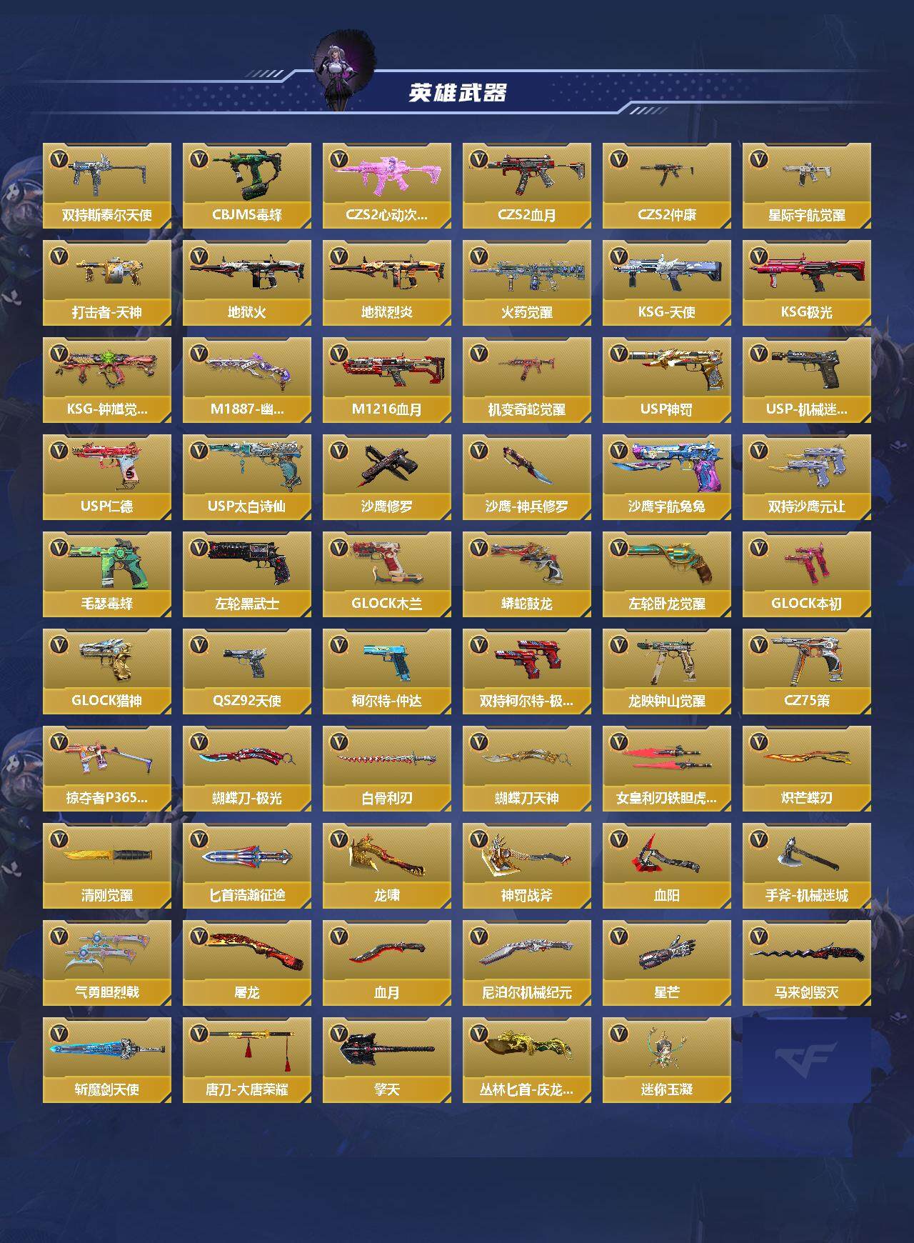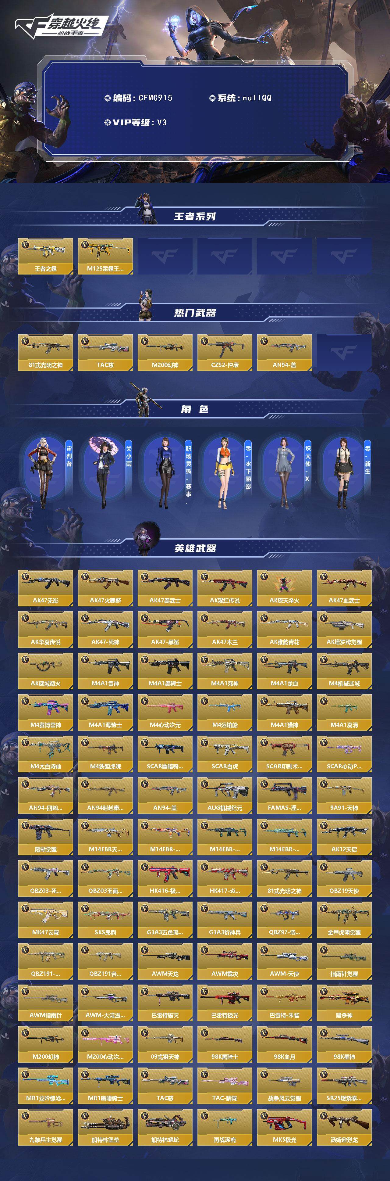 【cfmg915】vip3/292v/王者之霆/m12s-雷霆王者/81式-光明之神/tac-慈/m200-幻神/czs2-仲康/an94-盖/审判者/关小雨/职场灵狐-赛事经理/零-水下丽影/炽天使-x/零-新生/ak47-无影/ak47-火麒麟/ak47-黑武士/ak47-猩红传说/ak47-燎天净火/ak47-血武士/ak47-华夏传说/ak47-死神/ak47-黑鲨/ak47-木兰/a