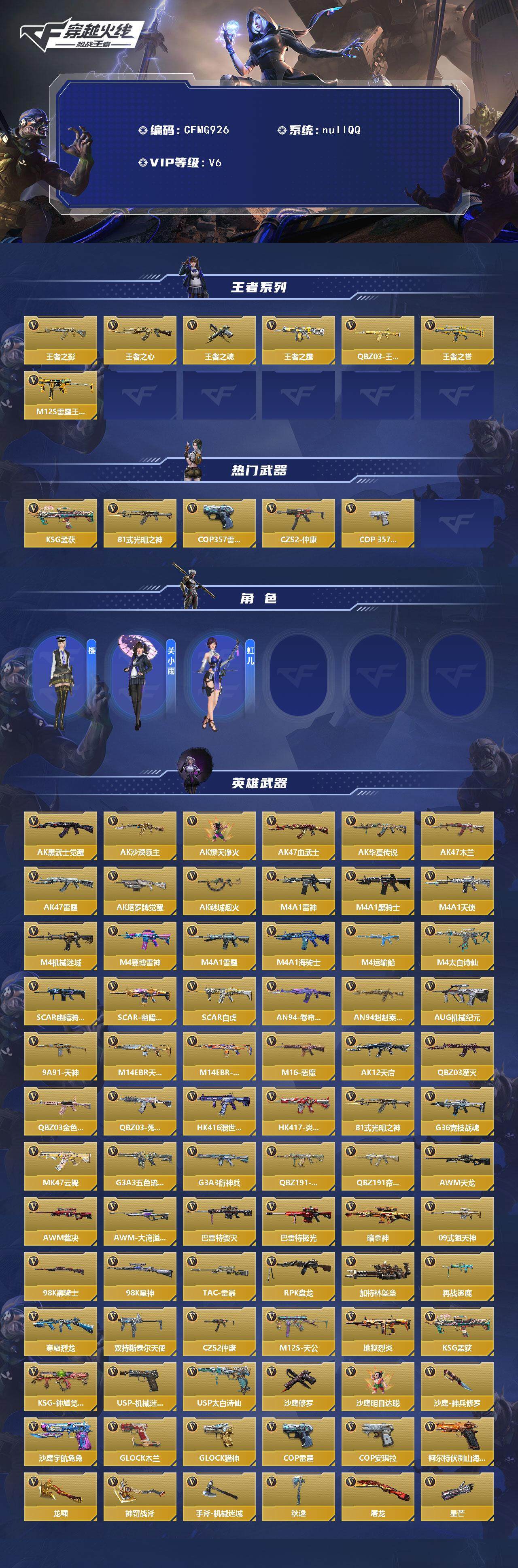 【cfmg926】vip6/142v/7王者/王者之影/王者之心/王者之魂/王者之霆/q-03-王者蔷薇/王者之誉/m12s-雷霆王者/ksg-孟获/81式-光明之神/cop357-雷霆/czs2-仲康/cop-357-安琪拉/樱/关小雨/虹儿/ak47-黑武士觉醒/ak47-沙漠领主/ak47-燎天净火/ak47-血武士/ak47-华夏传说/ak47-木兰/ak47-雷霆/ak47-塔罗