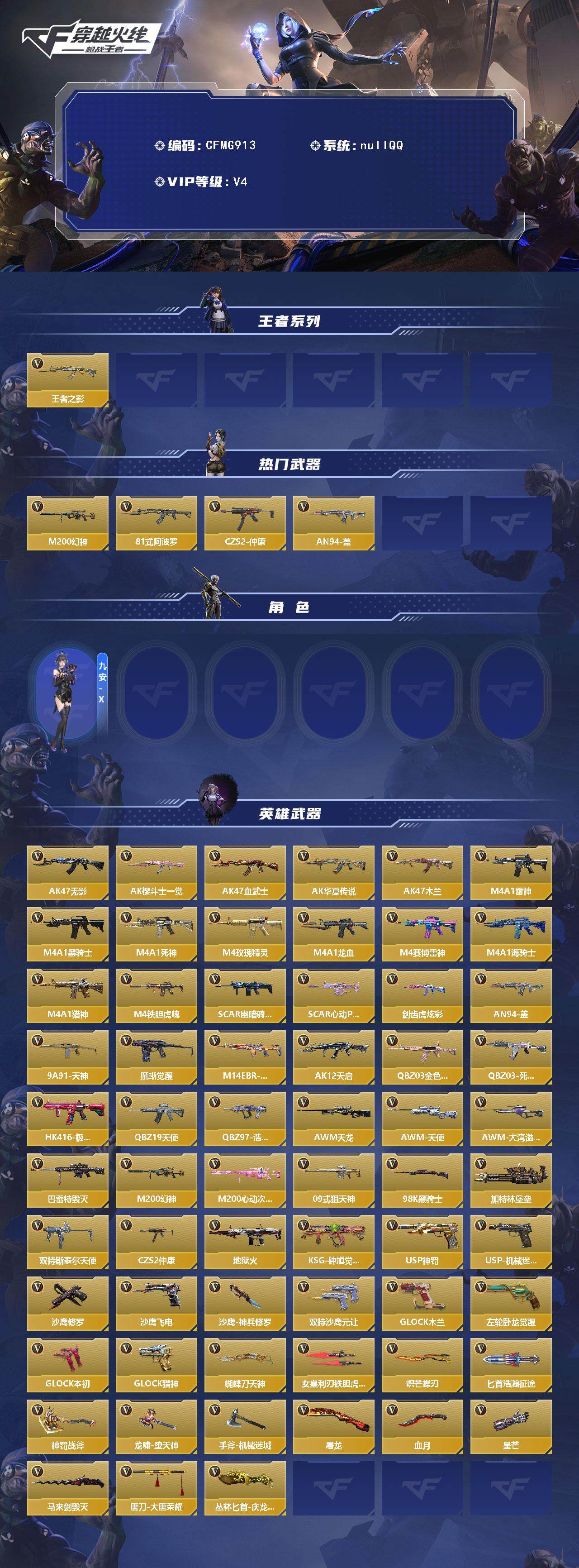 【cfmg913】vip4/135v/1王者/王者之影/m200-幻神/81式-阿波罗/czs2-仲康/an94-盖/九安-x/ak47-无影/ak47-樱斗士-一觉/ak47-血武士/ak47-华夏传说/ak47-木兰/m4a1-雷神/m4a1-黑骑士/m4a1-死神/m4a1-玫瑰精灵/m4a1-龙血/m4a1-赛博雷神/m4a1-海骑士/m4a1-猎神/m4a1-铁胆虎魄/scar-幽暗骑士/scar-心动pick/剑齿虎-炫彩/9a91-天神/9a91-魔蜥觉醒/m14ebr-拂影/ak12-天启/q03-金色蔷薇/q03-死神/hk416-极光/q19-天使/q97-浩瀚征途/awm-天龙/awm-天使/awm-大湾溢彩/芭蕾特-毁灭/m200-心动次元/09式狙-天神/98k-黑骑士/加特林-堡垒/双持斯泰尔-天使/地狱火/ksg-钟馗觉醒/usp-神罚/usp-机械迷城/沙鹰-修罗/沙鹰-飞电/沙鹰-神兵修罗/双持沙鹰-元让/改装glock-木兰/左轮-卧龙觉醒/双持glock18-本初/glock18-猎神/蝴蝶刀-天神/女皇利刃-铁胆虎魄/炽芒蝶刃/匕首-浩瀚征途/神罚战斧/龙啸-堕天神/手斧-机械迷城/屠龙/血月/太白诗仙扇/星芒/马来剑-毁灭/唐刀-大唐荣耀/丛林匕首-庆龙觉醒