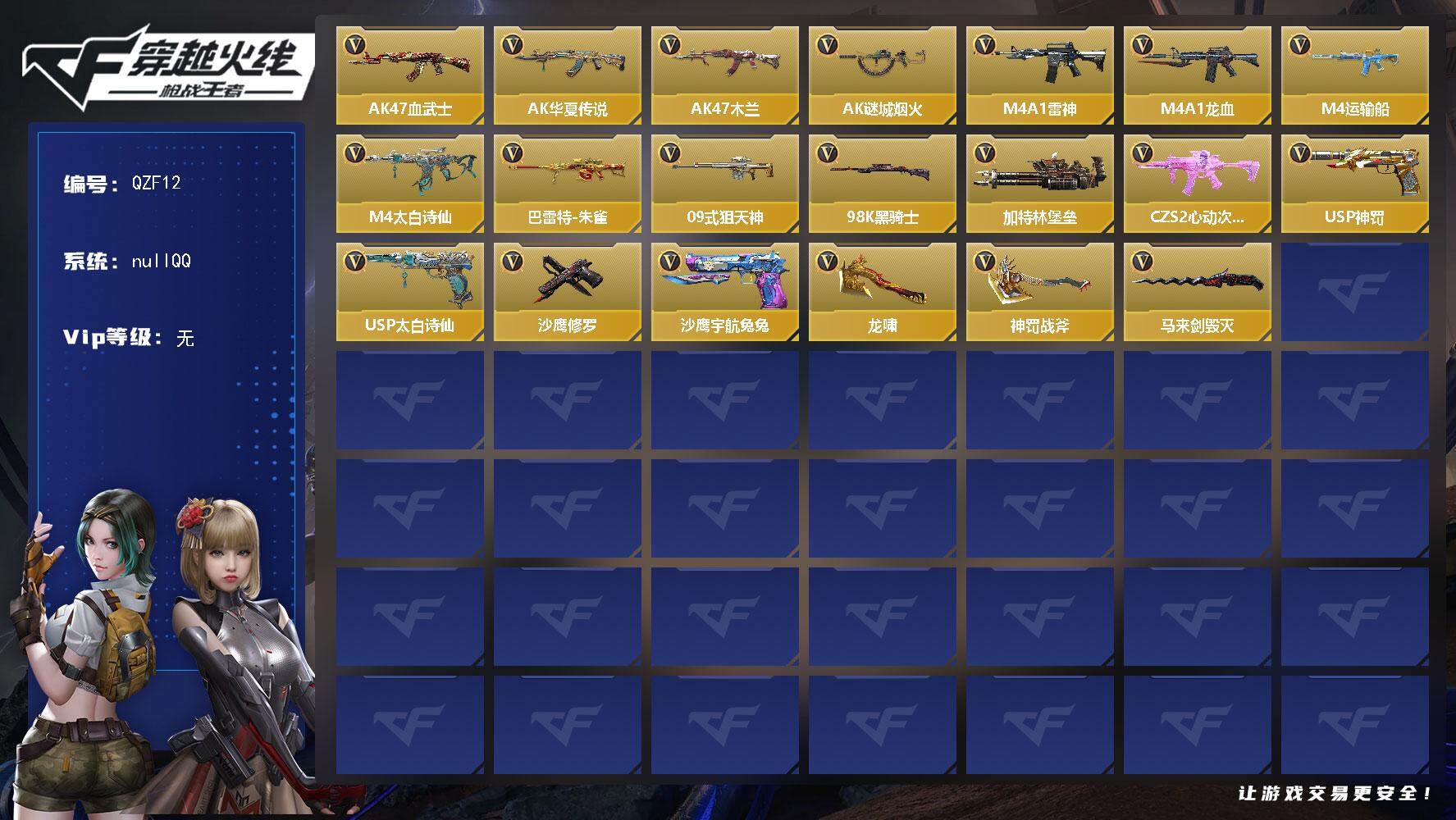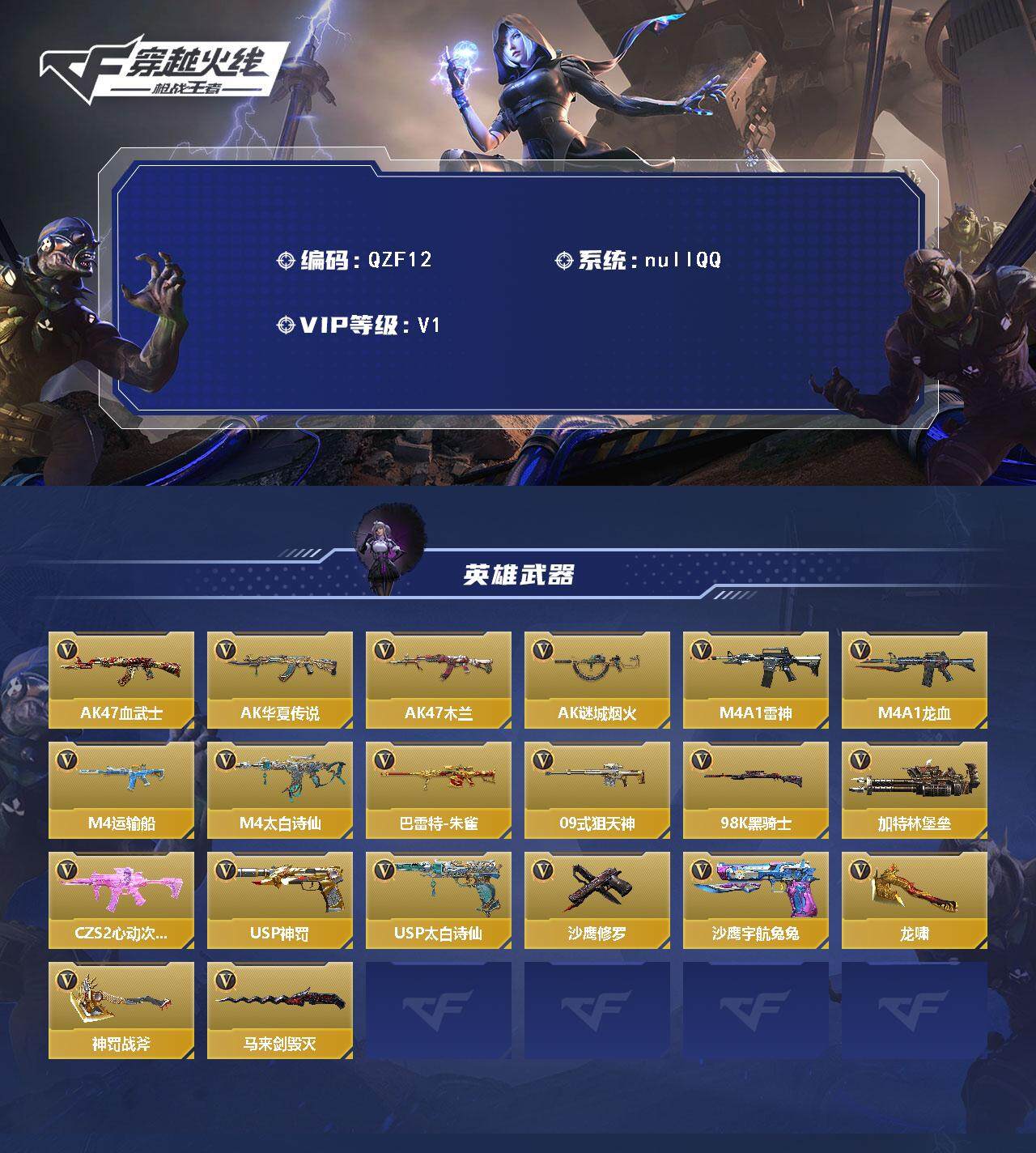 【qzf12】vip1/30v/ak47-血武士/ak47-华夏传说/ak47-木兰/ak47-谜城烟火/m4a1-雷神/m4a1-龙血/m4a1-运输船/m4a1-太白诗仙/芭蕾特-朱雀/09式狙-天神/98k-黑骑士/加特林-堡垒/czs2-心动次元/usp-神罚/usp-太白诗仙/沙鹰-修罗/沙鹰-宇航兔兔/龙啸/神罚战斧/太白诗仙扇/马来剑-毁灭