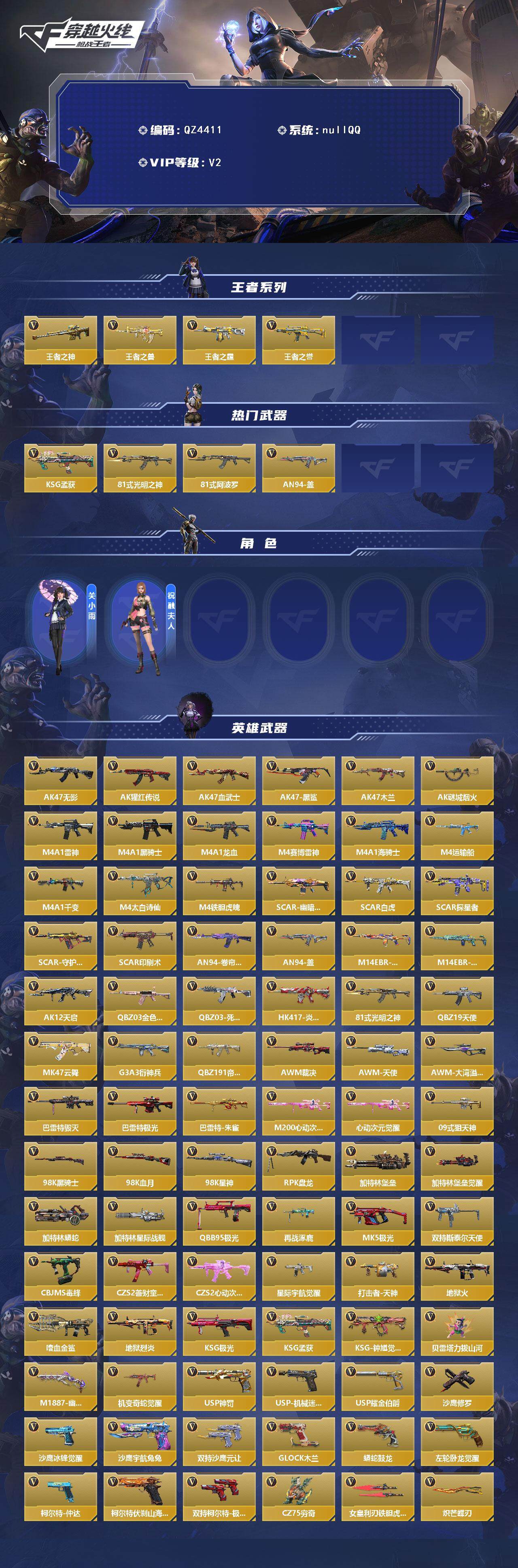 【qz4411】vip2/197v/王者之神/王者之兽/王者之霆/王者之誉/ksg-孟获/81式-光明之神/81式-阿波罗/an94-盖/关小雨/祝融夫人/ak47-无影/ak47-猩红传说/ak47-血武士/ak47-黑鲨/ak47-木兰/ak47-谜城烟火/m4a1-雷神/m4a1-黑骑士/m4a1-龙血/m4a1-赛博雷神/m4a1-海骑士/m4a1-运输船/m4a1-千变/m4a1-太白诗仙/m4a1-铁胆虎魄/scar-幽暗骑士觉醒/scar light-白虎/scar-探星者/scar-守护者觉醒/scar-印刷术/an94-卷帘大将军/m14ebr-拂影/m14ebr-葫芦山庄/ak12-天启/q03-金色蔷薇/q03-死神/hk417-炎龙铠甲/q19-天使/mk47-云舞/g3a3-衍神兵/q191-帝皇铠甲/awm-裁决/awm-天使/awm-大湾溢彩/芭蕾特-毁灭/芭蕾特-极光/芭蕾特-朱雀/m200-心动次元/m200-心动次元觉醒/09式狙-天神/98k-黑骑士/98k-血月/98k-星神/rpk-盘龙/加特林-堡垒/加特林-堡垒觉醒/加特林-蟒蛇/加特林-星际战舰/qbb95-极光/qbb95-再战涿鹿/mk5-极光/双持斯泰尔-天使/cbj-ms-毒蜂/czs2-善财童子/czs2-心动次元/ddm4-pdw-星际宇航觉醒/打击者-天神/地狱火/嗜血金鲨/地狱烈炎/ksg-极光/ksg-钟馗觉醒/贝雷塔-力拔山河/m1887-幽冥玄喵觉醒/igin12-机变奇蛇觉醒/usp-神罚/usp-机械迷城/usp-耀金伯爵/沙鹰-修罗/沙鹰-冰锋觉醒/沙鹰-宇航兔兔/双持沙鹰-元让/改装glock-木兰/蟒蛇-鼓龙/左轮-卧龙觉醒/柯尔特-仲达/柯尔特-伏刹山海觉醒/双持柯尔特-极光/cz75-穷奇/女皇利刃-铁胆虎魄/炽芒蝶刃/龙啸/神罚战斧/血阳/手斧-机械迷城/刑天战斧/屠龙/麒麟刺/星芒/马来剑-毁灭/唐刀-大唐荣耀/擎天/迷你饕餮/末日裁决觉醒