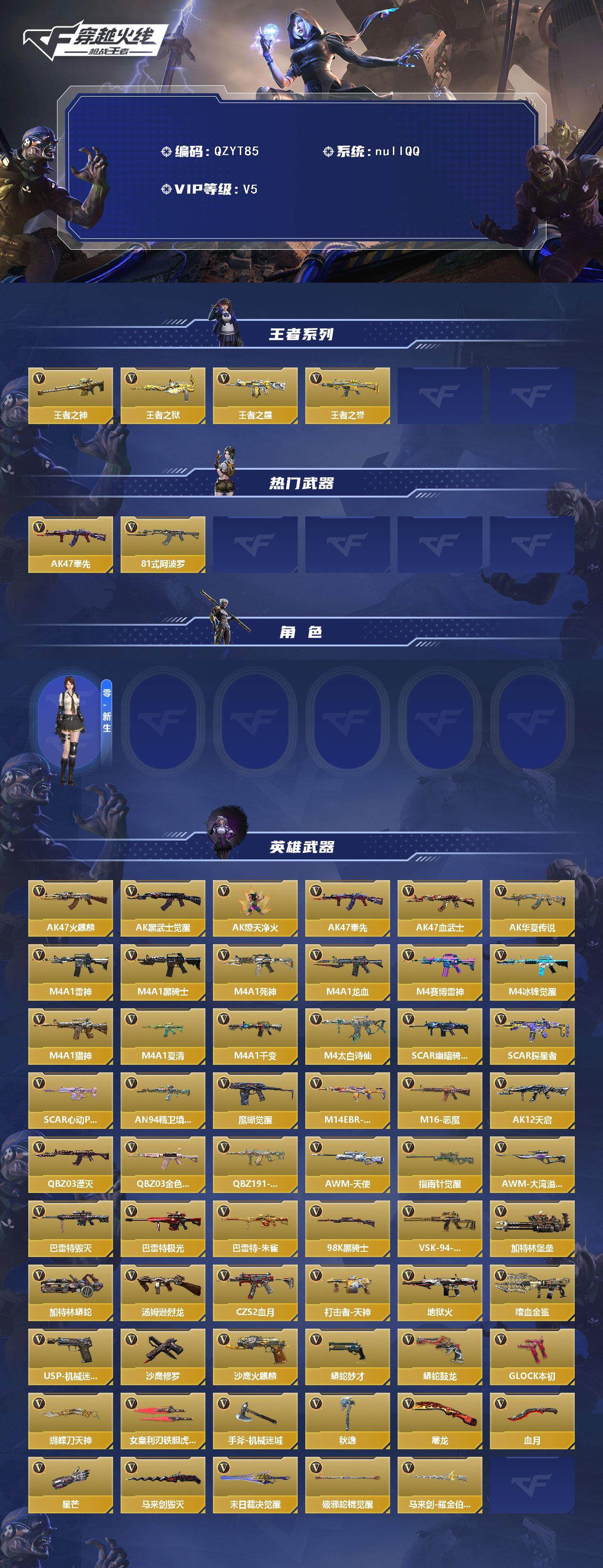 【qzyt85】vip5/130v/王者之神/王者之狱/王者之霆/王者之誉/ak47-奉先/81式-阿波罗/零-新生/ak47-火麒麟/ak47-黑武士觉醒/ak47-燎天净火/ak47-血武士/ak47-华夏传说/m4a1-雷神/m4a1-黑骑士/m4a1-死神/m4a1-龙血/m4a1-赛博雷神/m4a1-冰锋觉醒/m4a1-猎神/m4a1-夏清/m4a1-千变/m4a1-太白诗仙/sca